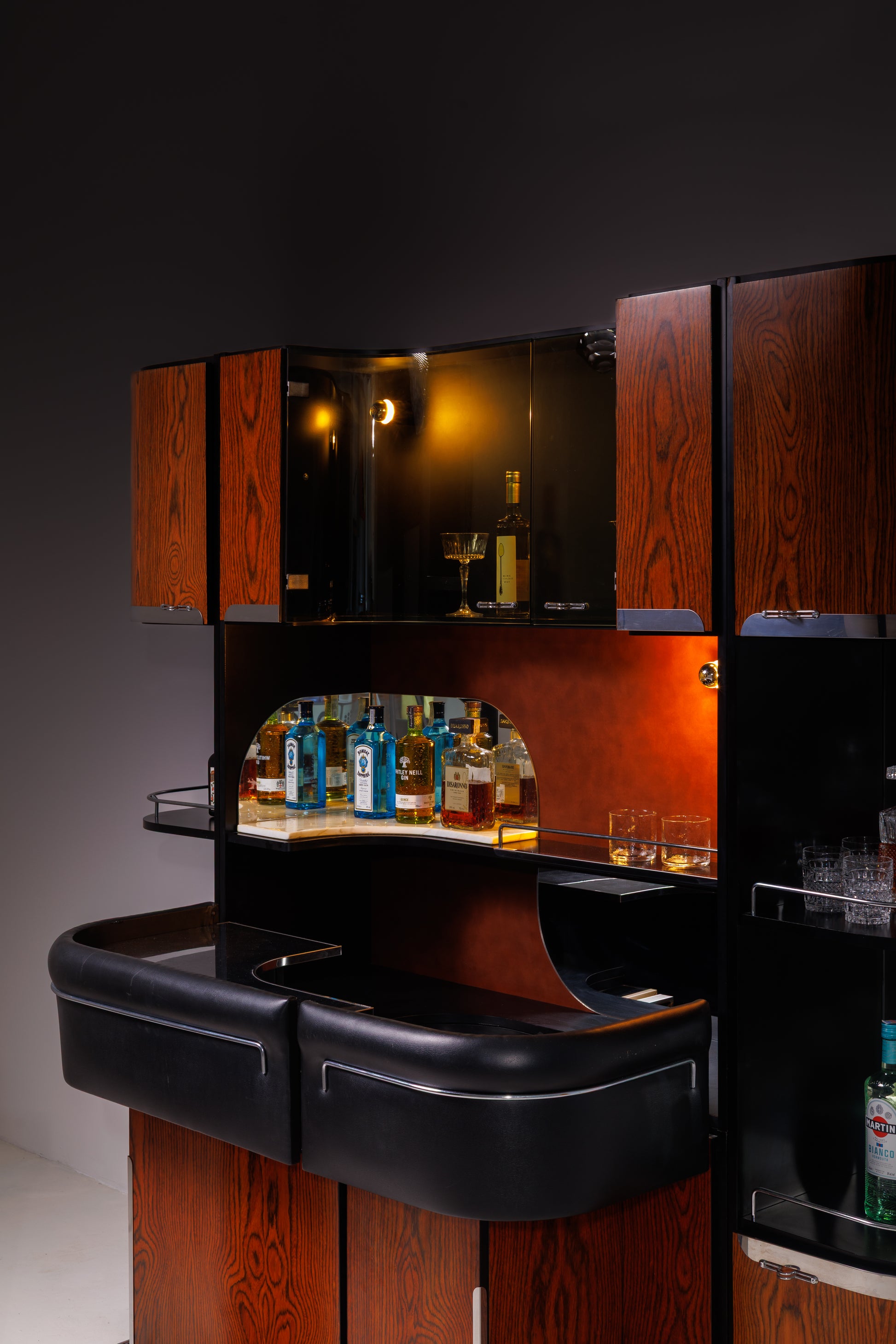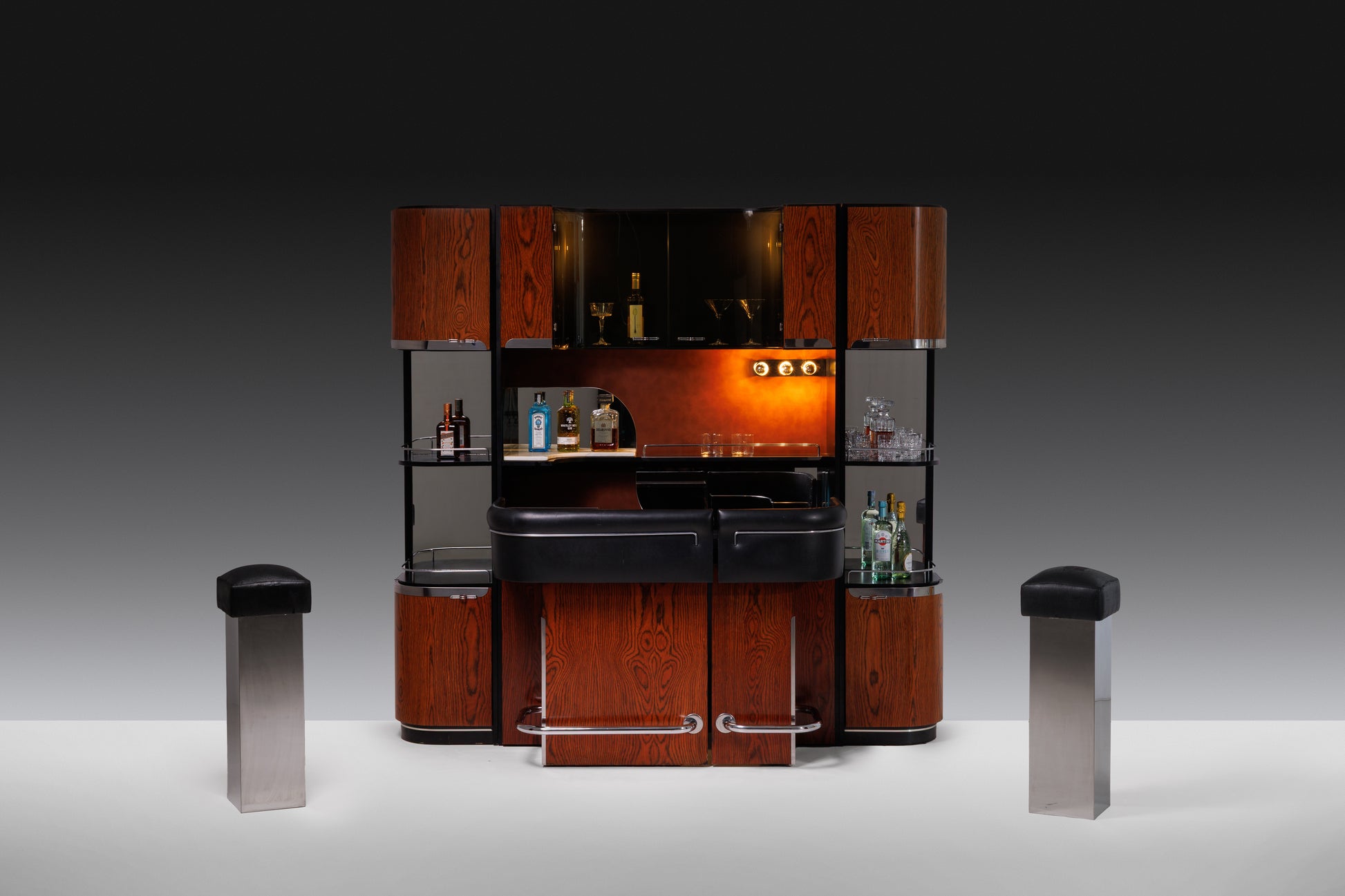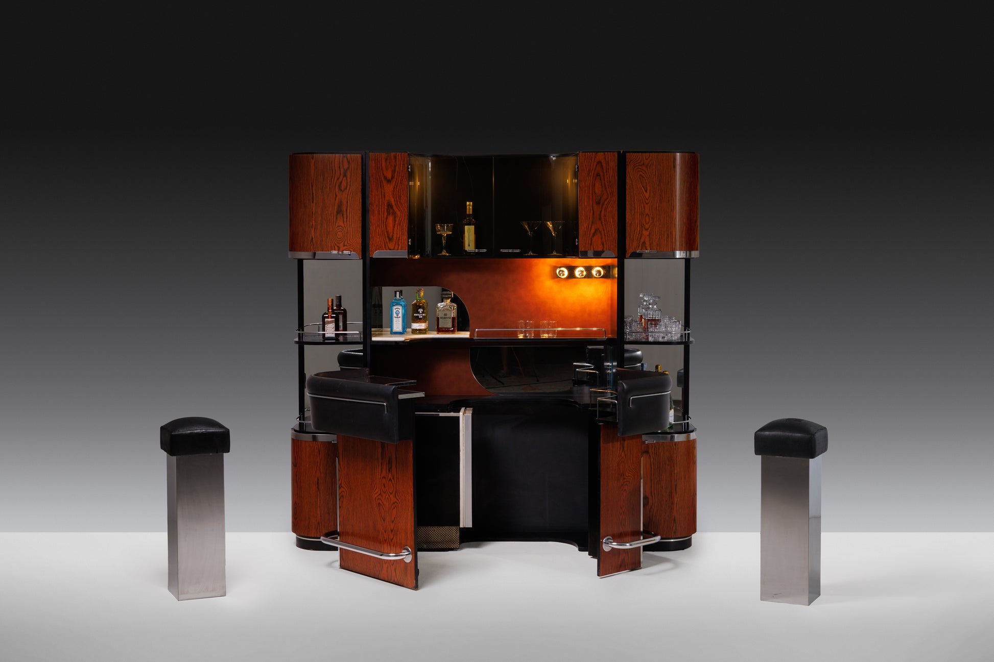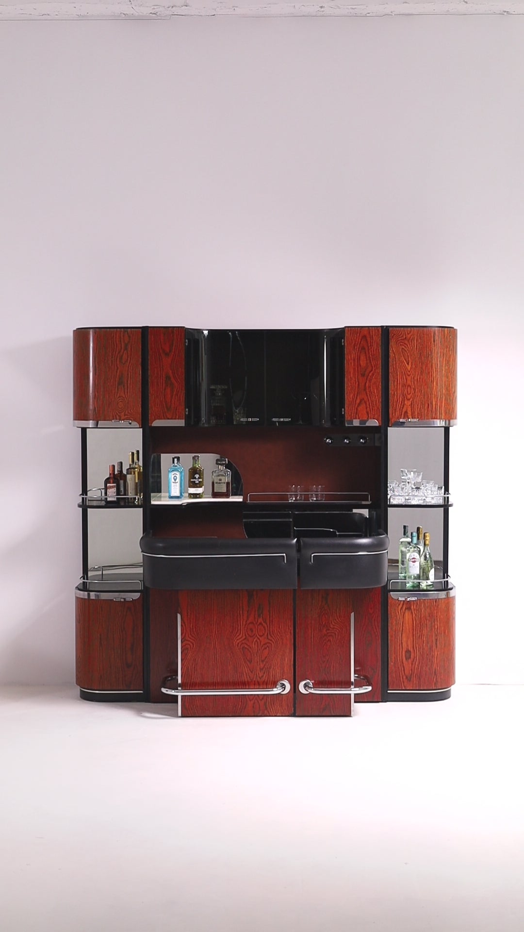 A striking mid-century bar cabinet that blends sculptural design with everyday functionality. Crafted in richly grained rosewood veneer, it features curved doors, sleek black lacquered details, and polished chrome accents. The central bar counter is fronted with padded black leather panels, while open glass shelving on each side provides space for bottles and glassware. A warm interior light highlights the display, transforming the piece into both a functional cocktail station and a statement centerpiece. Minimalist steel-and-leather stools complete the ensemble, echoing its bold mix of materials.