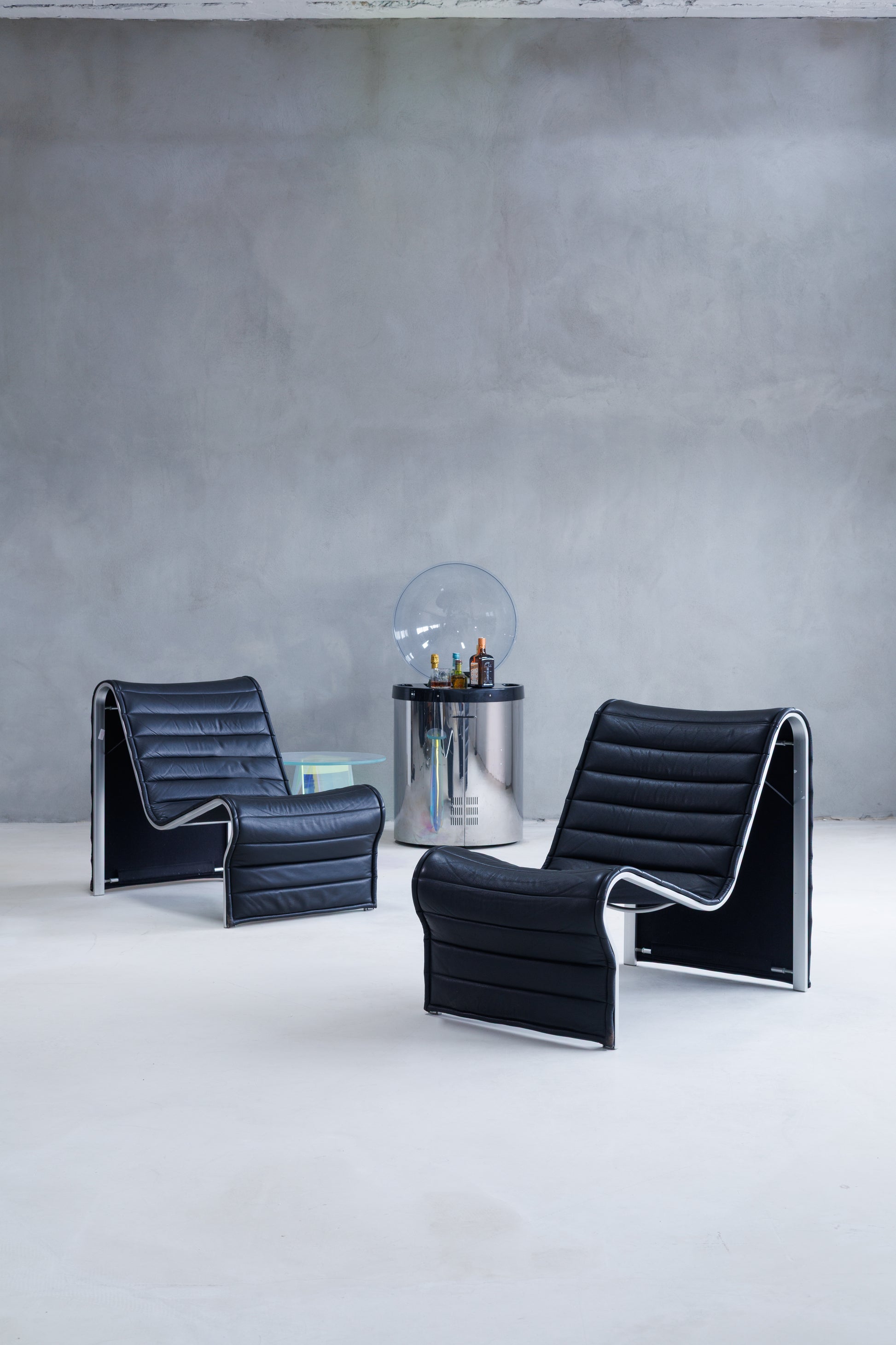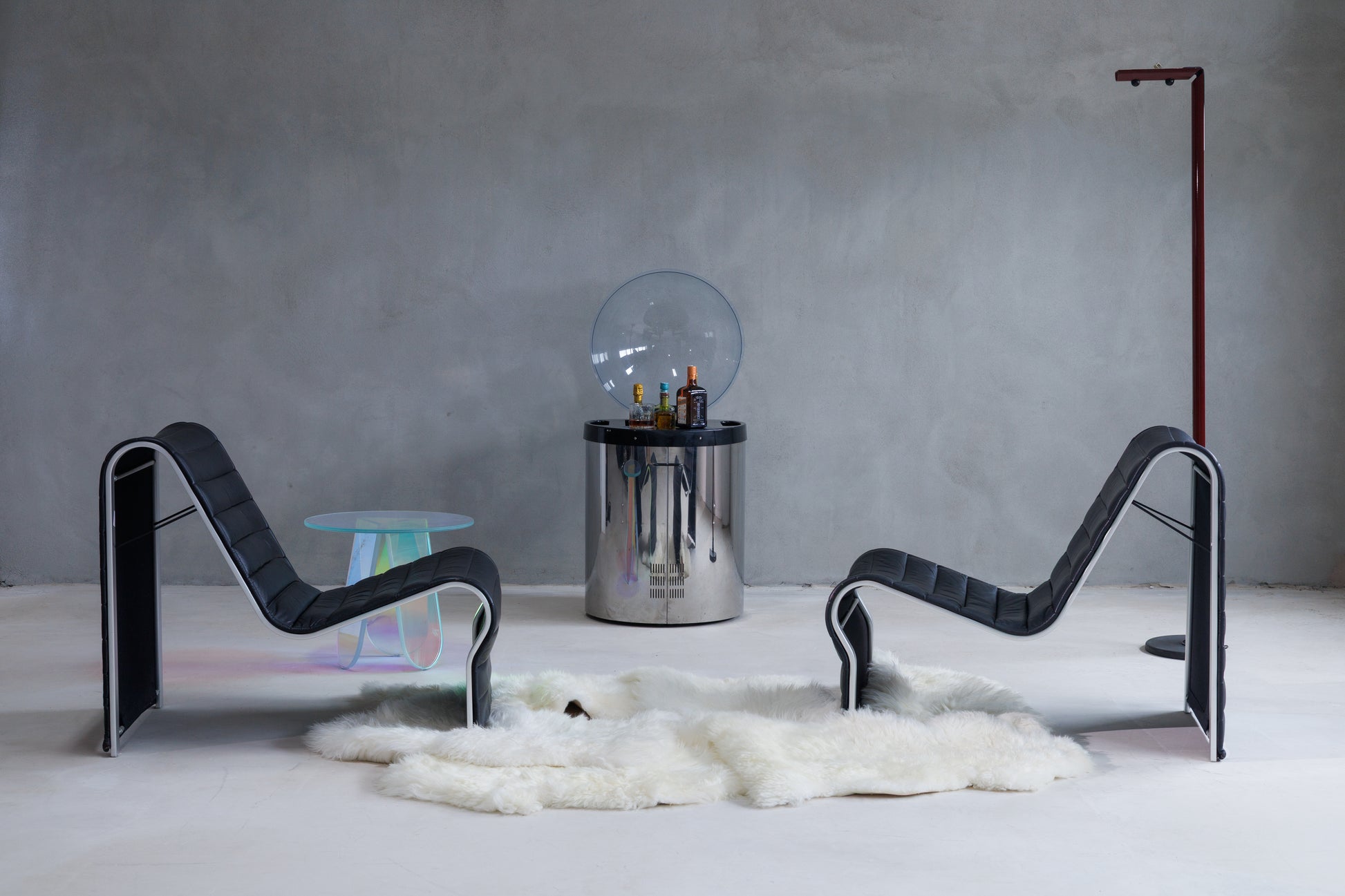 Designed in the late 1960s–70s, this rare pair of lounge chairs, nicknamed “Bond James Bond,” reflects the era’s fascination with sleek futurism and cinematic glamour. The nickname comes from their daring, wave-like silhouette in polished aluminum and black leather which was a look that echoed the sophistication, confidence, and modern edge associated with the James Bond aesthetic of the 1960s.