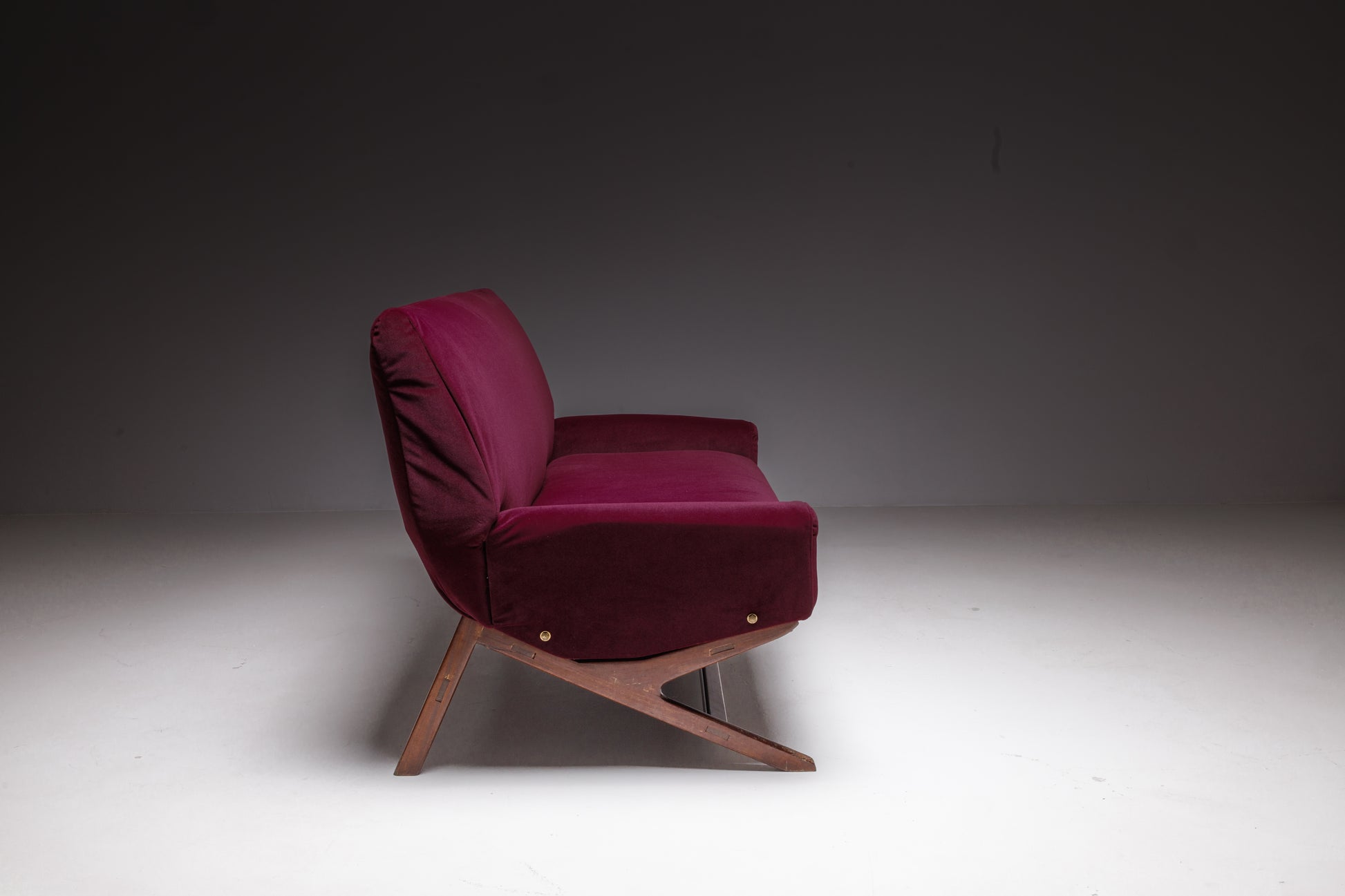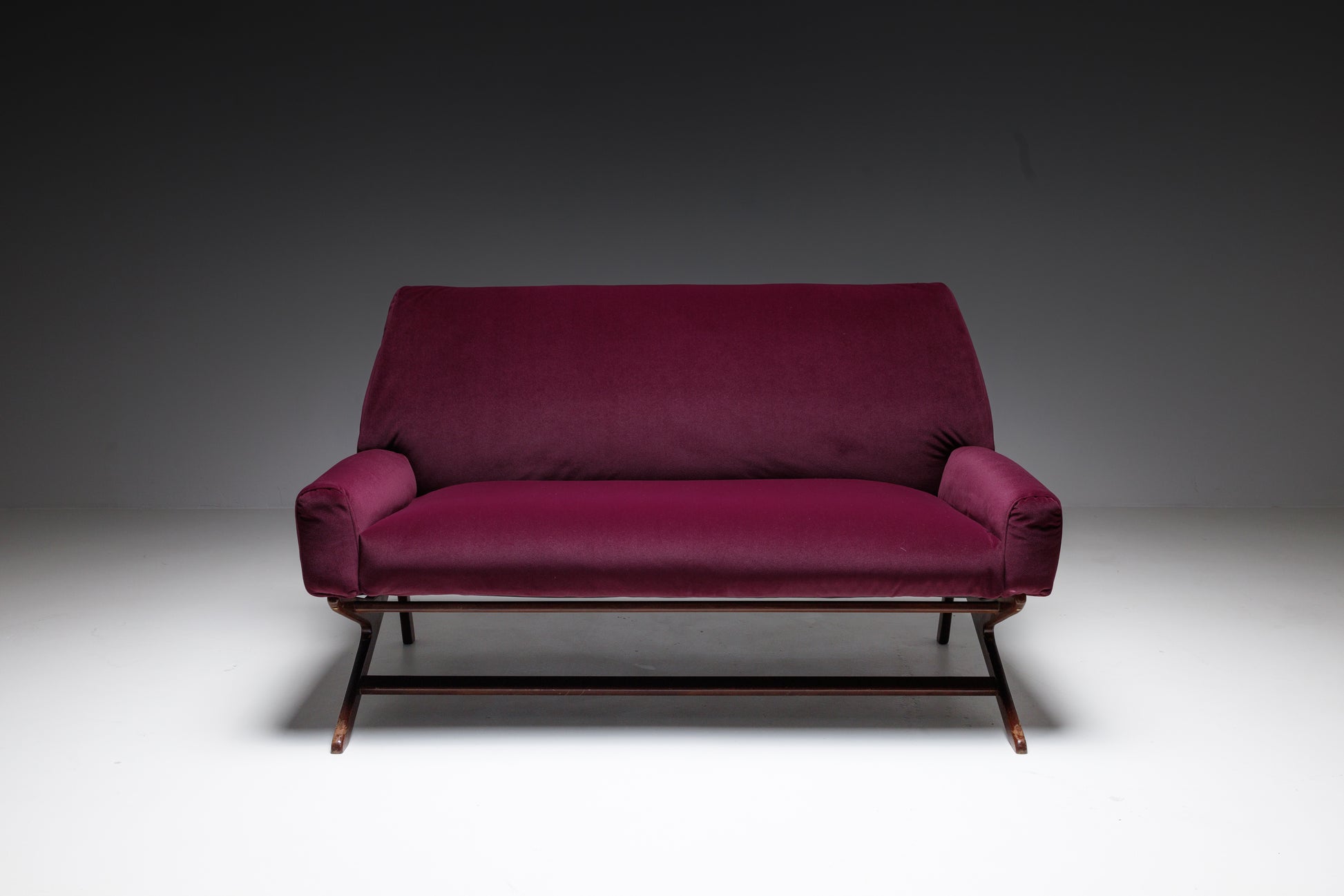 Wrapped in sumptuous burgundy velvet, this mid-century modern two-seater balances bold presence with understated sophistication. Its gently sloped armrests and sleek wood base create a refined silhouette, while the freshly reupholstered fabric gives it a fresh and inviting look.