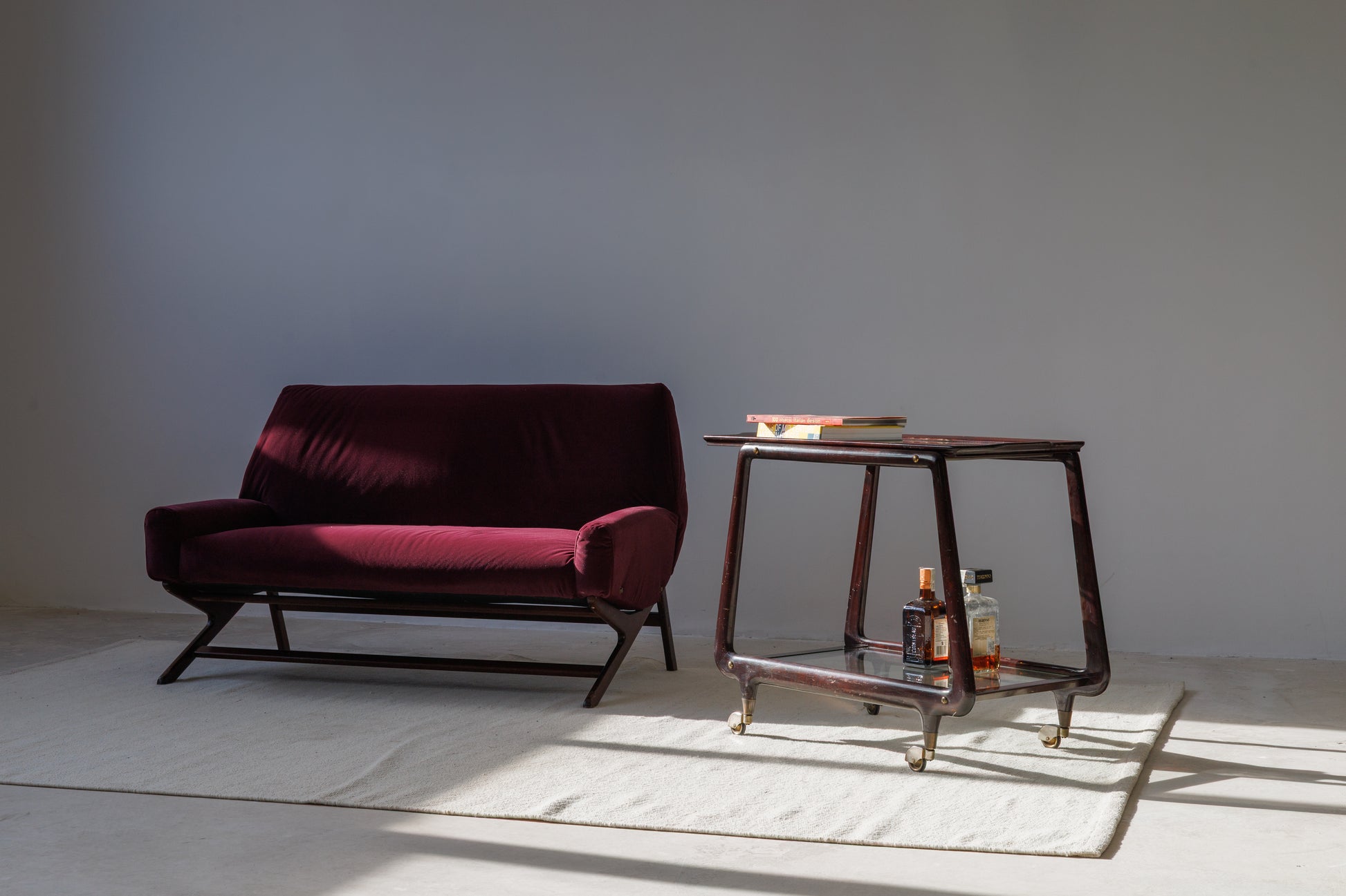 The trolley rests on small brass casters, allowing it to move effortlessly. This mobility, combined with the clean architectural silhouette, reflects the modernist approach to furniture as both practical and visually balanced.