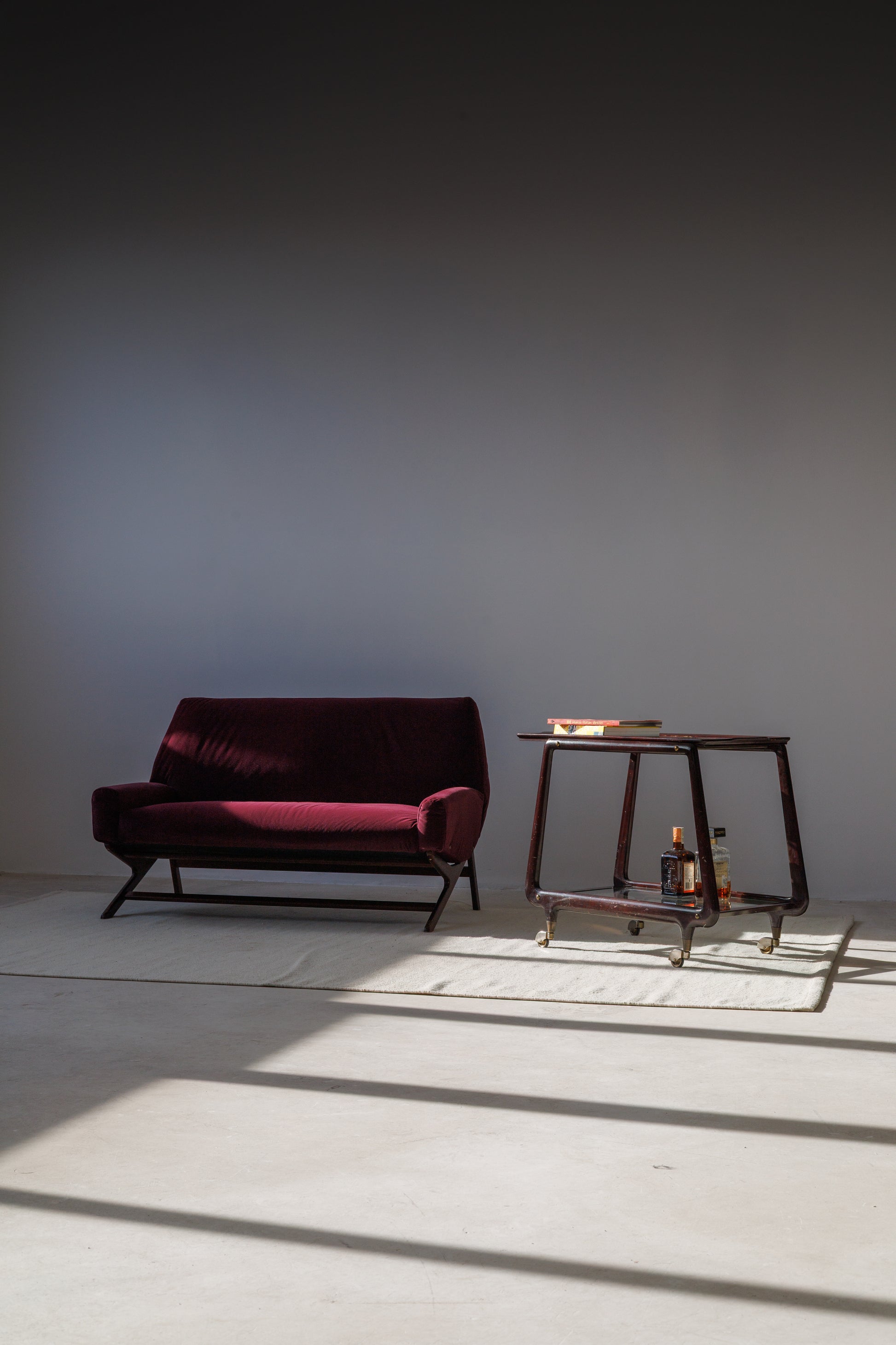 A refined Italian modernist bar trolley, characterized by its sculptural frame and elegant combination of materials. The structure is formed from bent tubular metal finished in a deep lacquered tone, creating a continuous geometric outline that gives the piece both strength and visual fluidity.