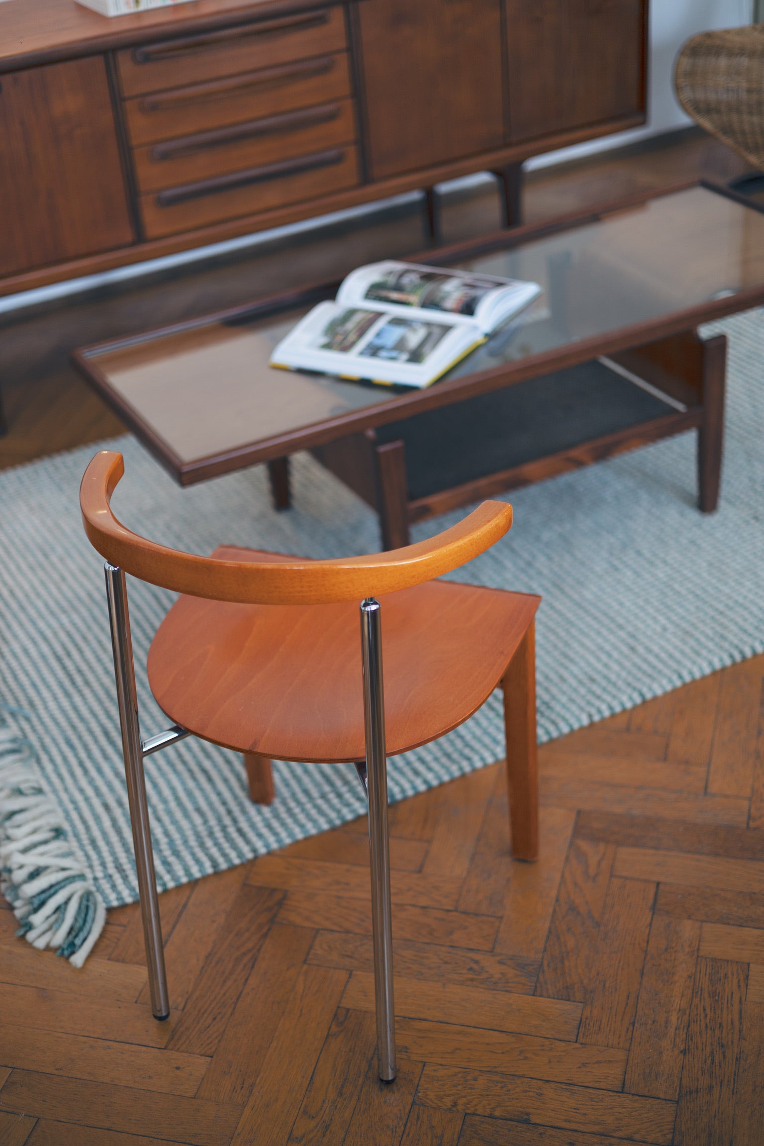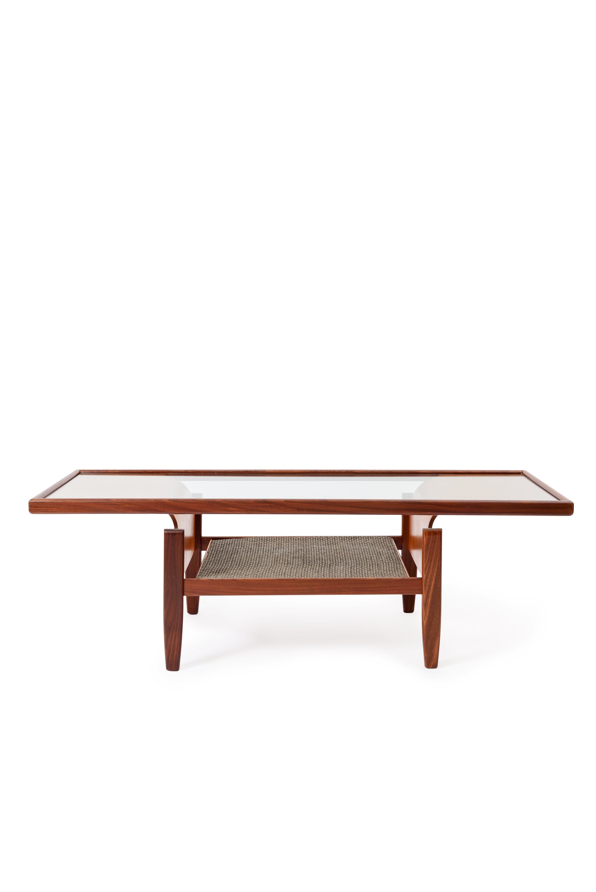 Mid-century coffee table surprises with a wonderful wood bent and a pleasant geometrical symmetry.
