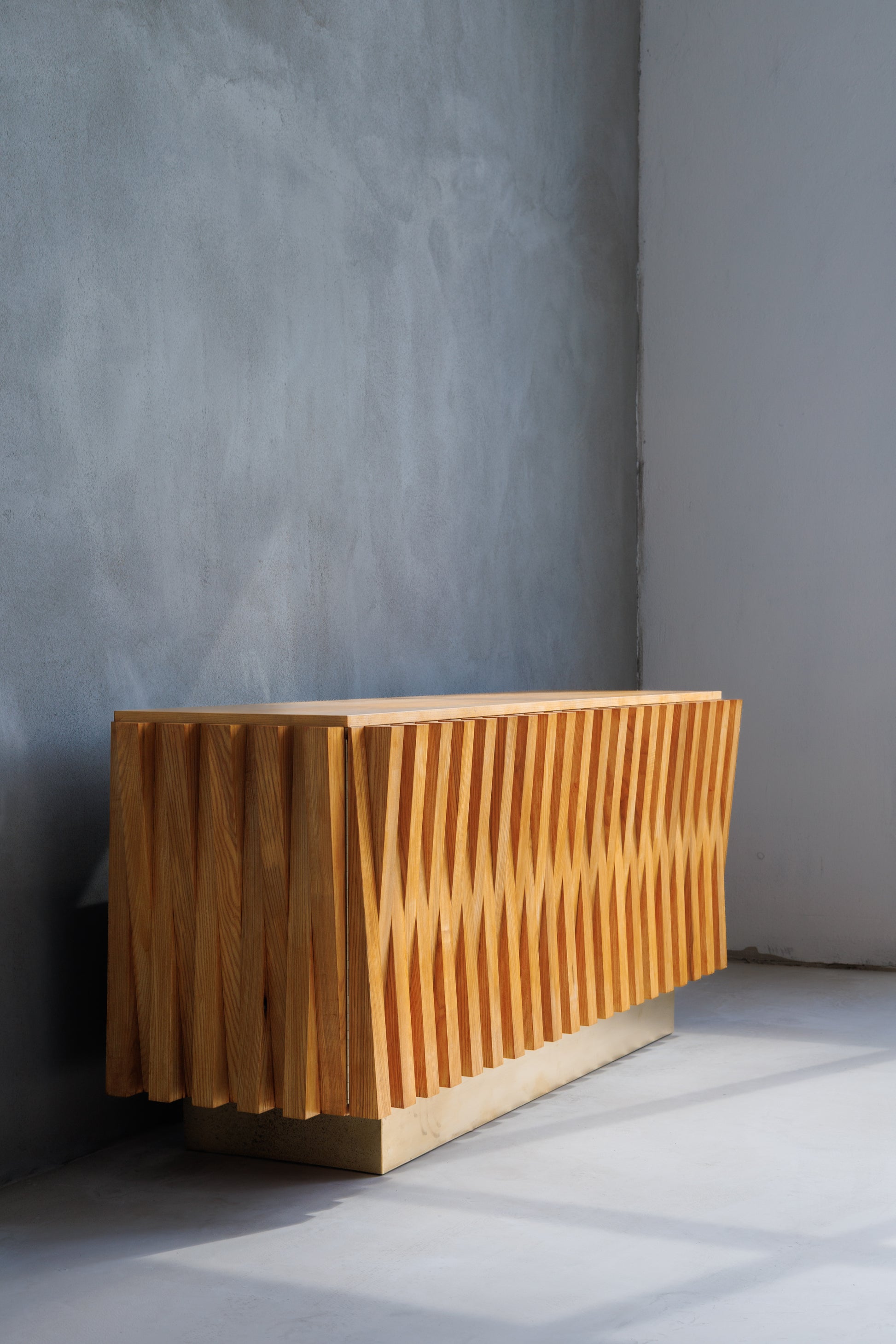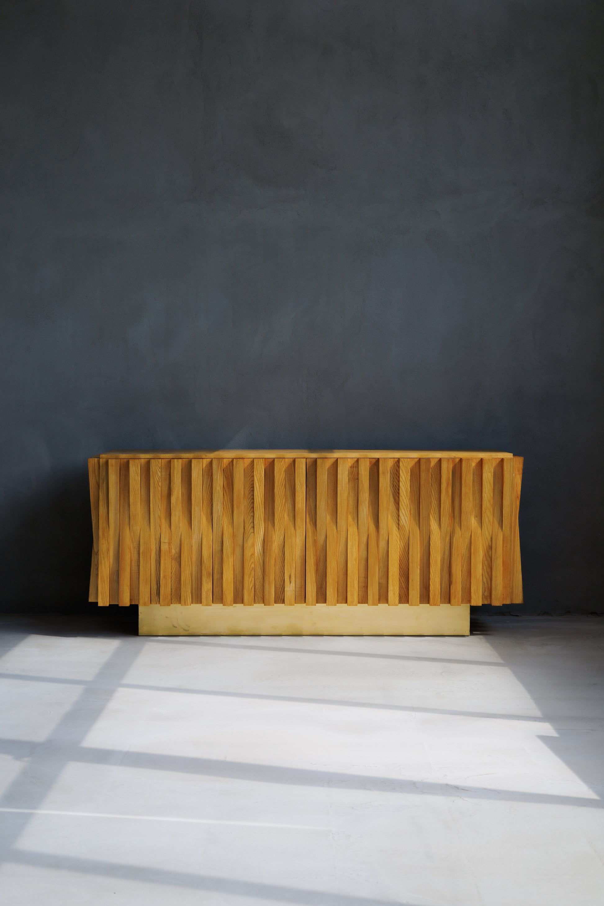 Crafted from solid oakwood, the sideboard features a bold, three-dimensional façade with hand-carved vertical waves, creating dynamic light play and tactile depth. It rests on a polished brass plinth base, offering a refined contrast to the warmth of the wood and adding a subtle note of modernist luxury.