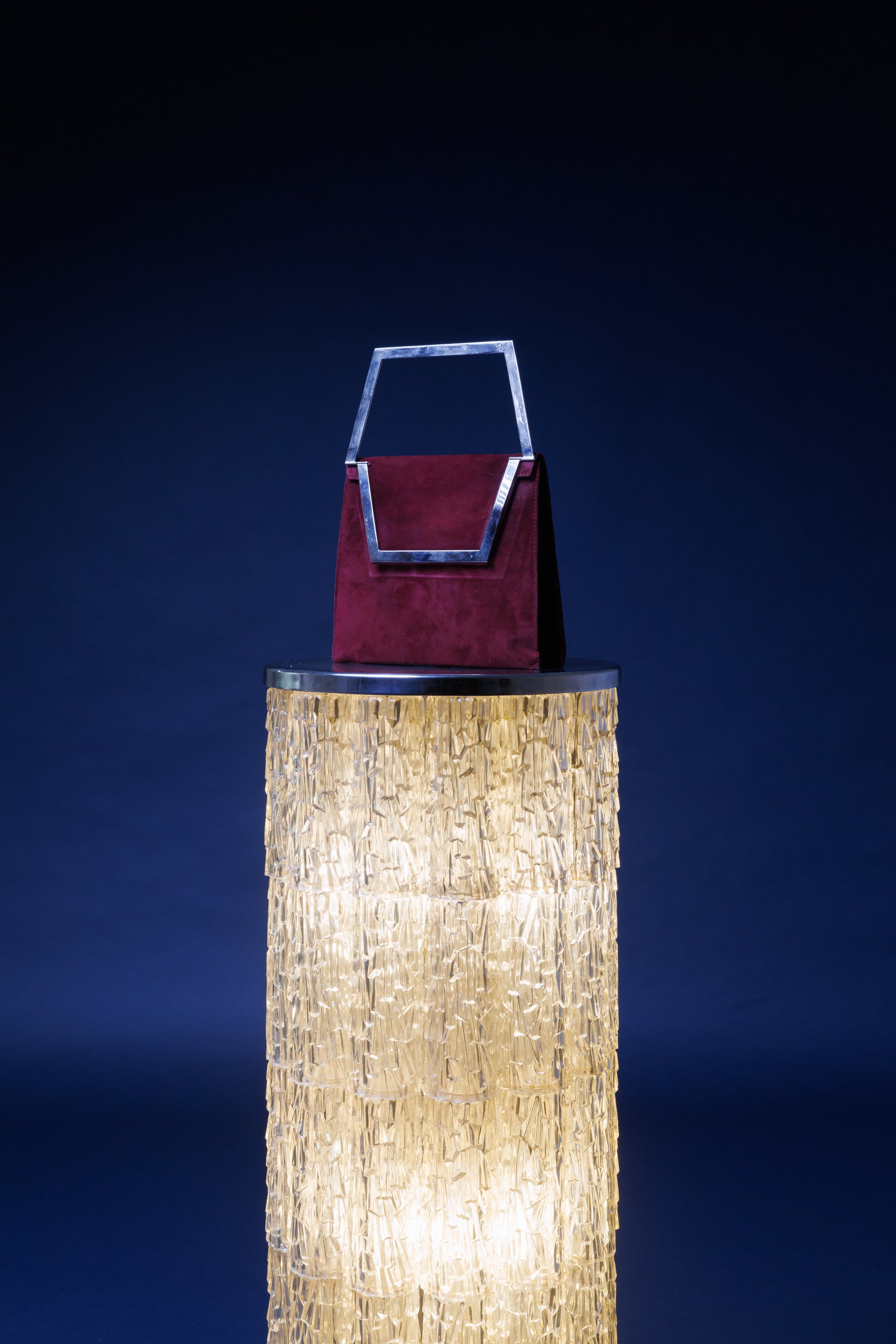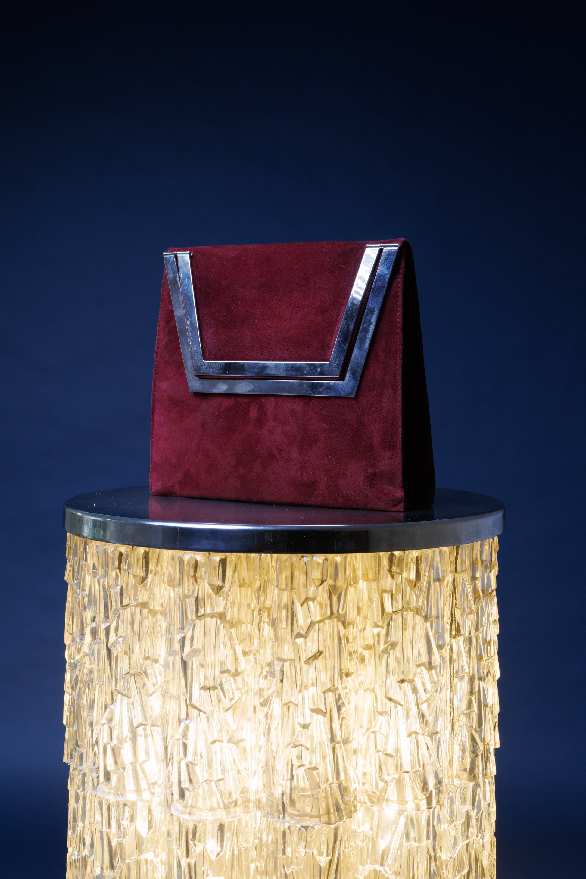 A striking vintage Pierre Cardin clutch from the 1970s, crafted in luxurious burgundy suede leather. The structured silhouette is accented by bold geometric silver-tone metal detailing, reflecting Cardin’s signature futuristic and avant-garde design aesthetic. A rare collectible piece that seamlessly blends elegance with a statement edge.