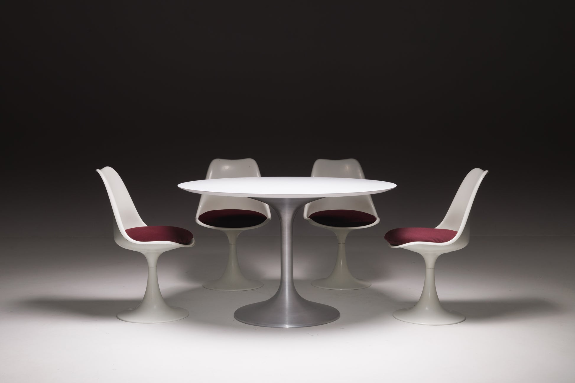 The smooth, white tabletop enhances its minimalist elegance, offering a versatile surface that complements a variety of interior styles. Designed with both form and function in mind, this table has industrial influence and an elegant approach to design.