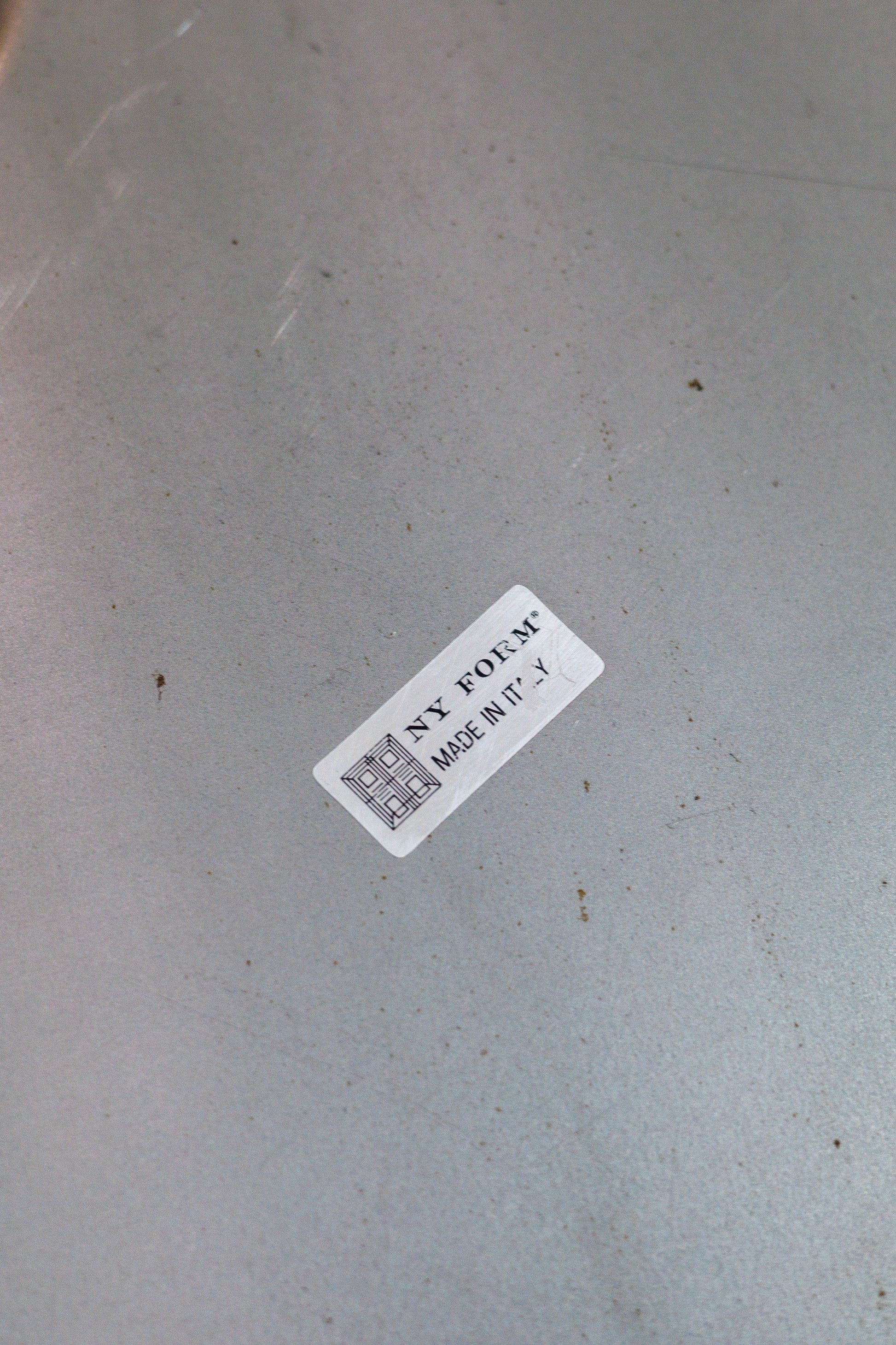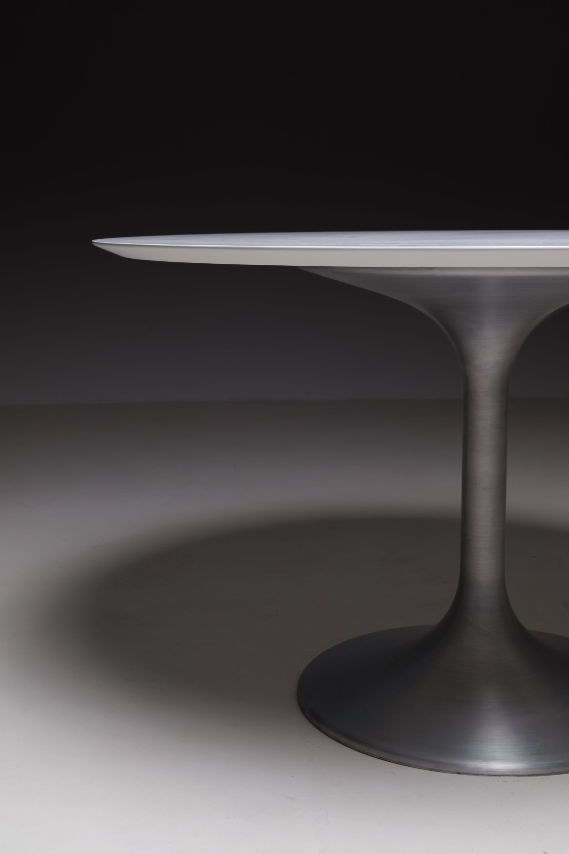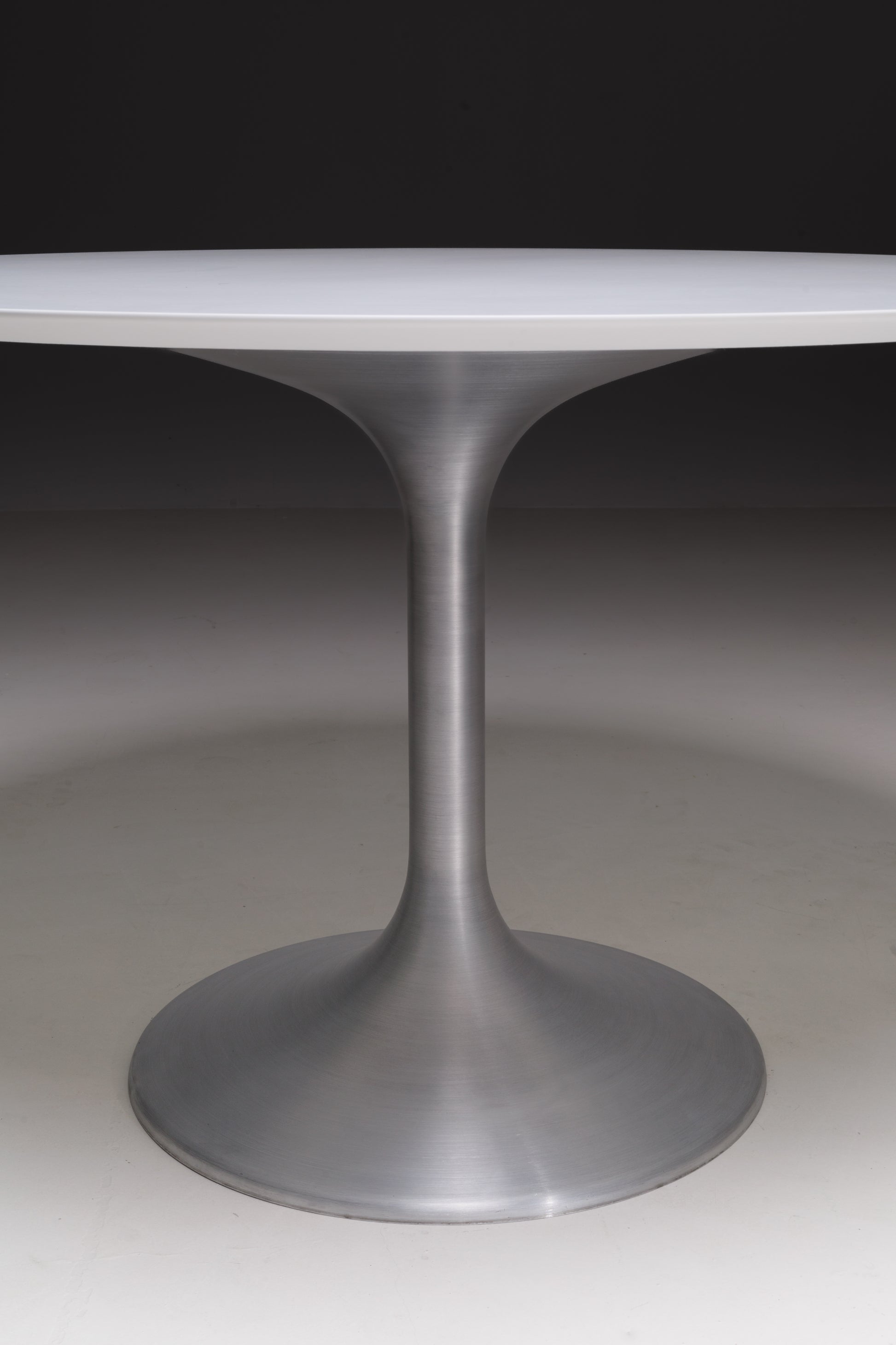 This sleek pedestal dining table, produced by NY Form in New York, is a striking example of postmodern design. Its sculptural base, crafted from brushed metal, provides both stability and a visually fluid aesthetic, eliminating the need for traditional table legs.