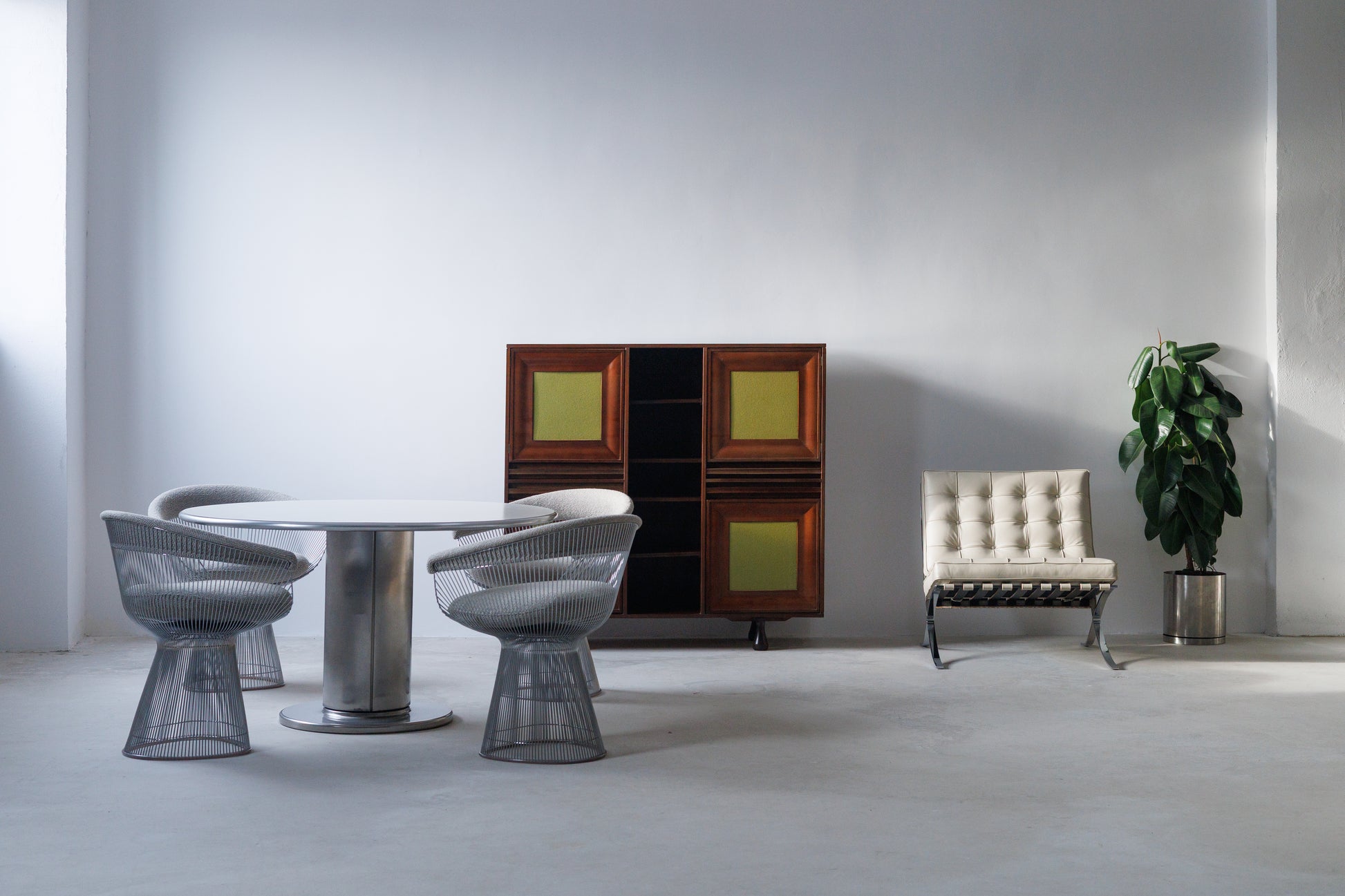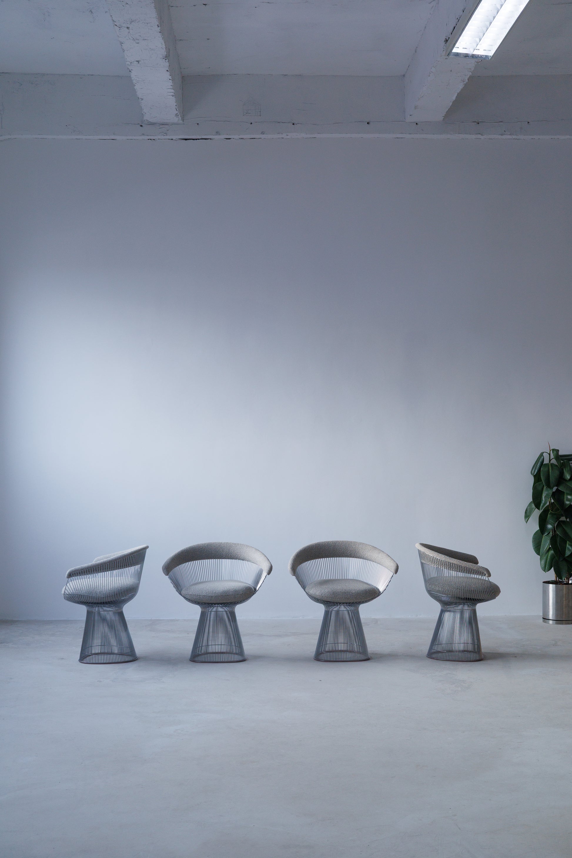 Designed by Warren Platner in 1966, the Platner armchair is one of the most recognizable silhouettes of mid-century modern design. This set of four chairs embodies the designer’s vision of merging decorative elegance with structural clarity, resulting in a form that feels both sculptural and inviting.