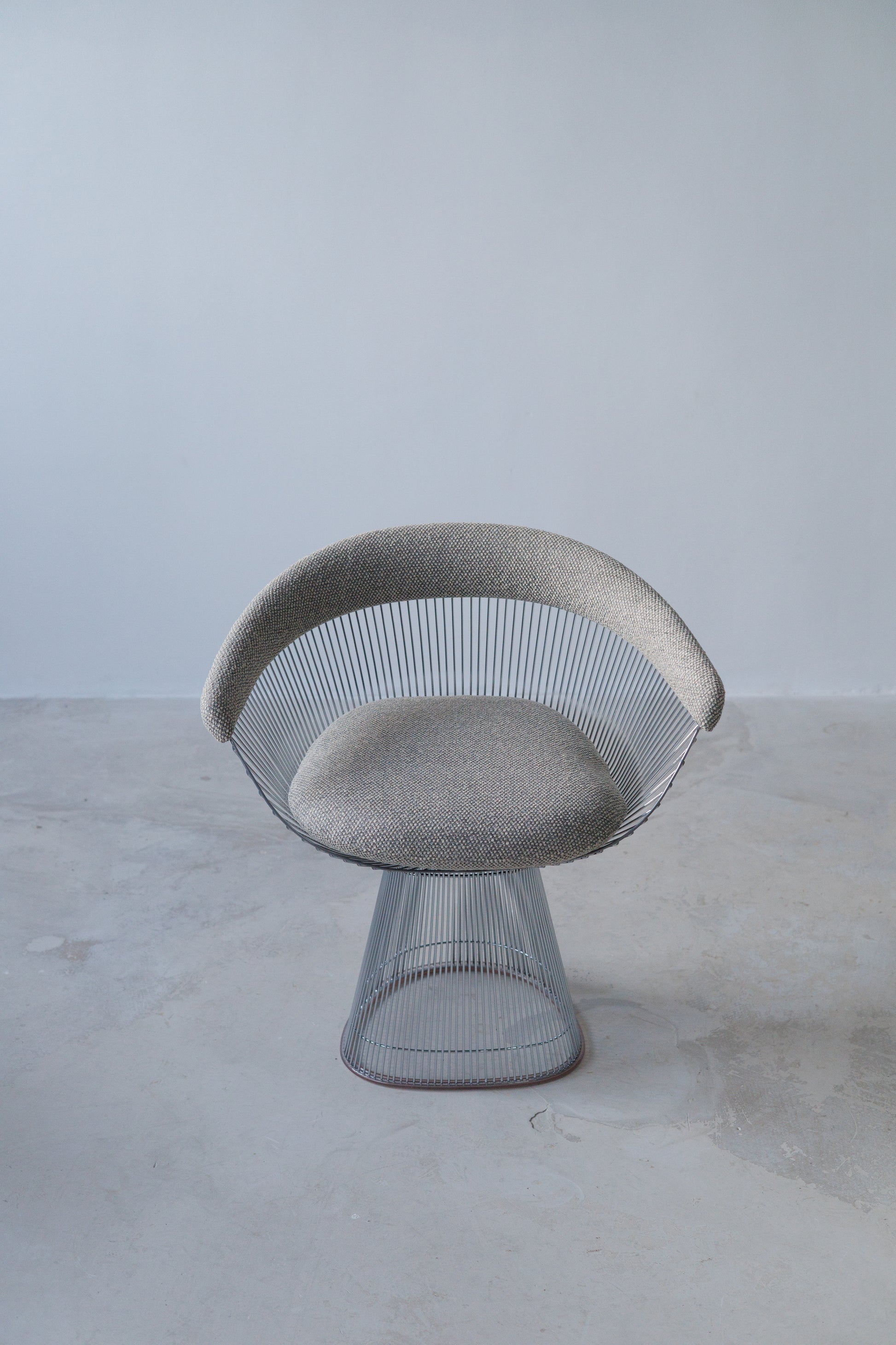 Each chair features Platner’s signature steel wire base, meticulously welded into a rhythmic vertical pattern that creates a light, almost transparent presence despite the strength of the material. The curved backrest gently wraps around the sitter, offering both visual softness and ergonomic support. Upholstered in a refined wool textile in a pastel, creamy tone, the chairs bring warmth and tactility to the architectural precision of the metal structure. The color enhances their versatility, allowing them to integrate effortlessly into both contemporary and classic interiors.