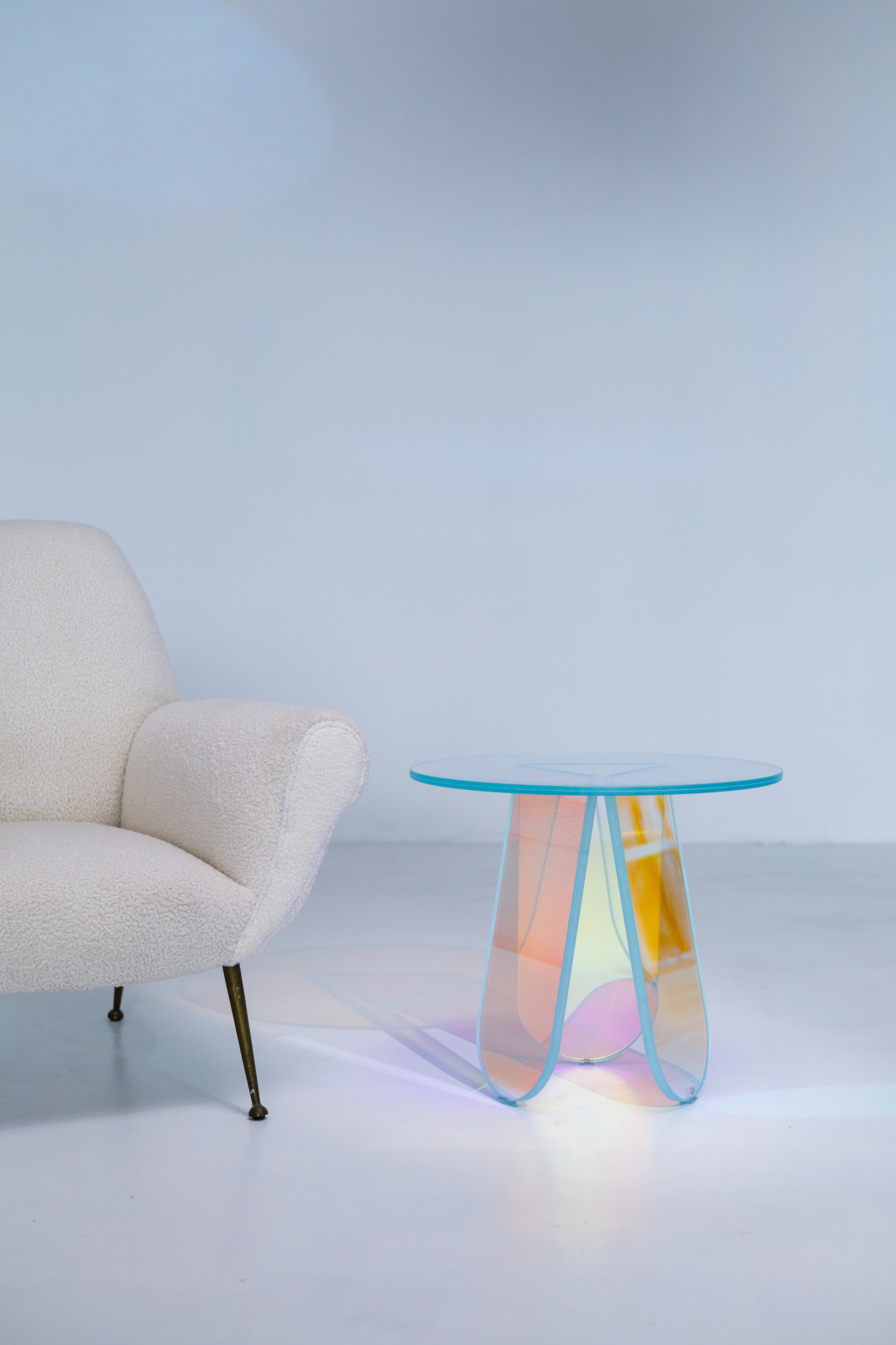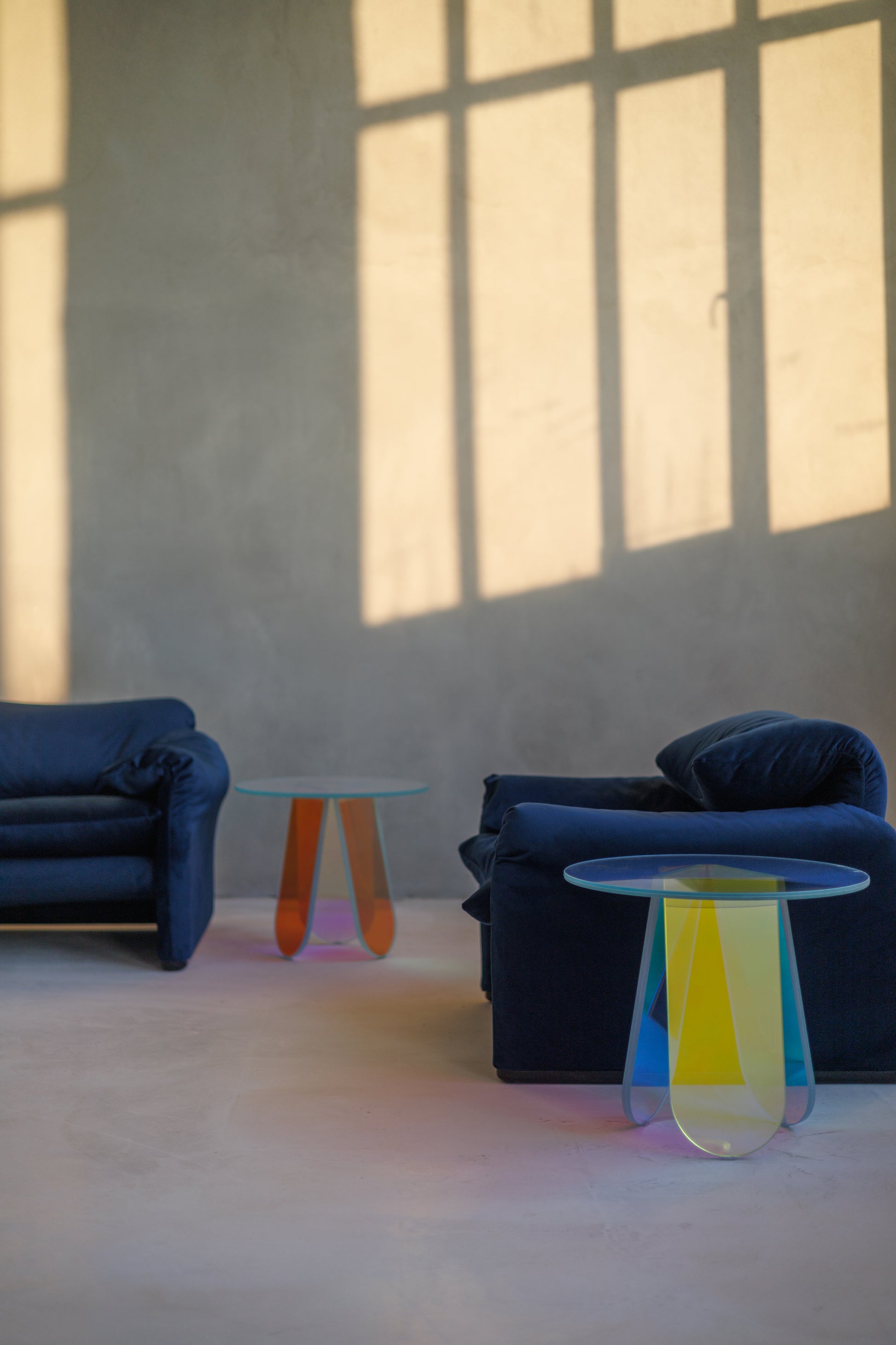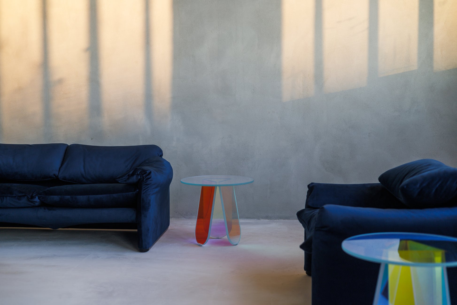 A masterclass in material innovation, the Shimmer Coffee Table by Patricia Urquiola transforms light into a living design element. Crafted from laminated and glued glass, its surface glows with an iridescent, multichromatic finish that shifts color depending on the angle of light and the viewer’s perspective. Sometimes minimal and transparent, other times luminous and prismatic — Shimmer is never the same twice. What sets it apart is not just its visual poetry, but the balance between clean, geometric lines and a finish that feels almost kinetic. It’s an object that reacts, reflects, and reframes its environment, becoming a bold centerpiece in any refined space.