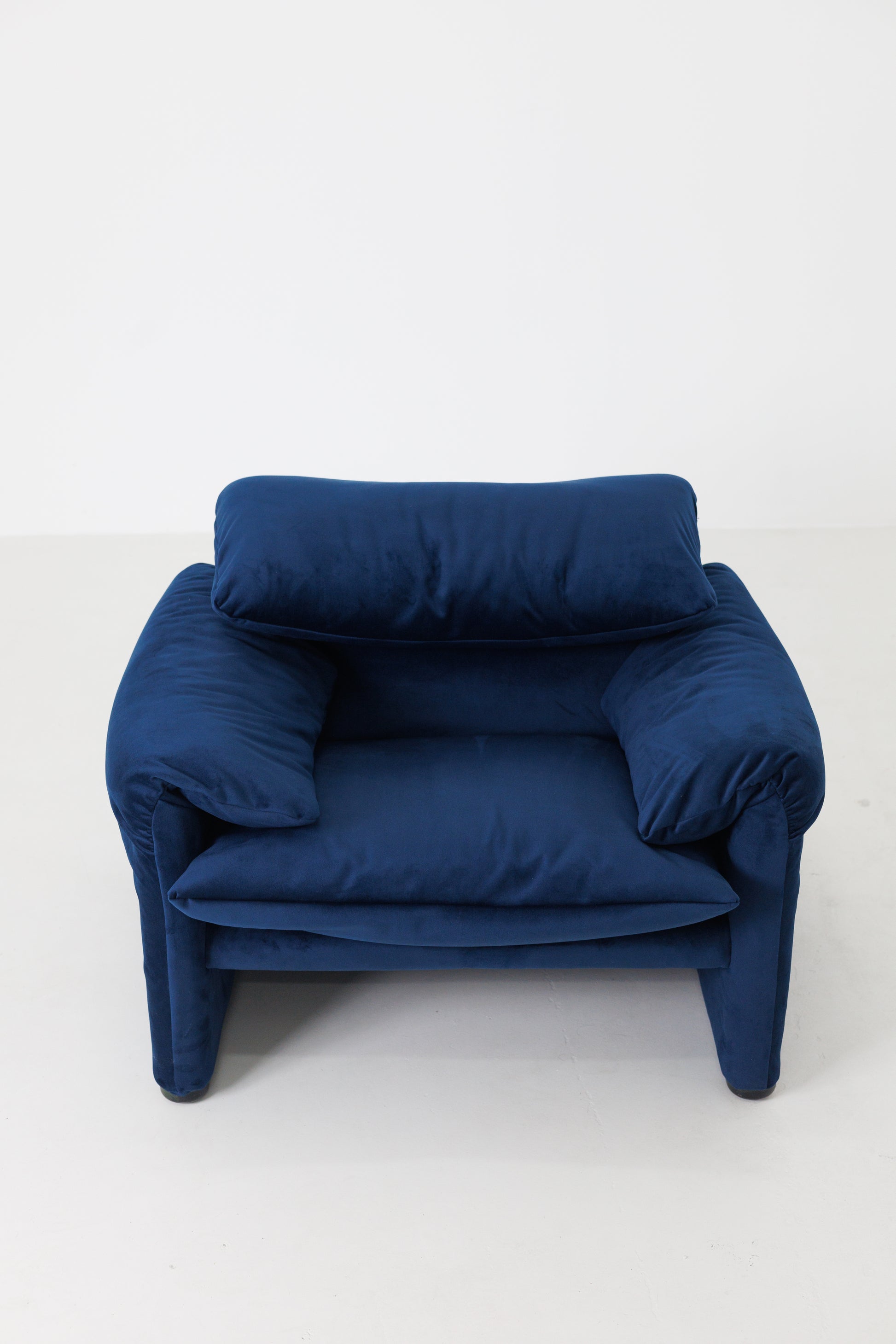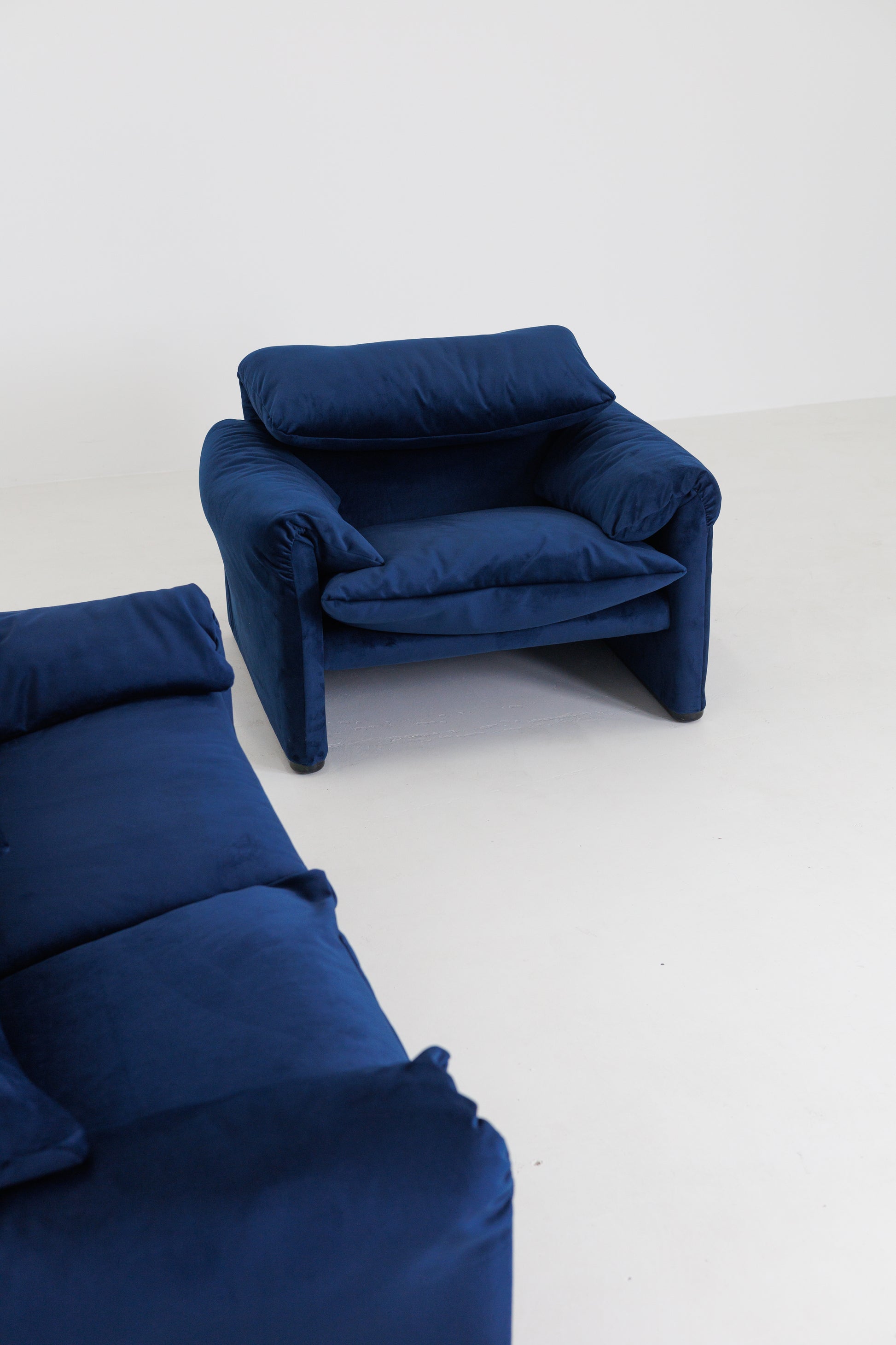 Vintage Blue Velvet Maralunga Armchair & Sofa Set by Vico Magistretti for Cassina