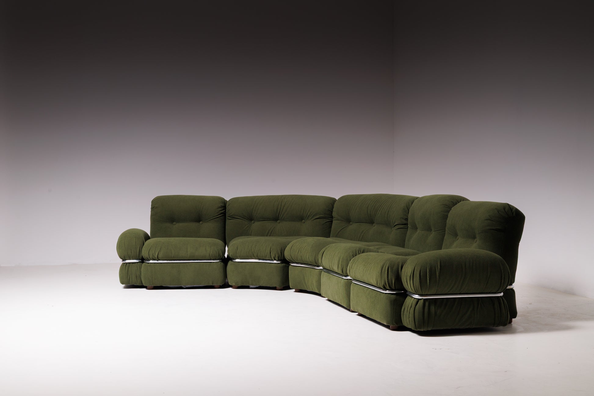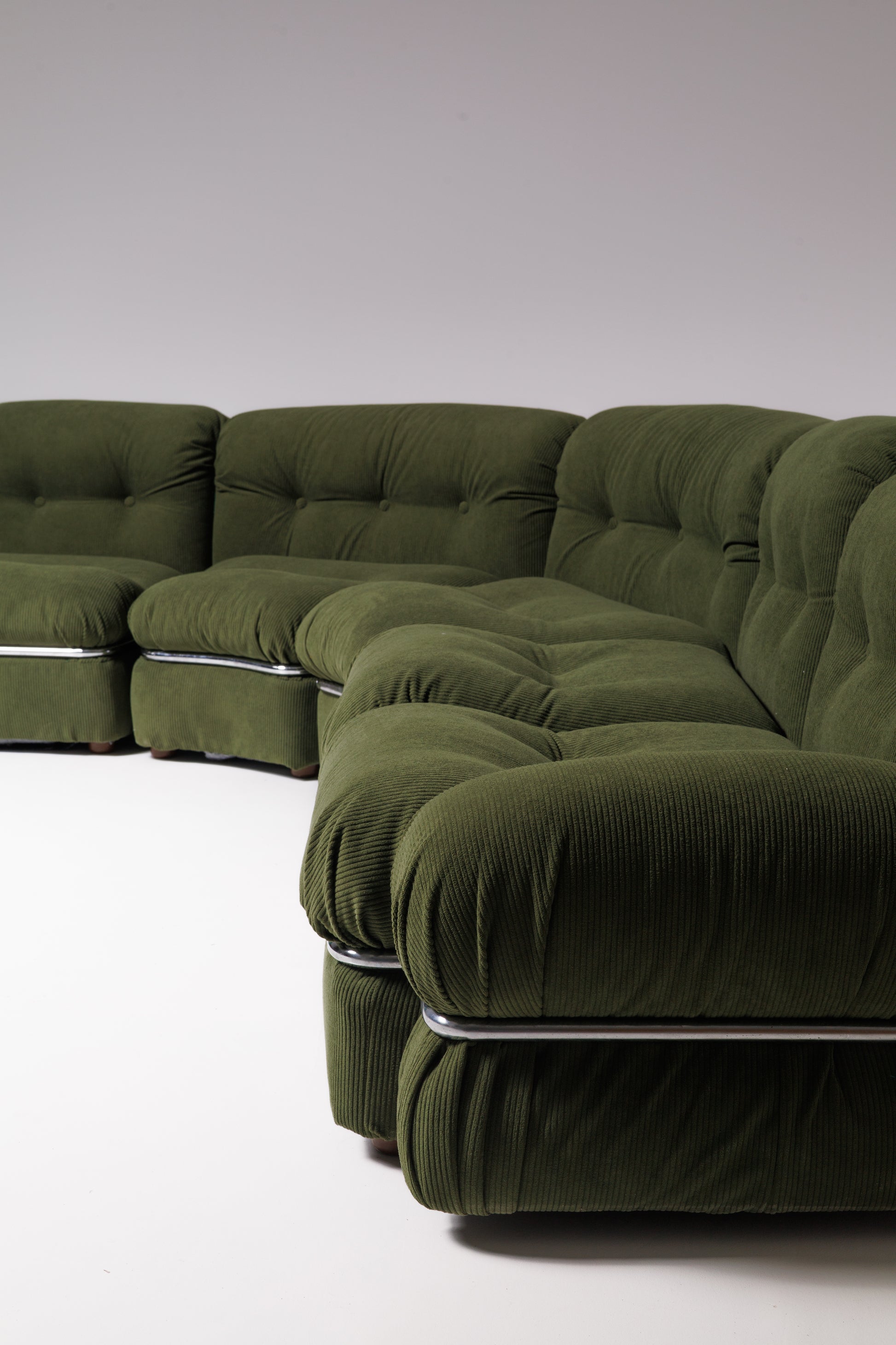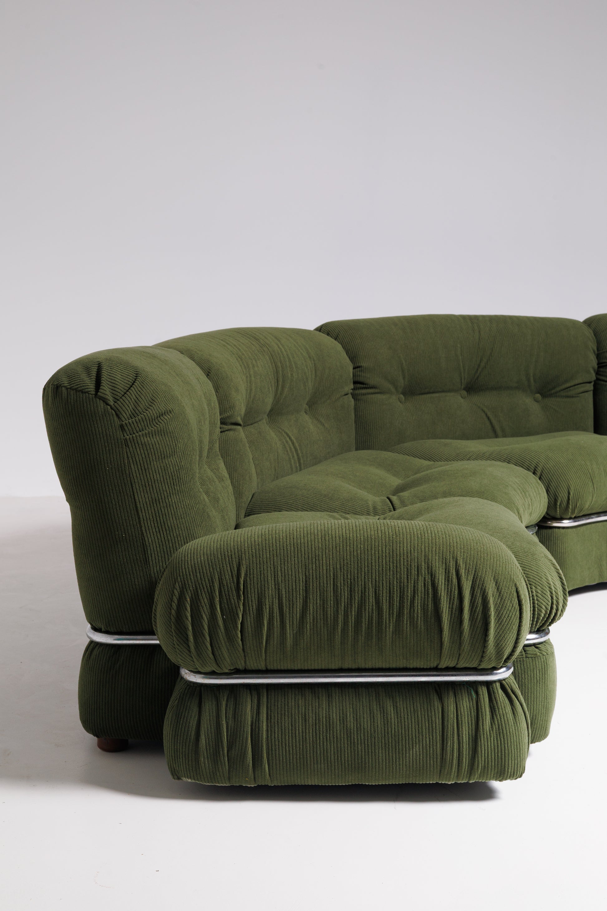 A plush and inviting modular sectional sofa manufactured by Coim S.p.A. in Italy during the 1970s. Upholstered in rich olive-green fabric, the design is distinguished by its deep tufted cushions, generous proportions, and the characteristic chrome band detail separating the seat from the base — a hallmark of Italian comfort-driven design of the era.