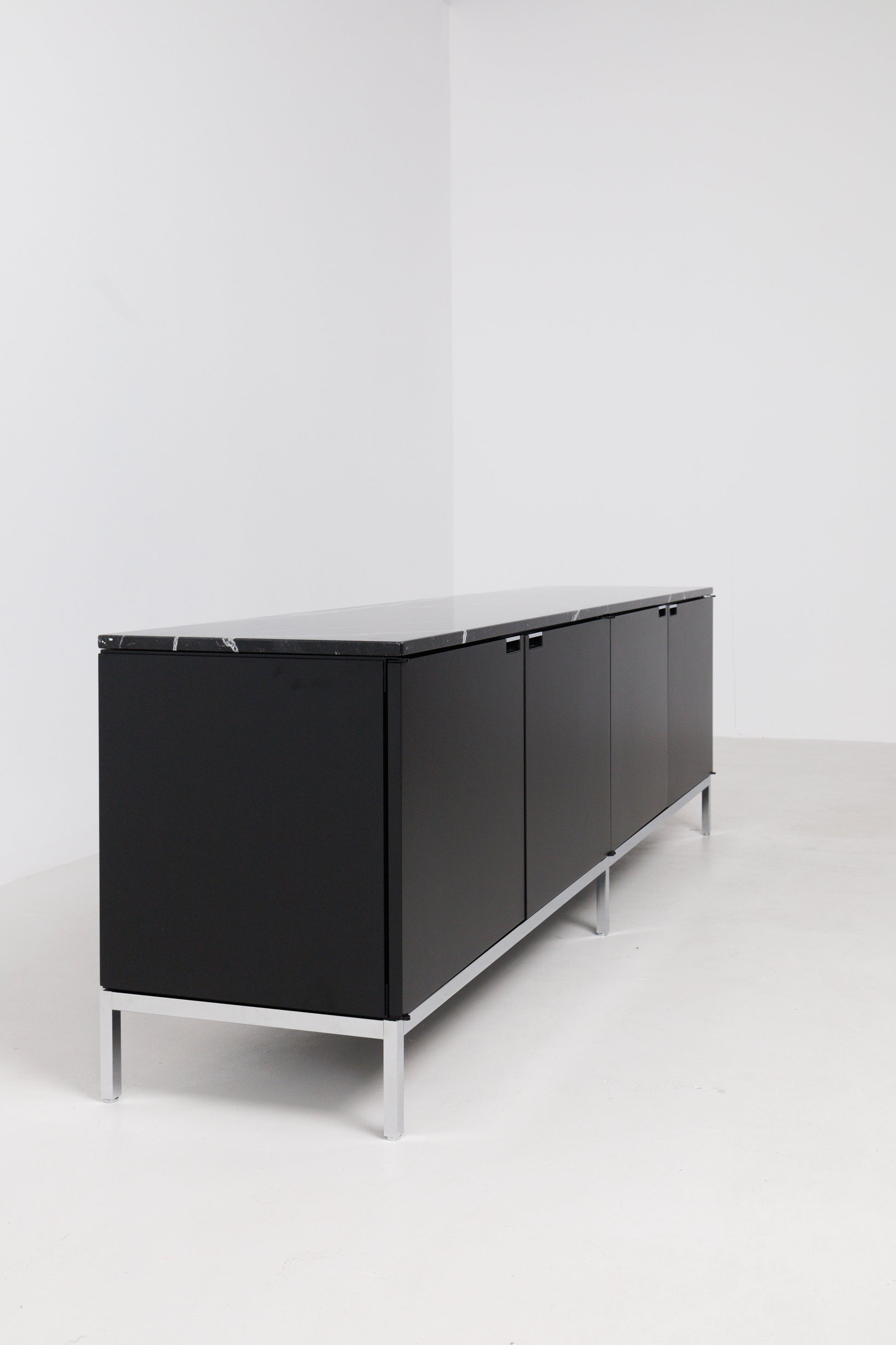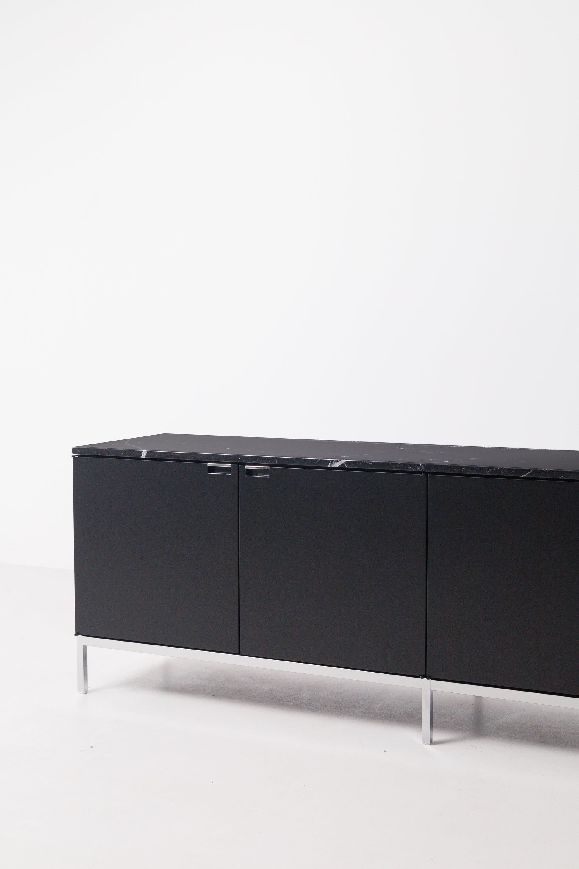 Aceasta este o Credenza, Model 2544M, proiectată inițial de Florence Knoll pentru Knoll Inc. în 1956. Acest exemplu datează din 2020. Piesa are o carcasă de stejar ebonizat și are un blat de marmură neagră. Cadrul piesei este din oțel lustruit și își păstrează tragerile originale.