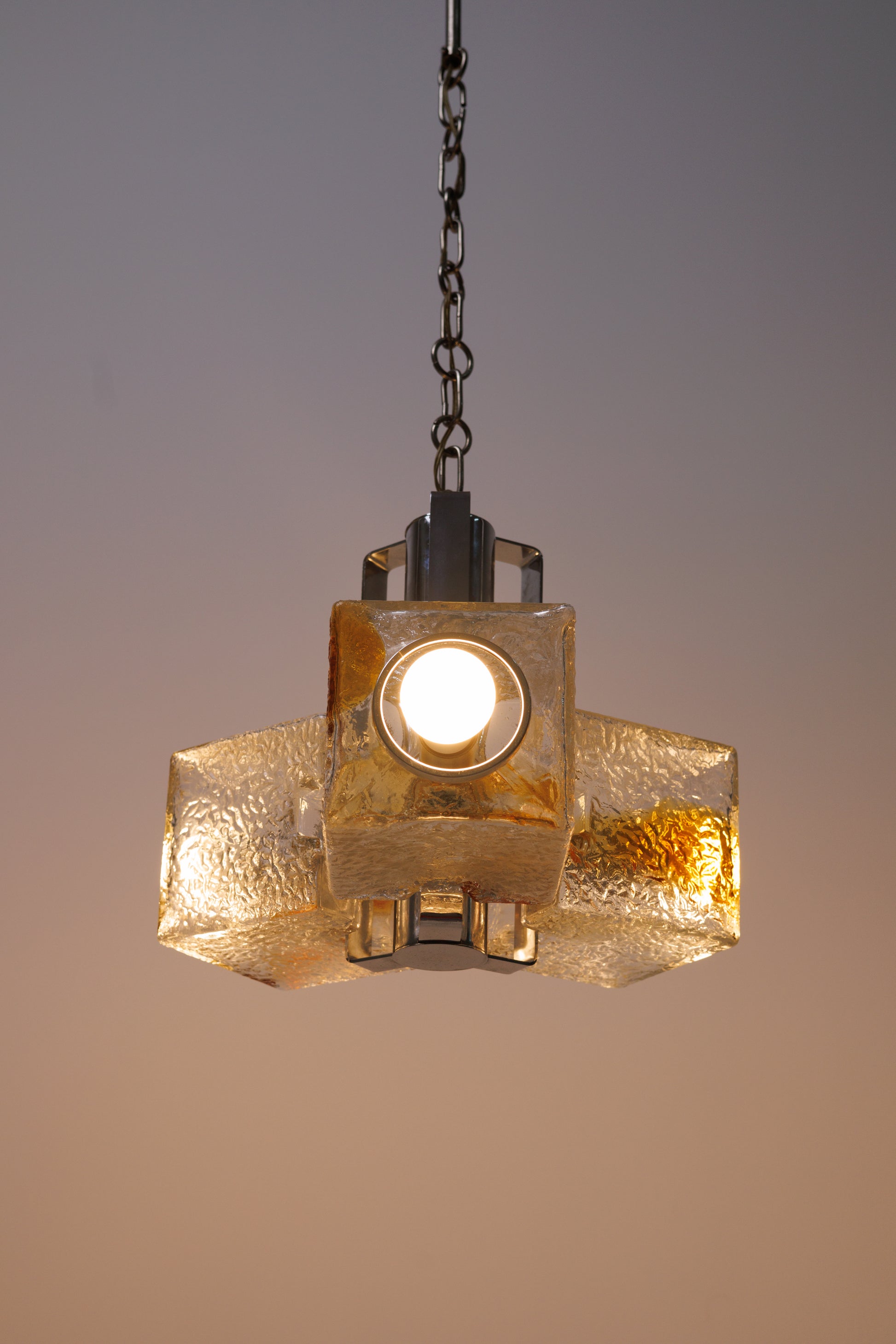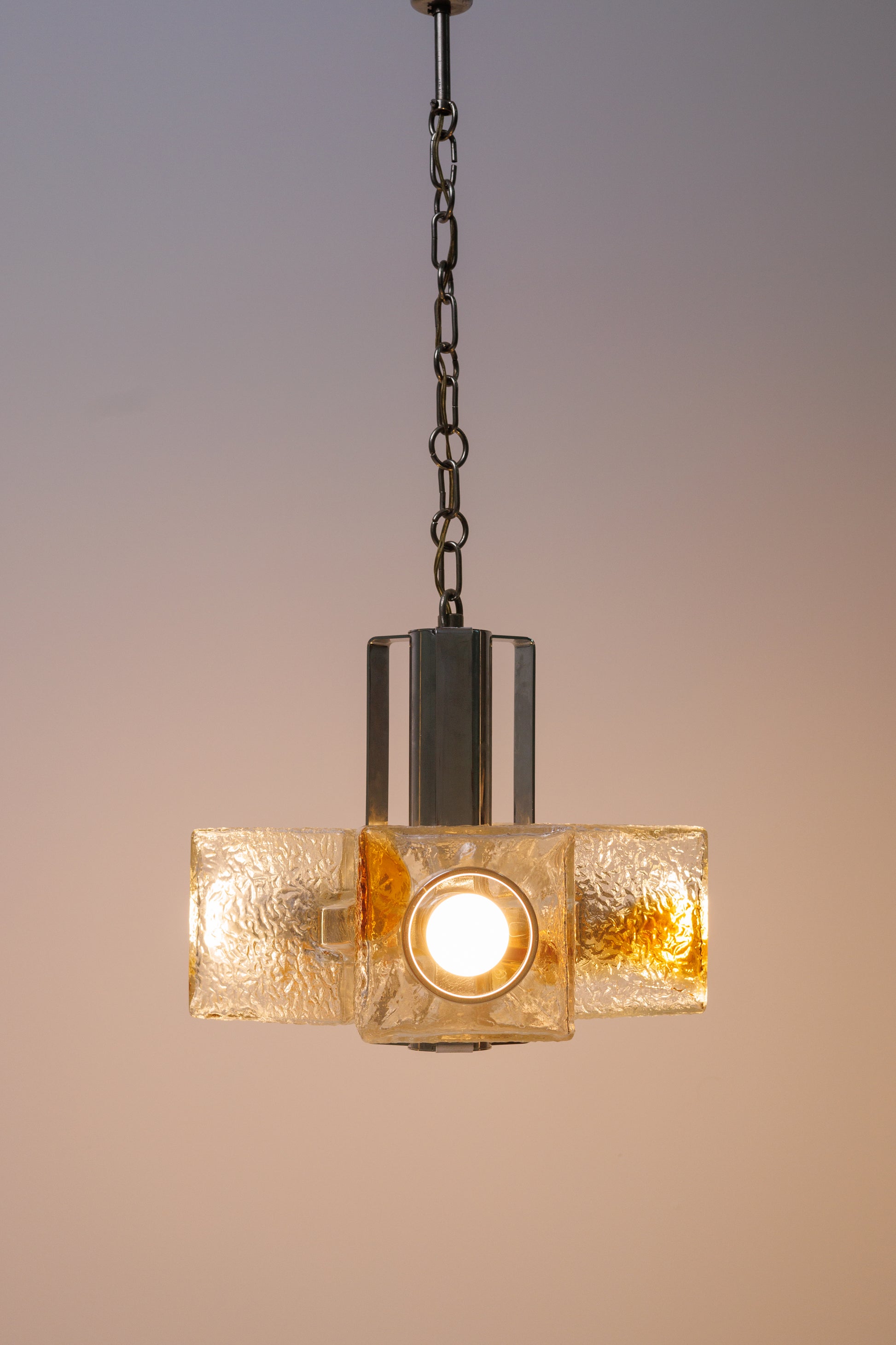 The chrome metal frame provides a sleek contrast, highlighting the sculptural quality of the piece. Suspended from a sturdy chain, this lamp embodies the refined craftsmanship and bold design typical of VeArt’s work during the era.