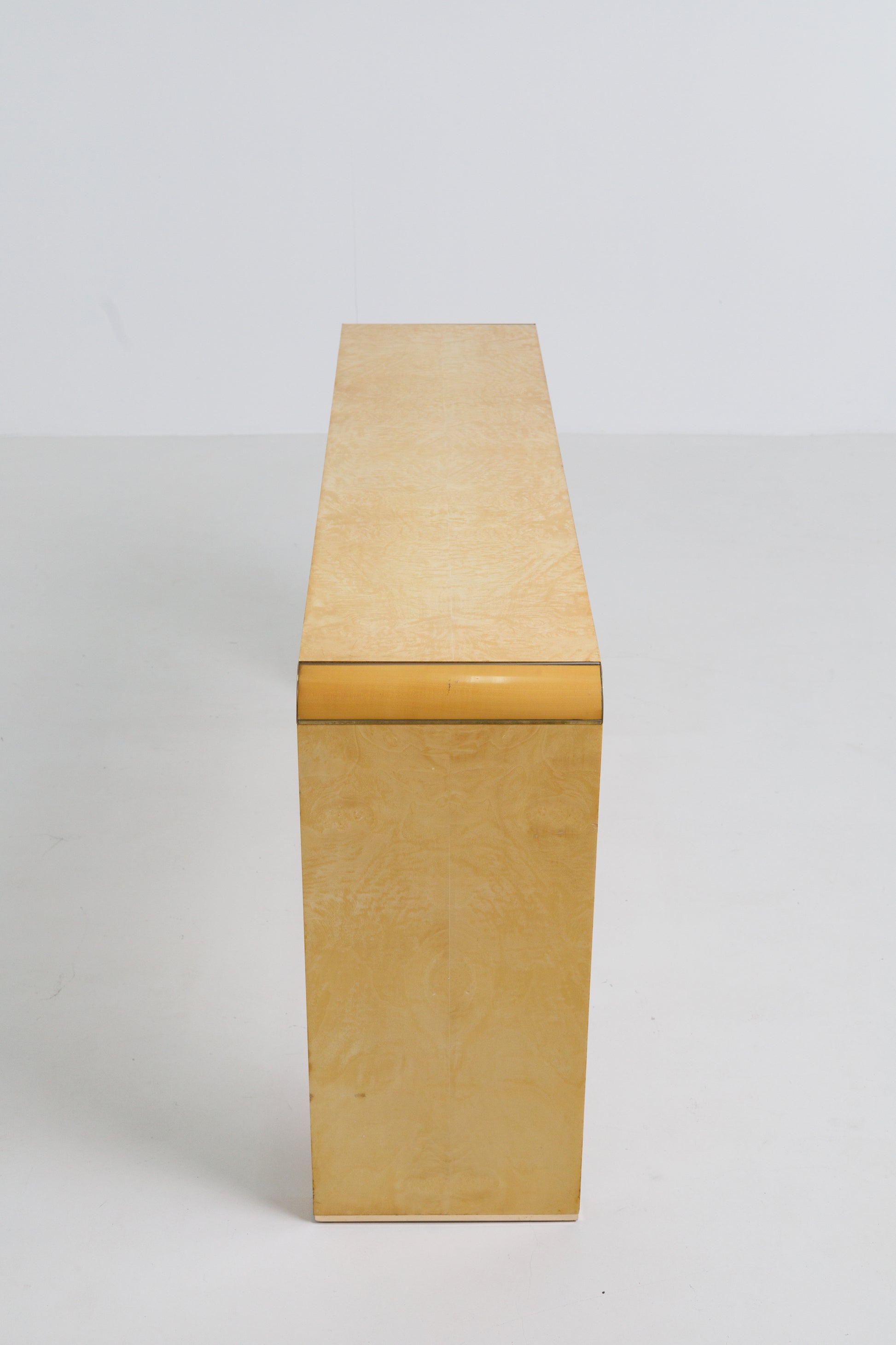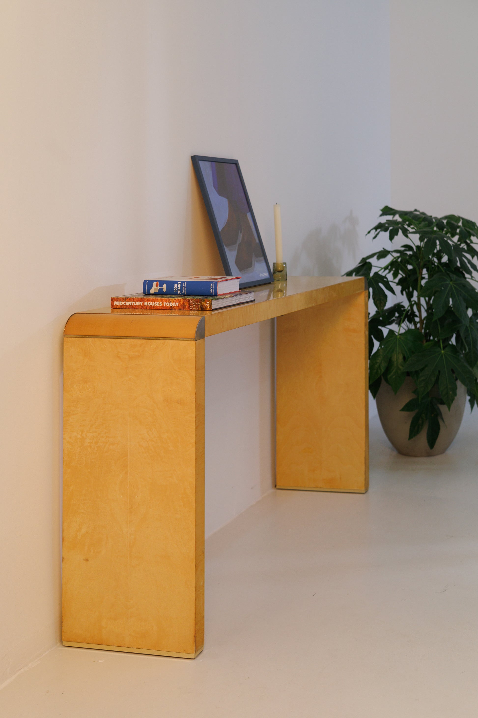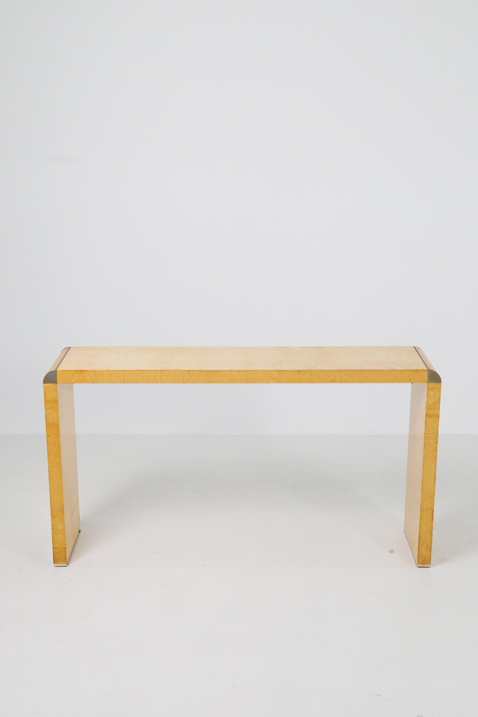 This Italian-style console table from the 1980s features a rich and complex design that exemplifies the craftsmanship of the era. Made from burl wood, the table’s intricate grain adds texture and warmth, while the brass metal accents on the edges highlight the fine detailing. With its bold yet elegant form, this piece brings a sense of sophistication and opulence, making it a standout addition to any space.