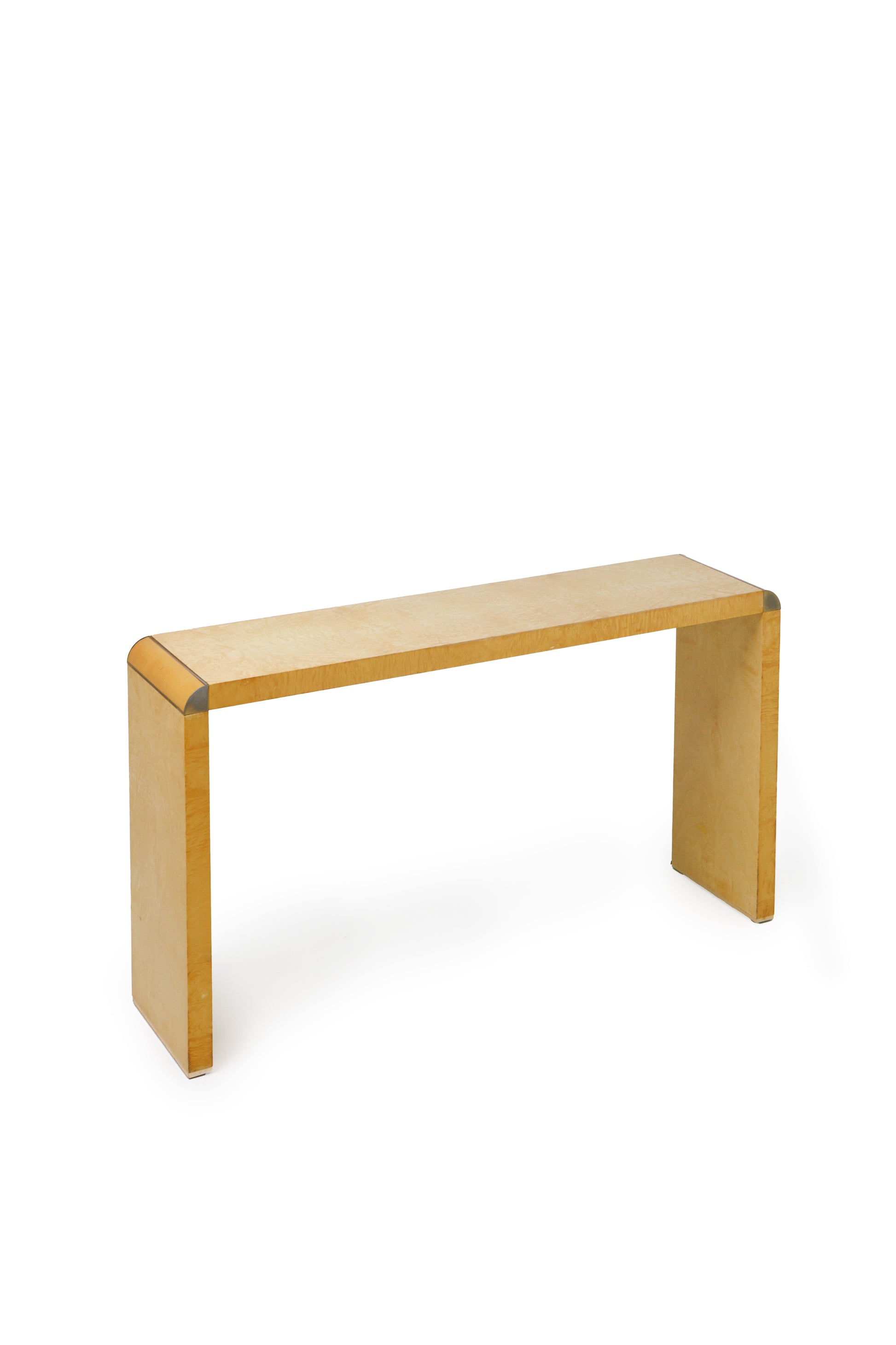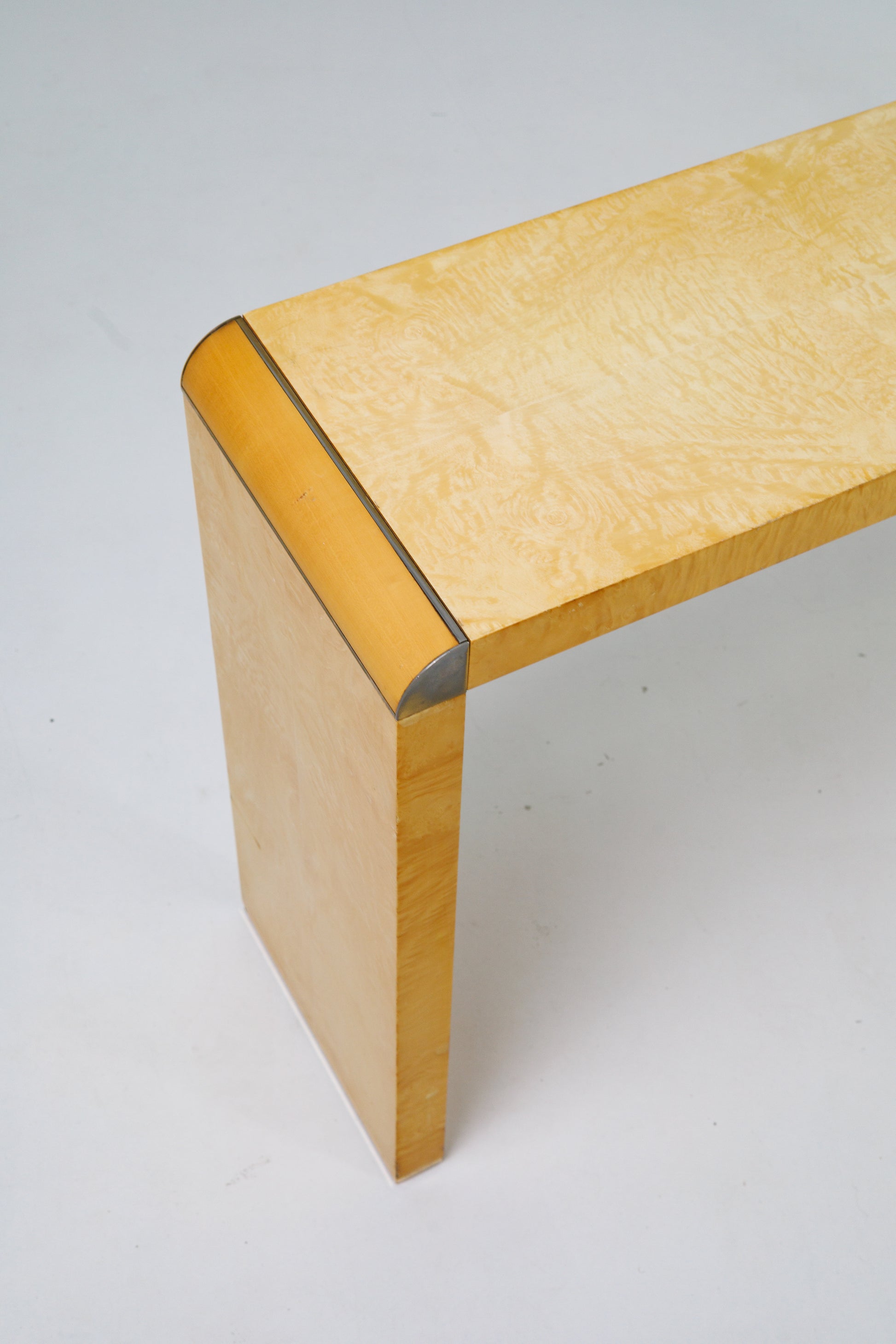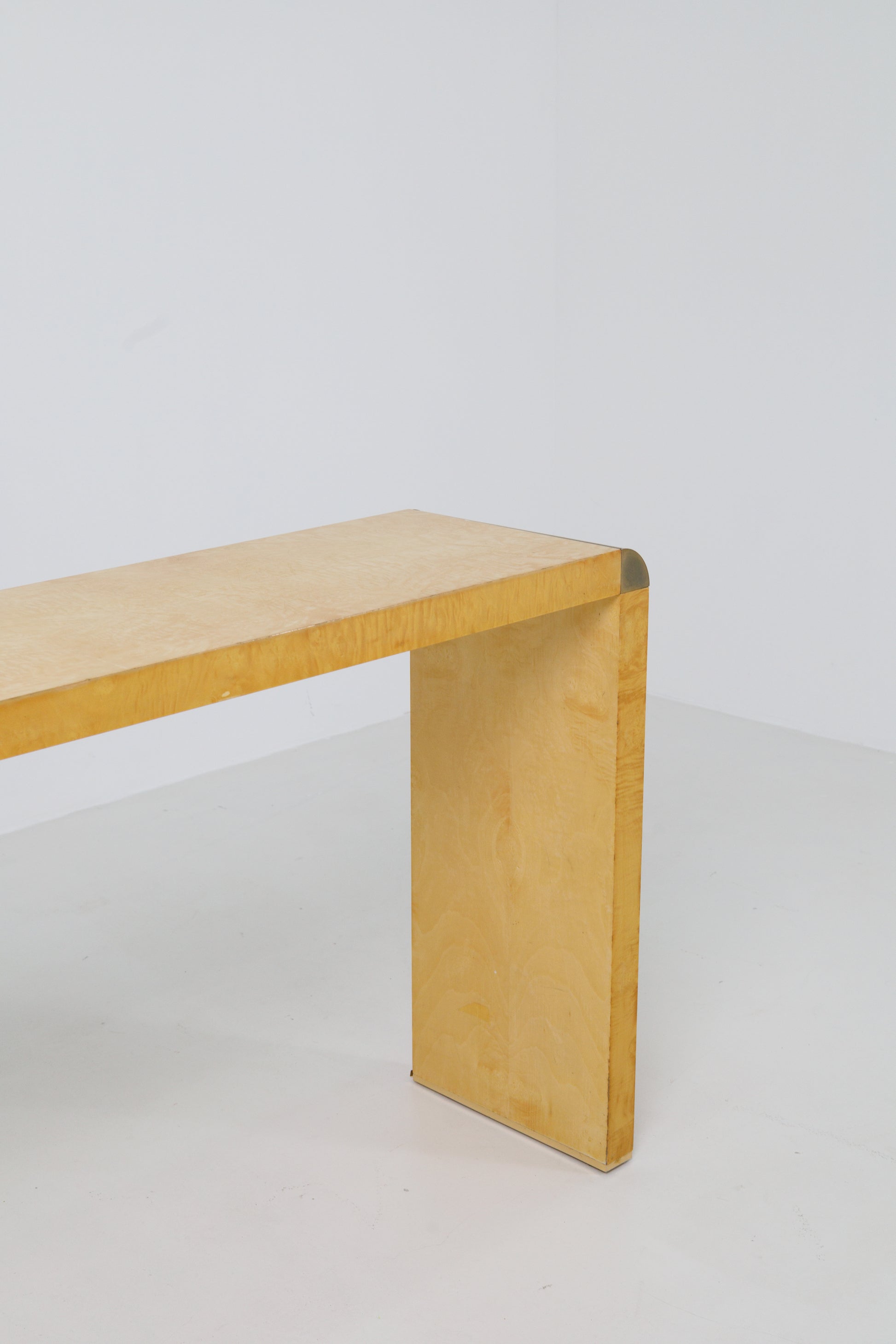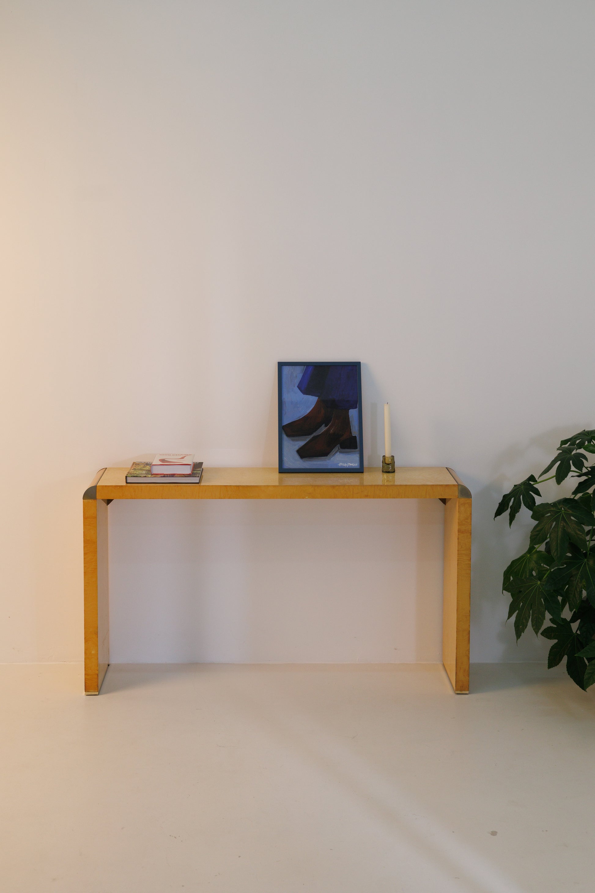 This Italian-style console table from the 1980s features a rich and complex design that exemplifies the craftsmanship of the era. Made from burl wood, the table’s intricate grain adds texture and warmth, while the brass metal accents on the edges highlight the fine detailing. With its bold yet elegant form, this piece brings a sense of sophistication and opulence, making it a standout addition to any space.