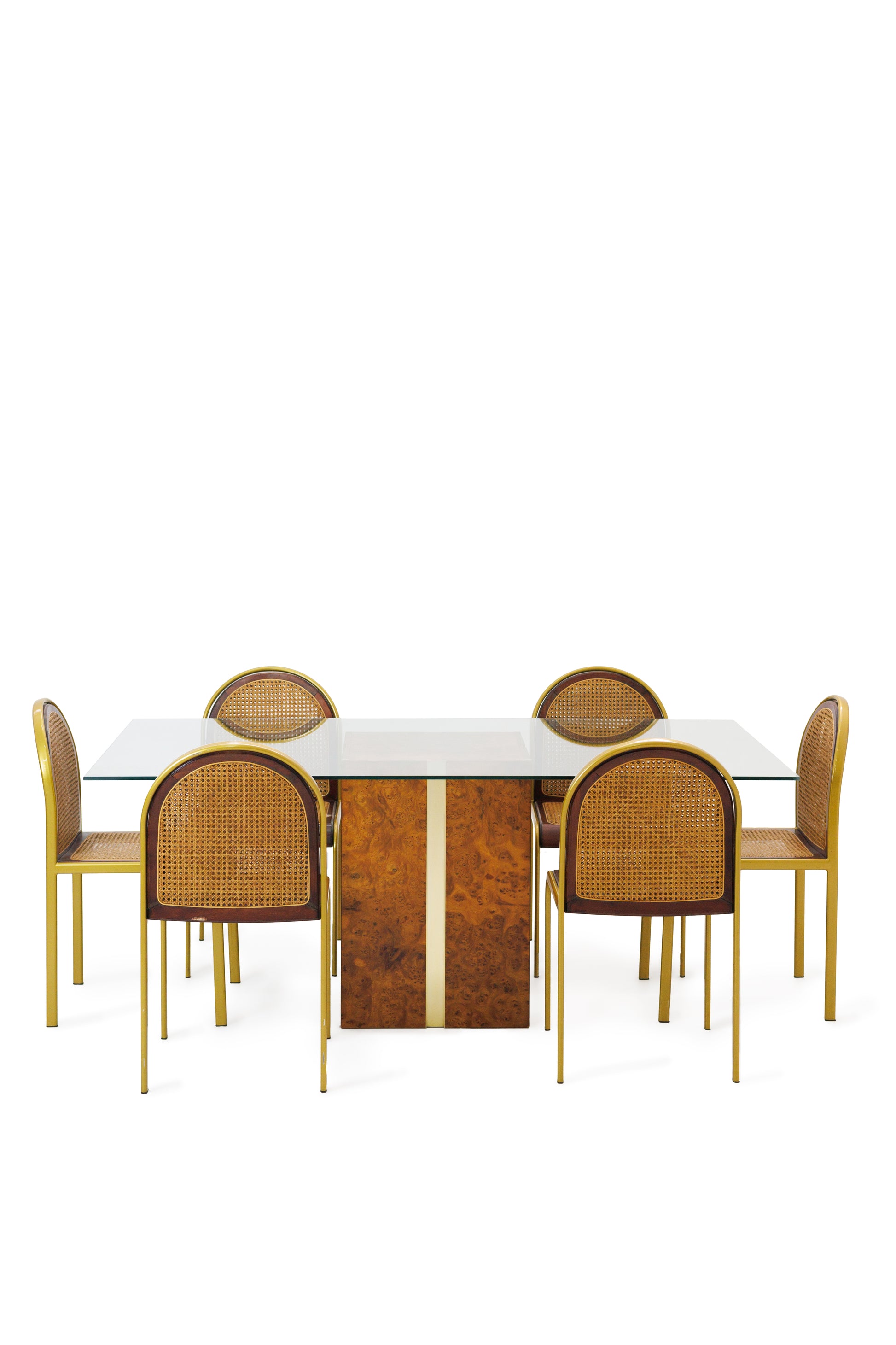 Scaunele, fabricate în Italia în anii 1970, sunt inspirate de era modernistă, cu un farmec retro distinct.