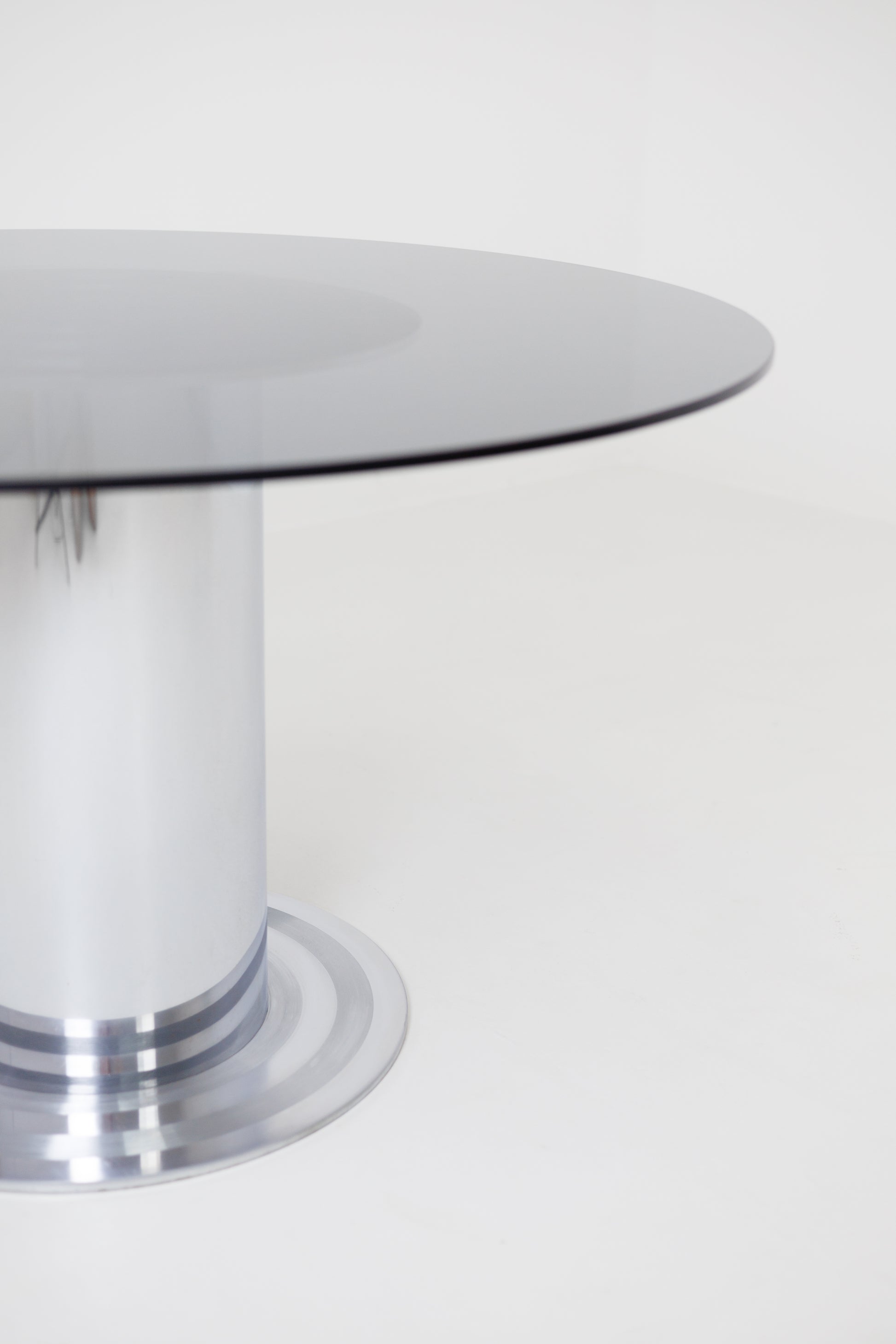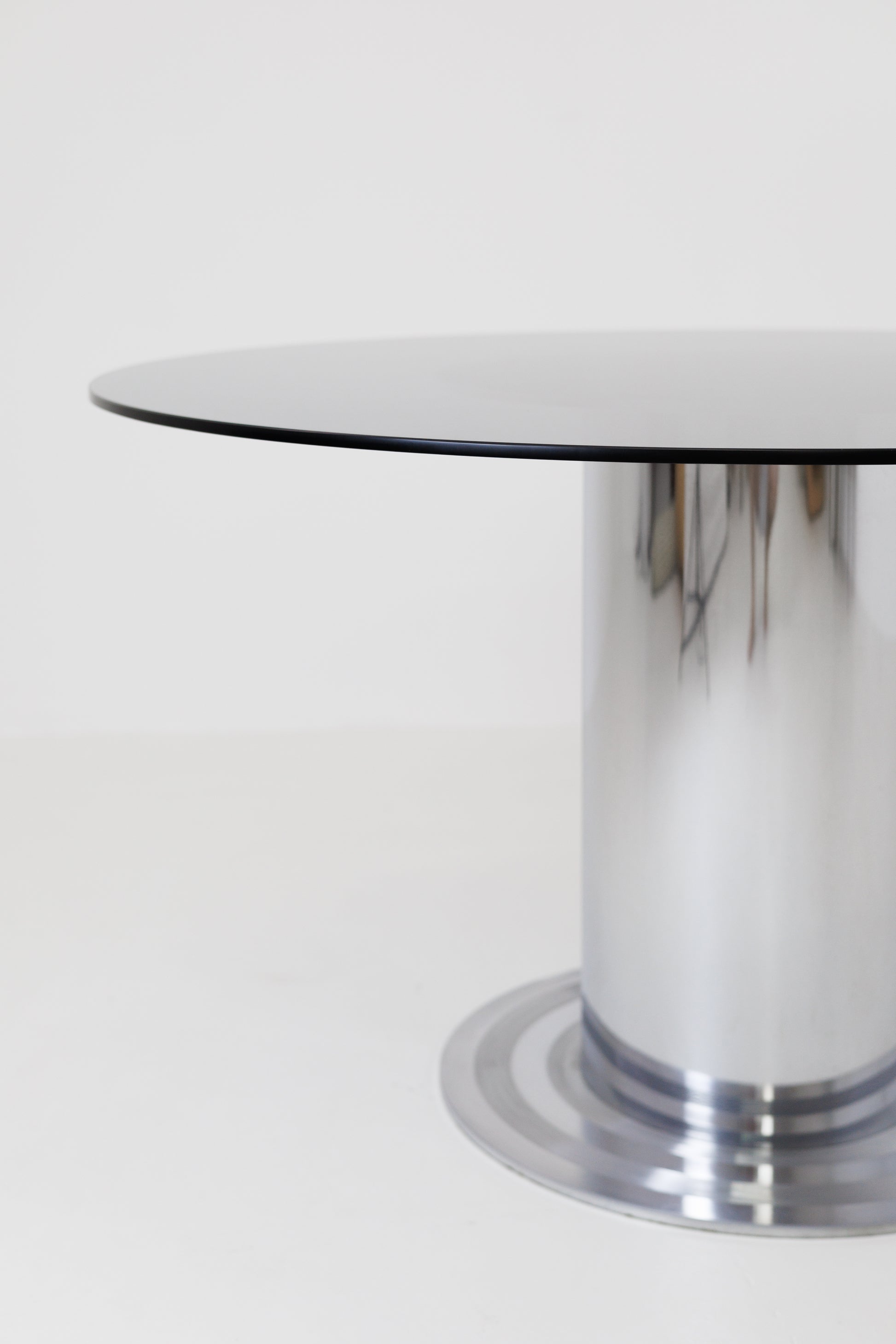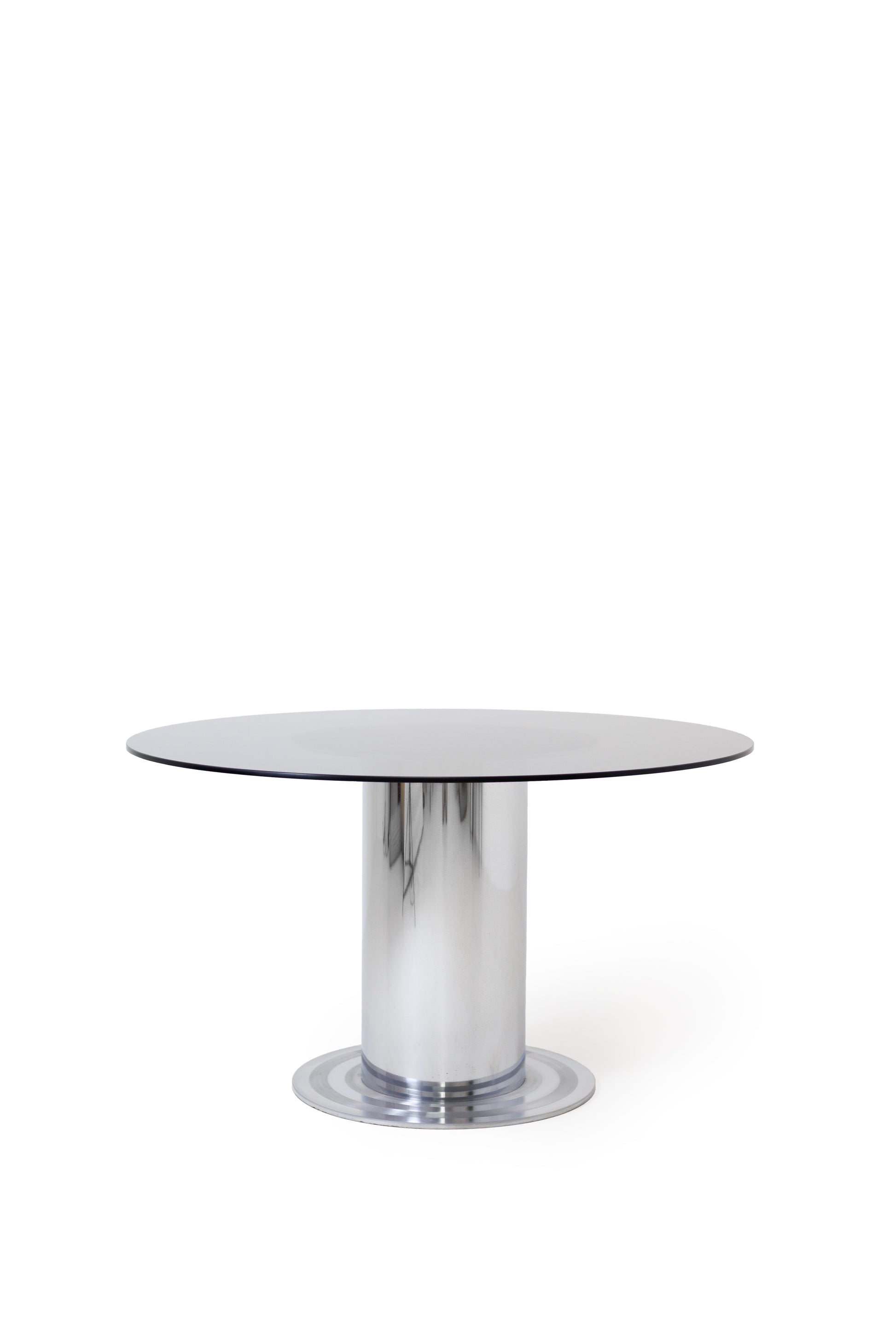 Această masă rotundă, creată de celebrul fotograf și designer Willy Rizzo, reflectă perfect glamourul mijlocului secolului XX. Cu un blat din sticlă și o bază cilindrică cromată, masa este o capodoperă de eleganță subtilă și versatilă pentru orice interior modern.