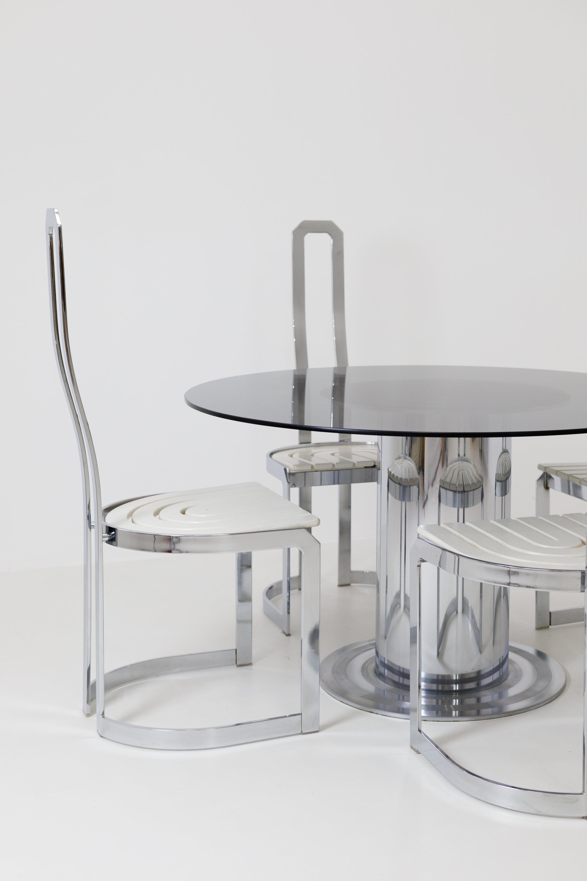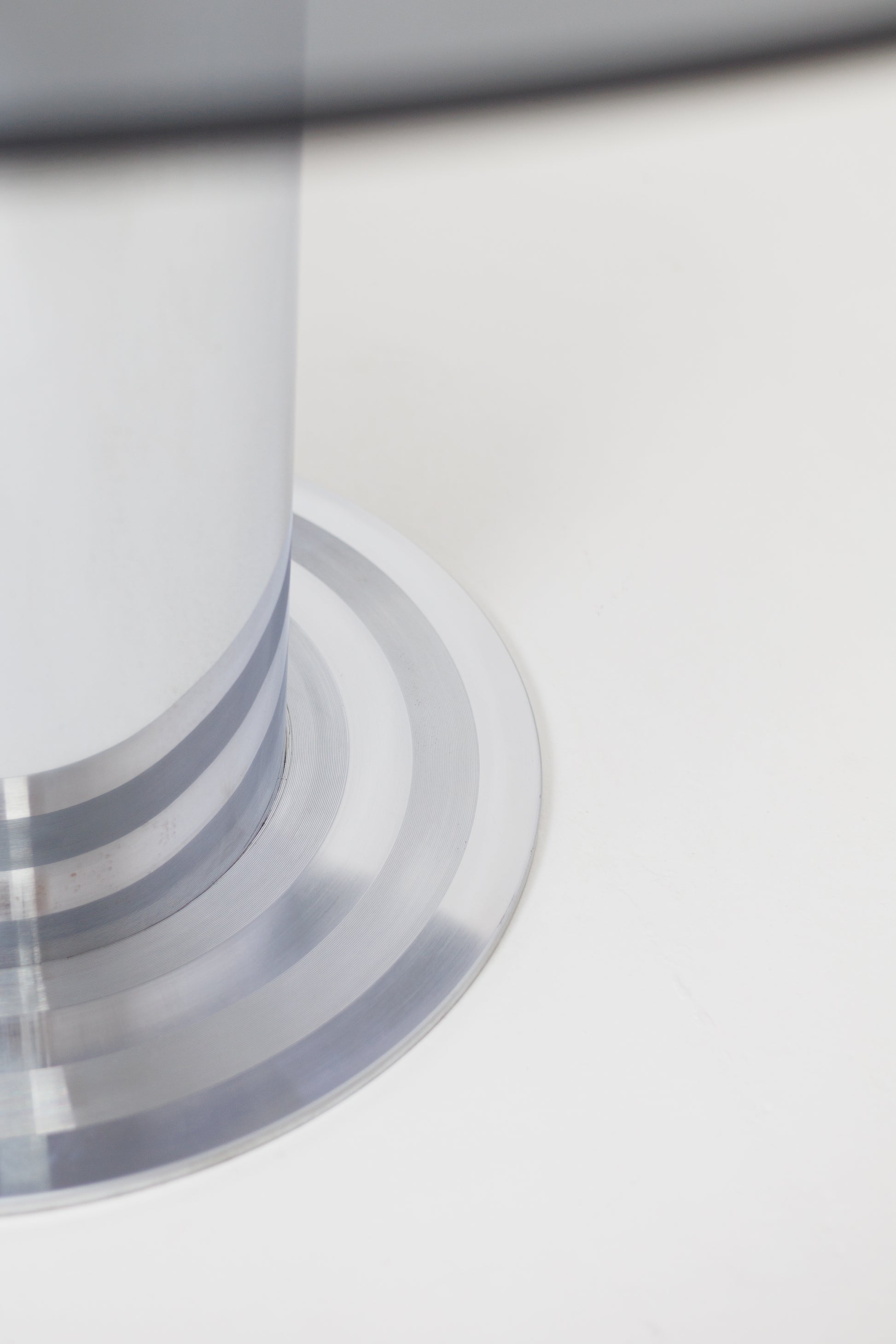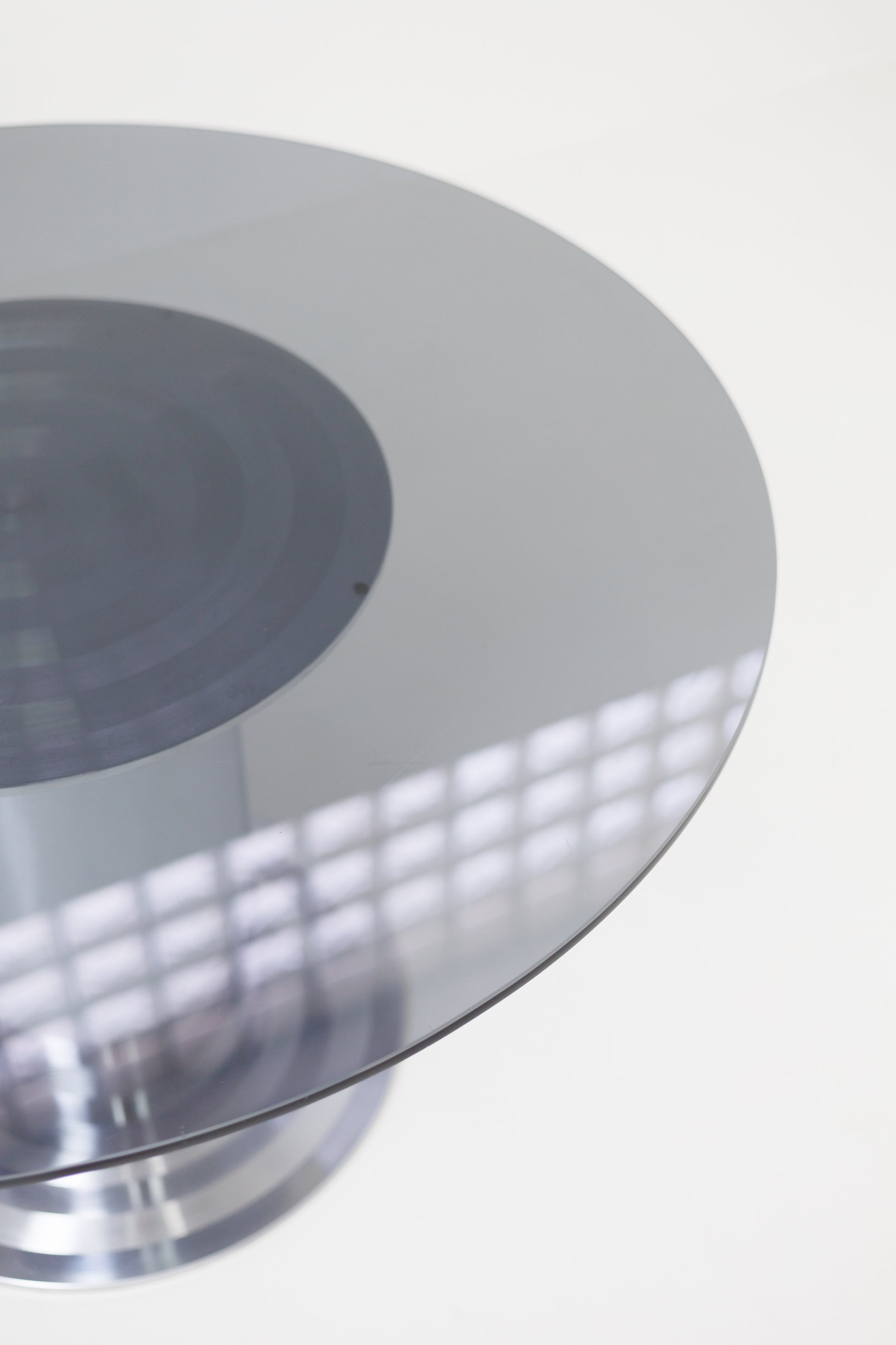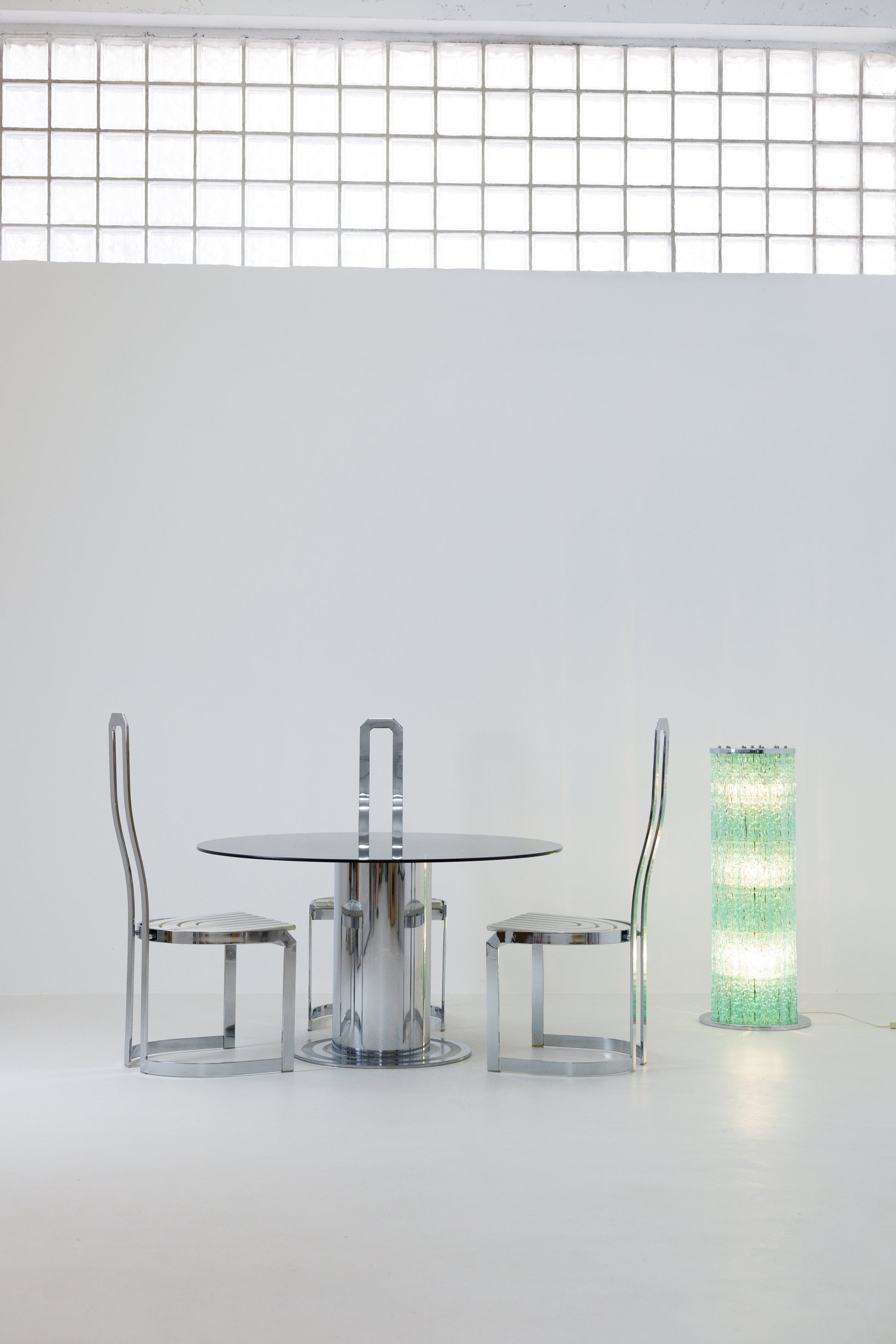 Această masă rotundă, creată de celebrul fotograf și designer Willy Rizzo, reflectă perfect glamourul mijlocului secolului XX. Cu un blat din sticlă și o bază cilindrică cromată, masa este o capodoperă de eleganță subtilă și versatilă pentru orice interior modern.