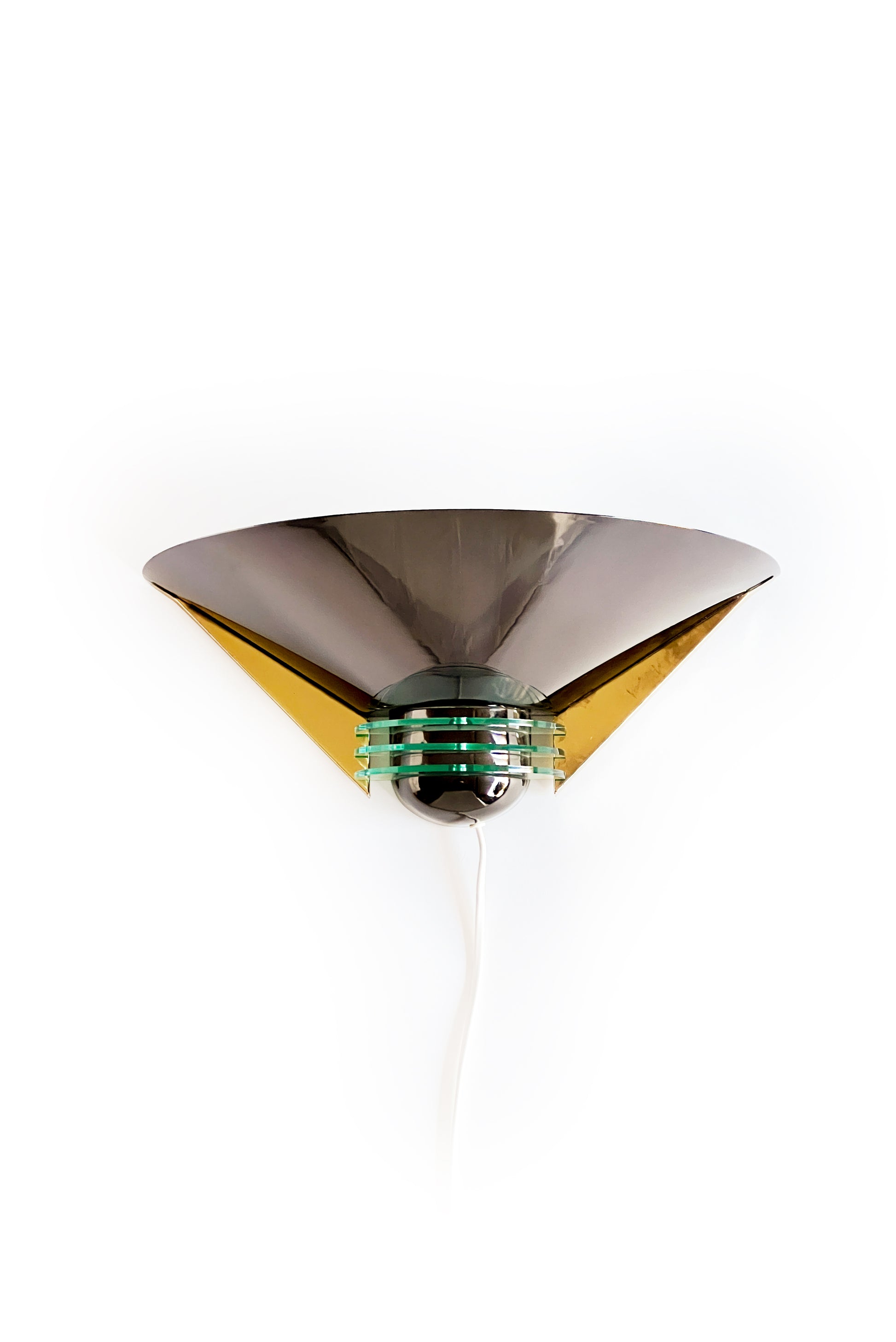 This exquisite piece is part of the famous Herda lamps, made by Dutch craftmenship. This particular lamp has an art deco style (usually Herda lamps are defined by it’s functional and minimal style) with a proeminent reflective surface and a striking contrast of metallic sheen with transparent layers of glass.