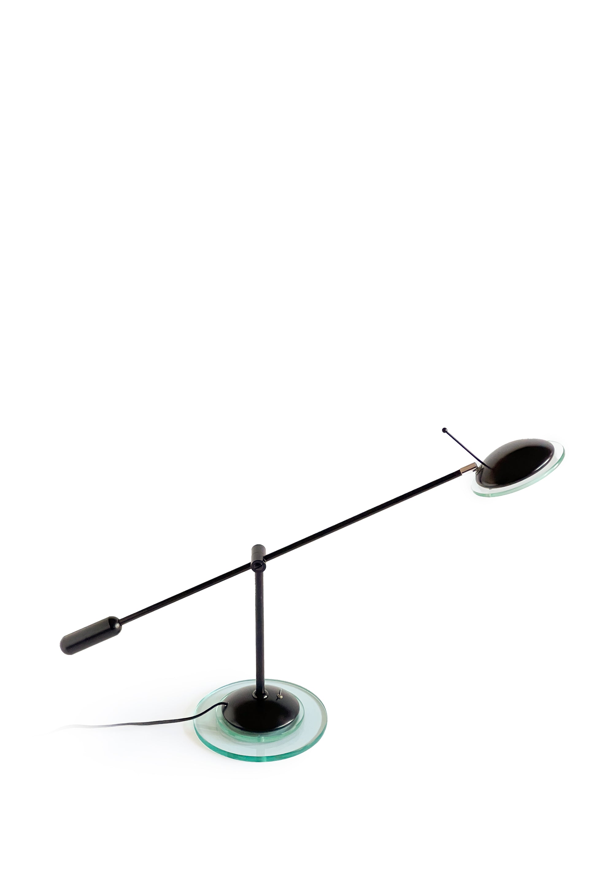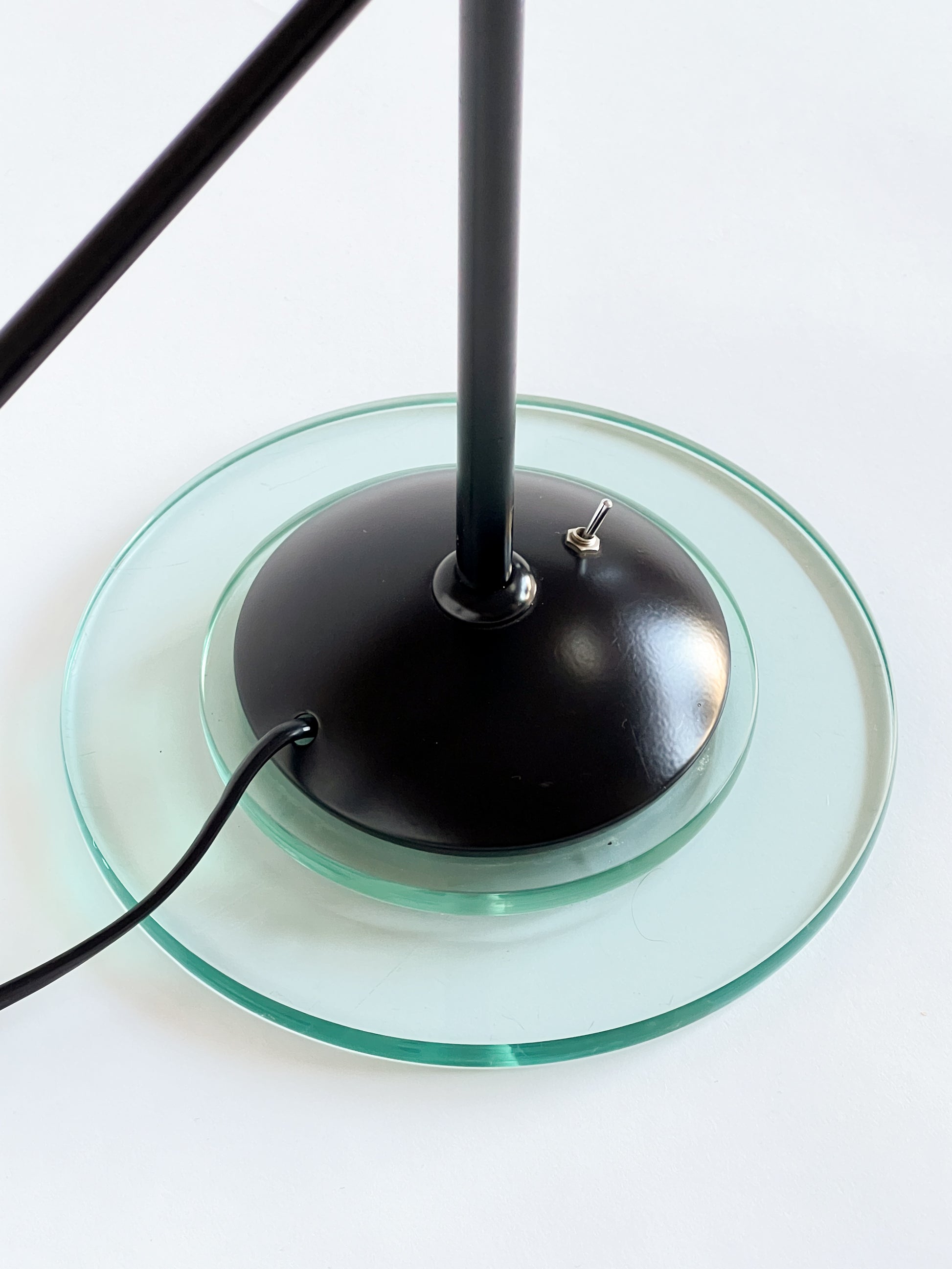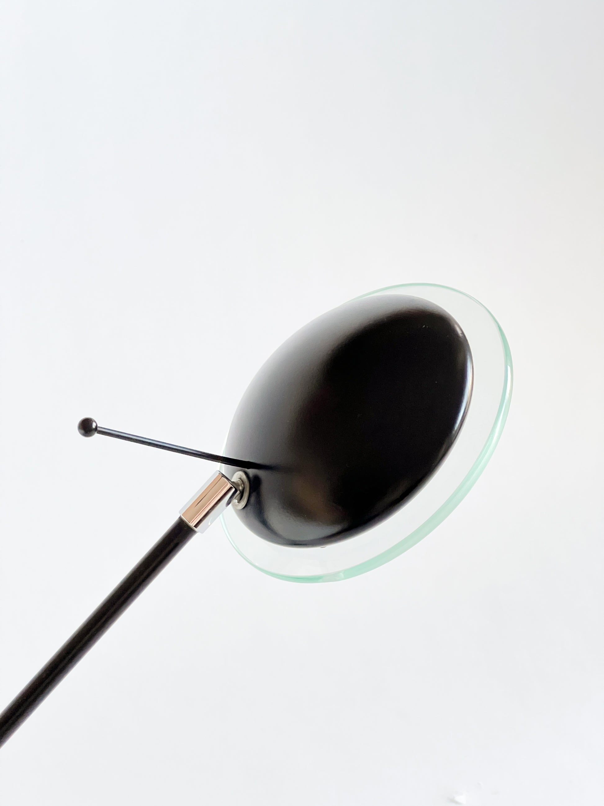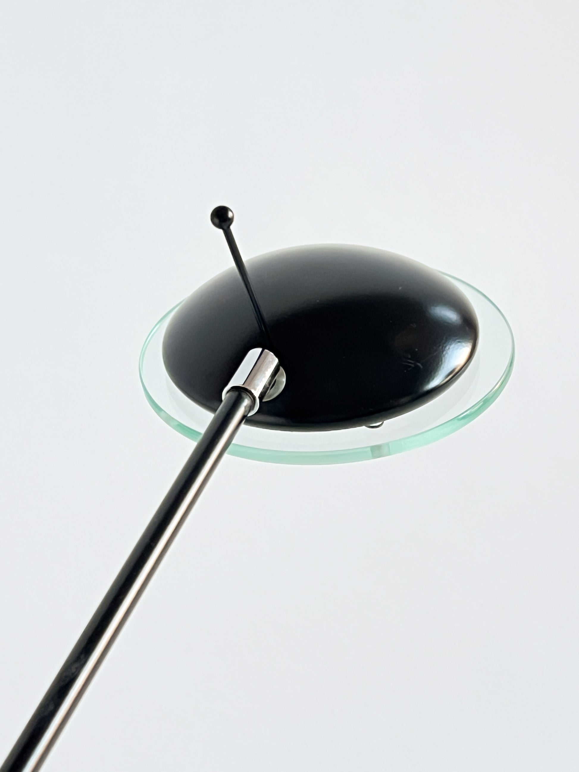 Dispune de un braț reglabil de culoare neagră și un cap cu un accent din sticlă cu tentă verde, așezat pe o bază circulară care ancorează piesa cu un aer minimalist.