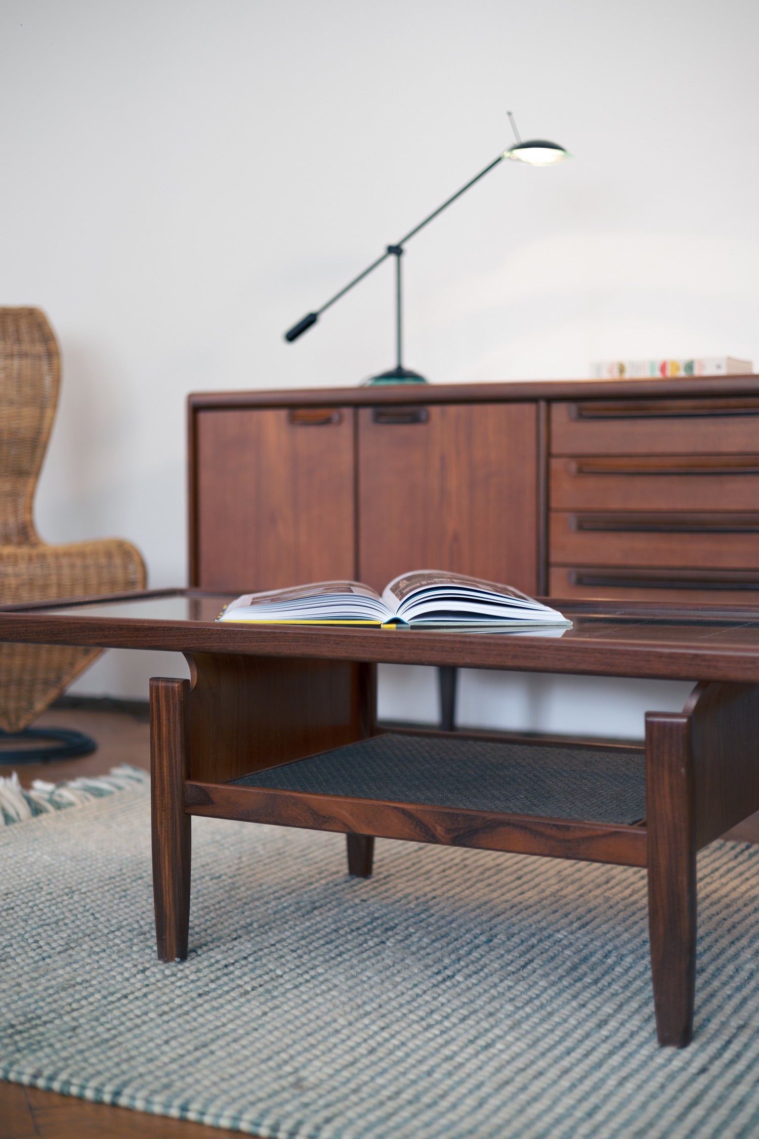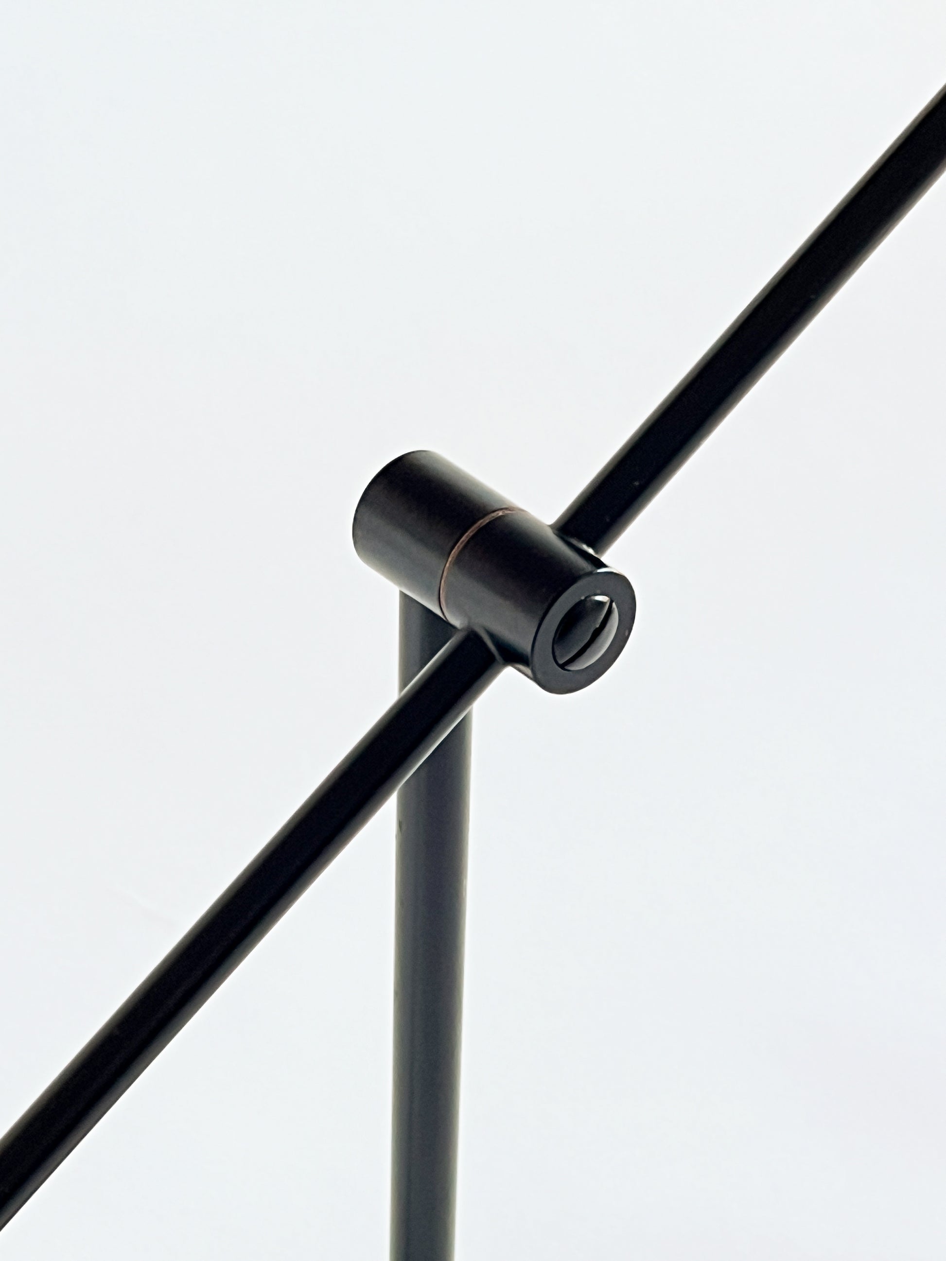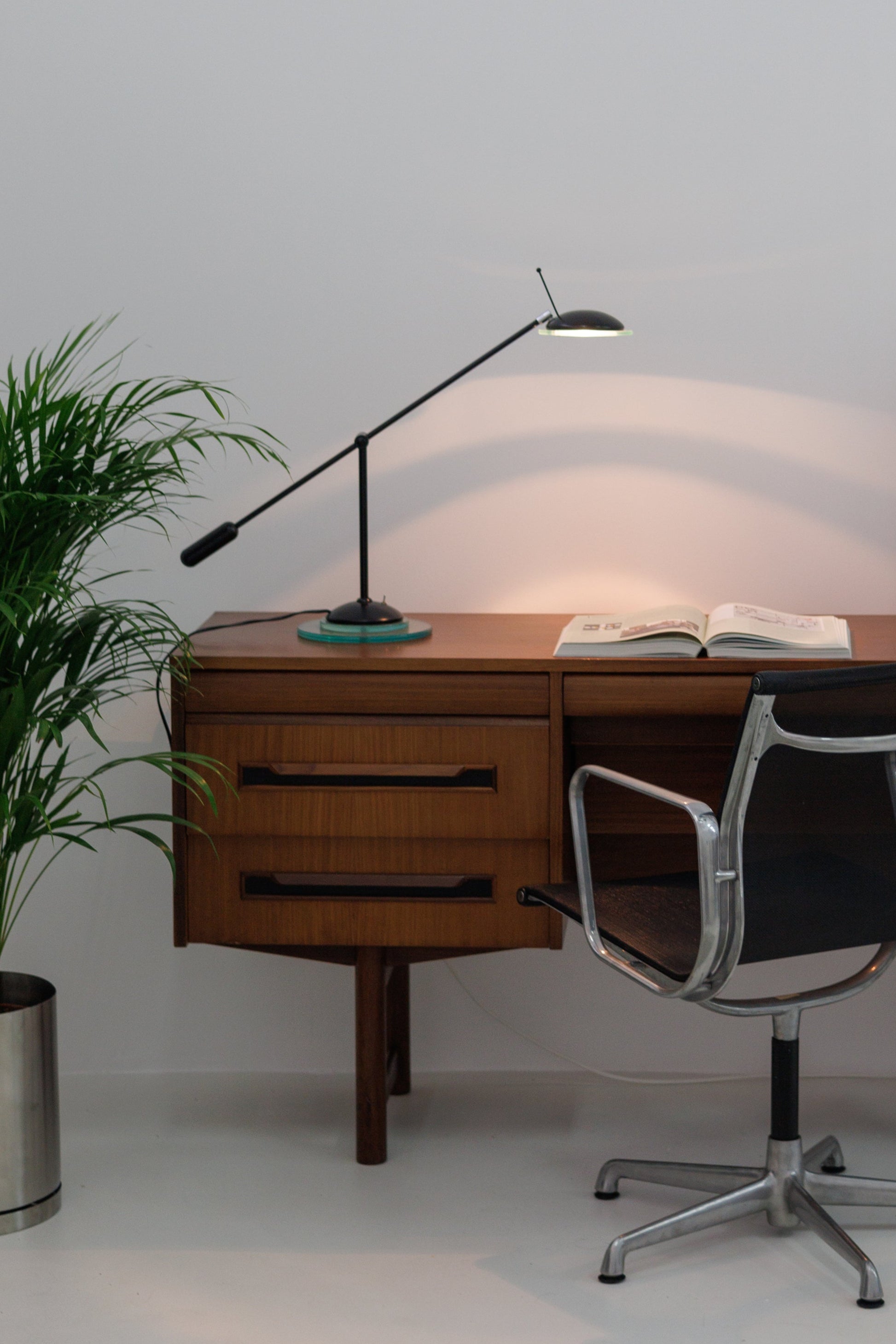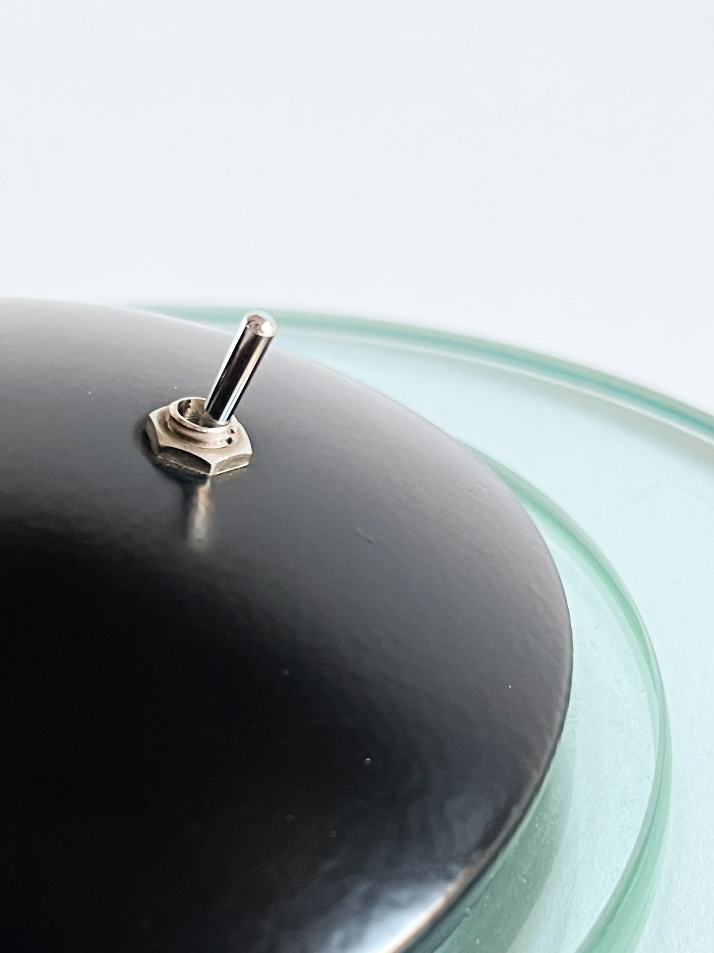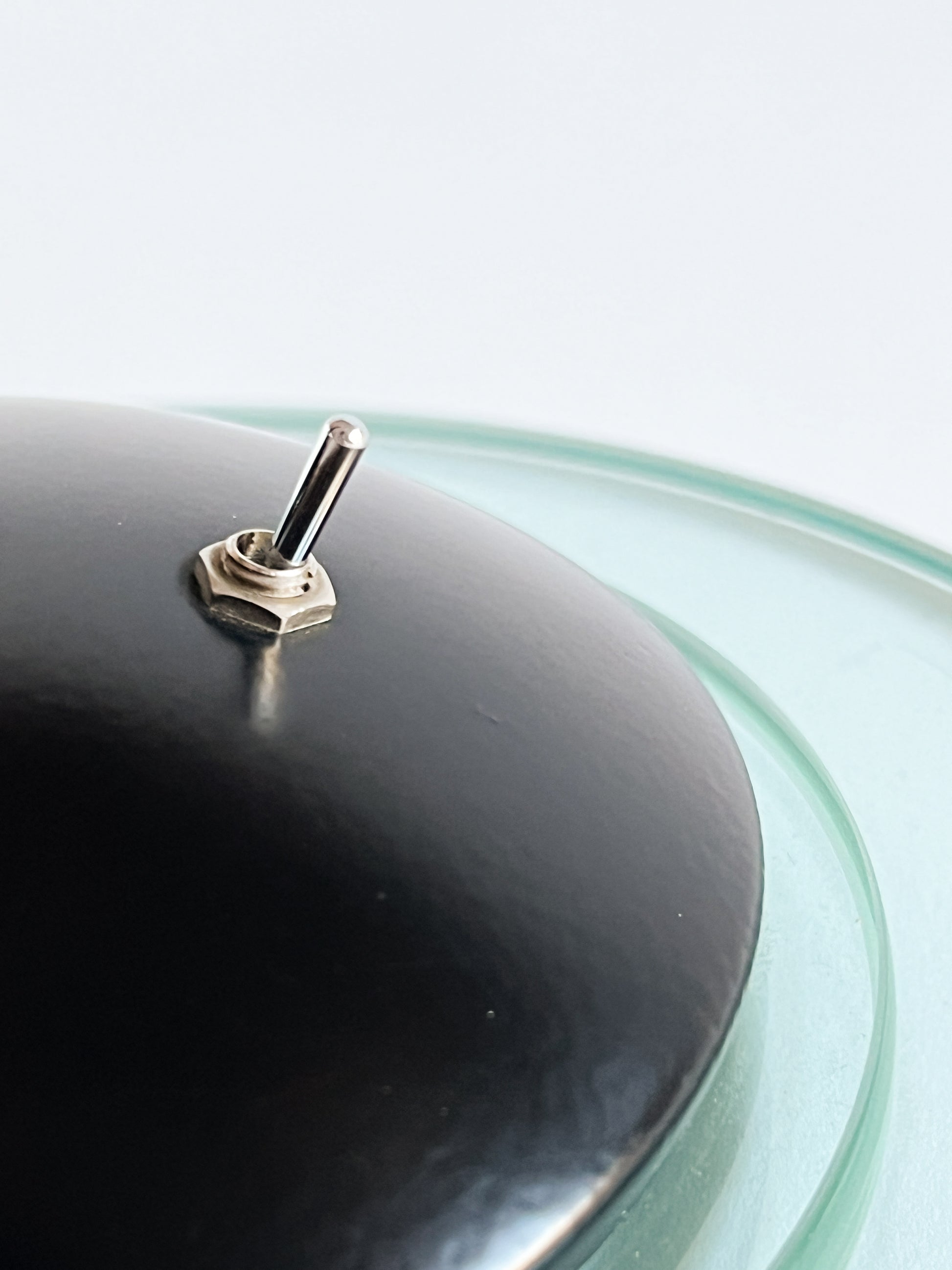 Dispune de un braț reglabil de culoare neagră și un cap cu un accent din sticlă cu tentă verde, așezat pe o bază circulară care ancorează piesa cu un aer minimalist.