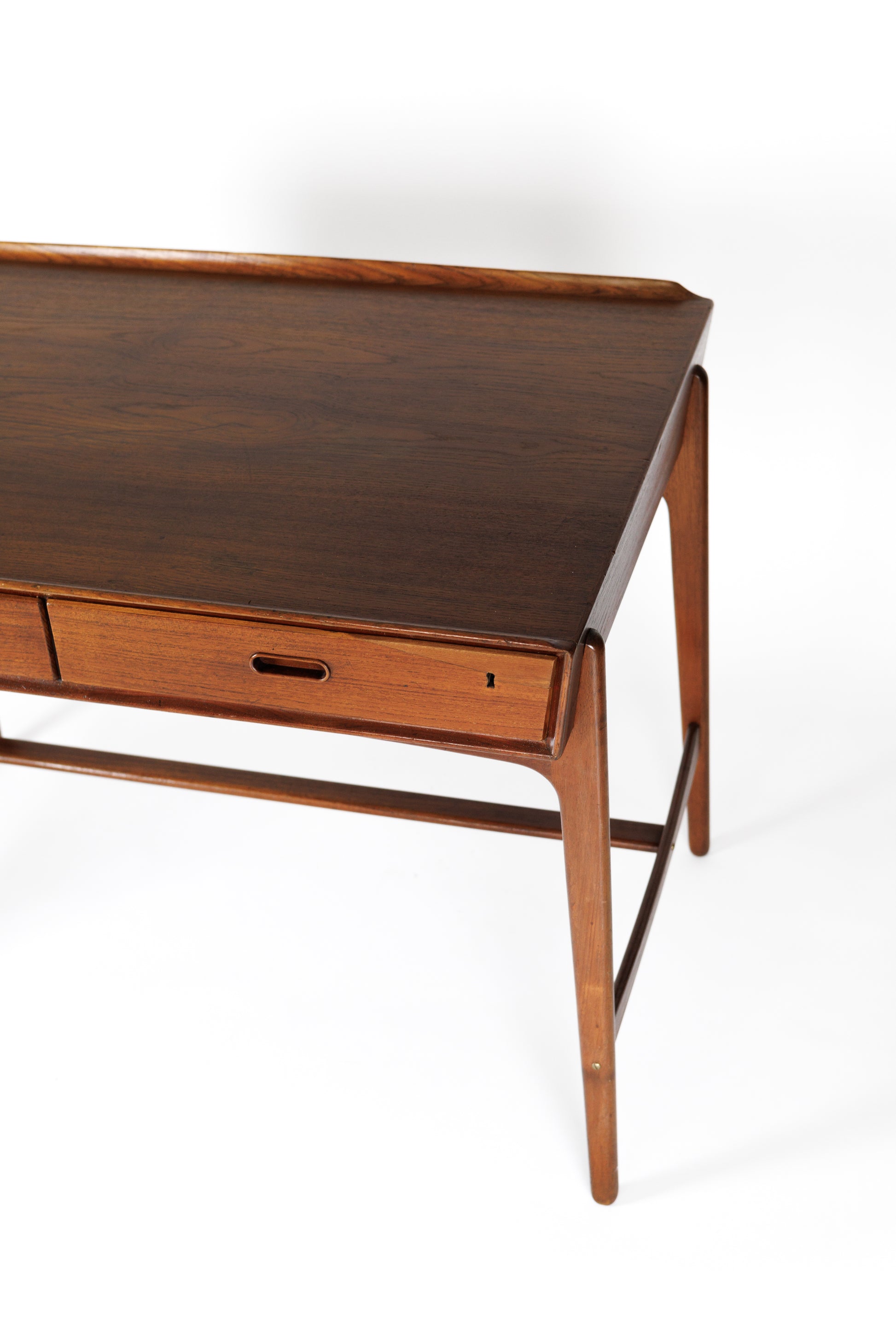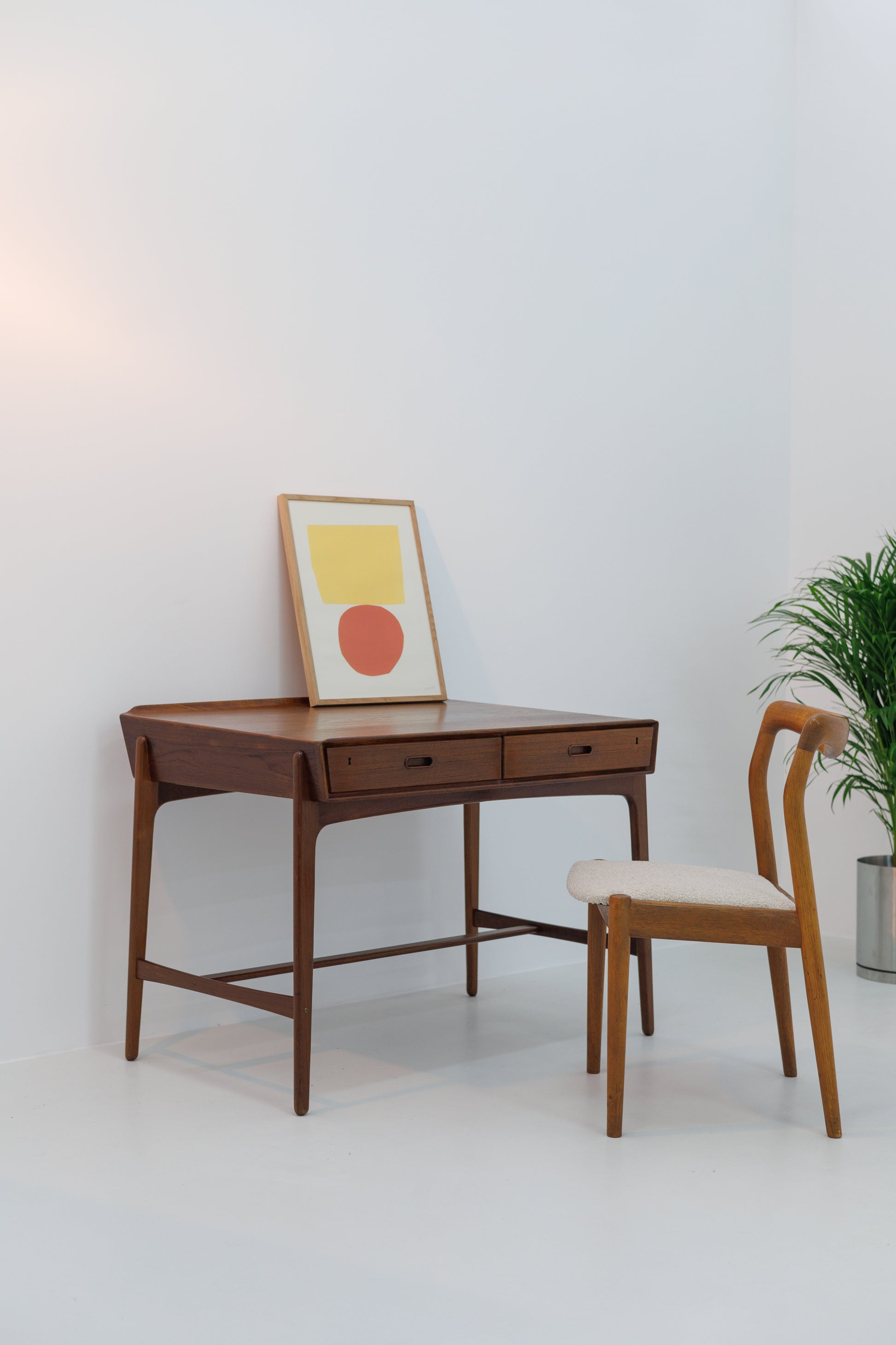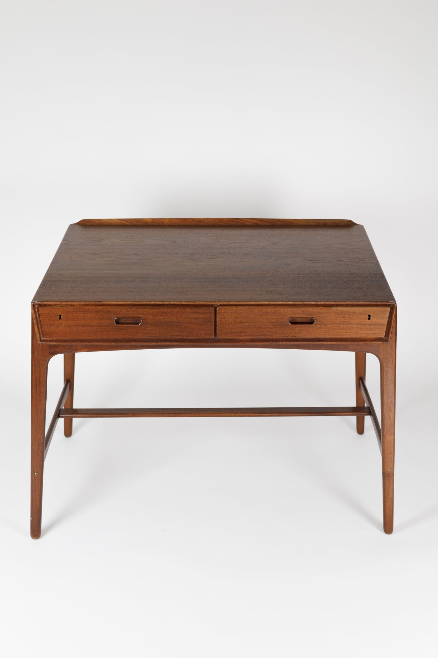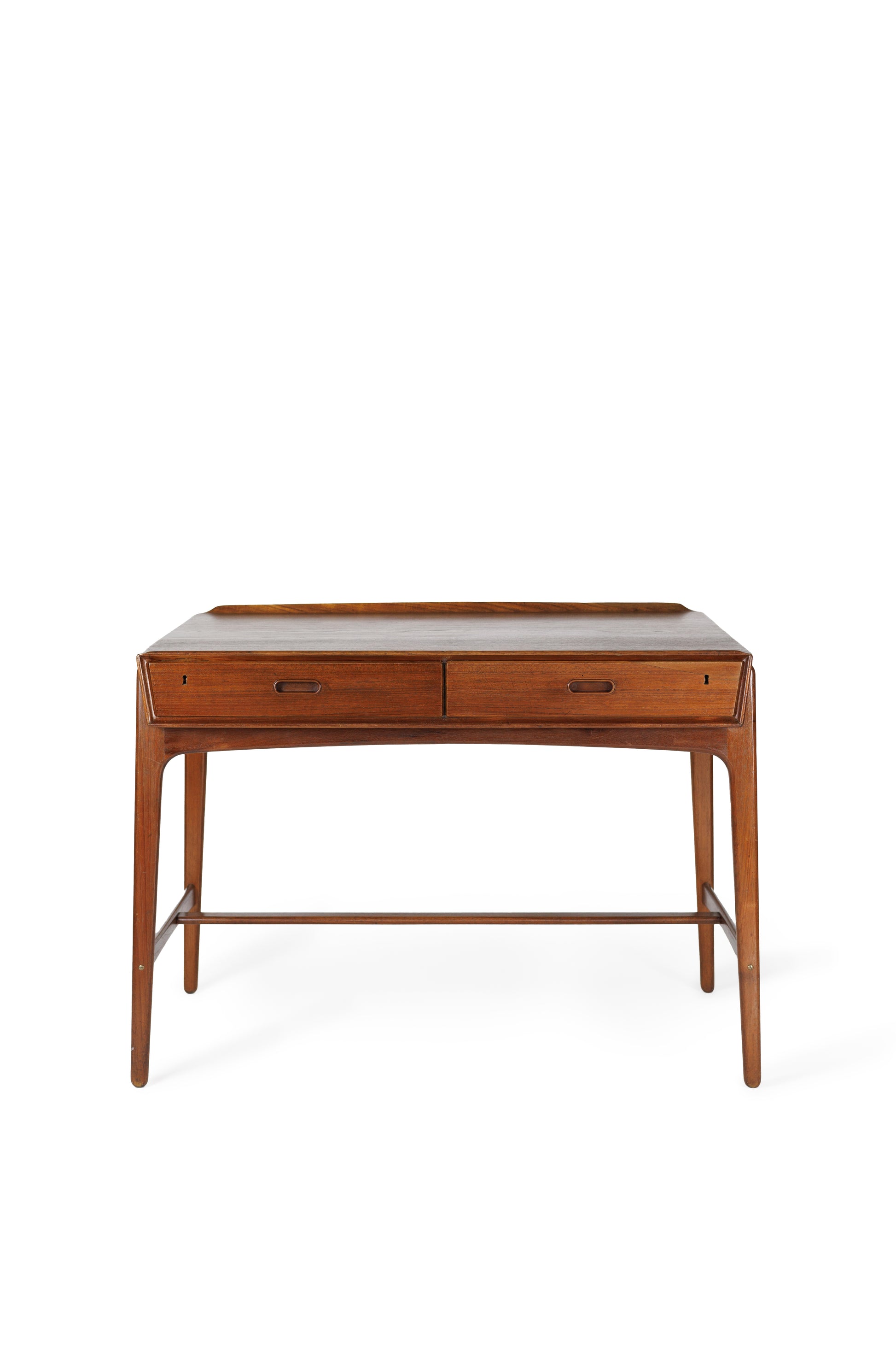 Svend Aage Madsen este renumit pentru birourile sale sculpturale, iar acest birou reflectă perfect stilul său distinctiv. Multe dintre designurile sale, inclusiv acesta, se remarcă printr-o suprafață curbată atrăgătoare, care oferă biroului un aspect concav unic. Picioarele conice — o trăsătură clasică a stilului modern de mijloc de secol — și sertarele spațioase pentru rechizite și alte obiecte, adaugă atât funcționalitate, cât și eleganță. Finisajele bogate din lemn și fibra vizibilă a acestuia contribuie la farmecul atemporal al acestor piese robuste.