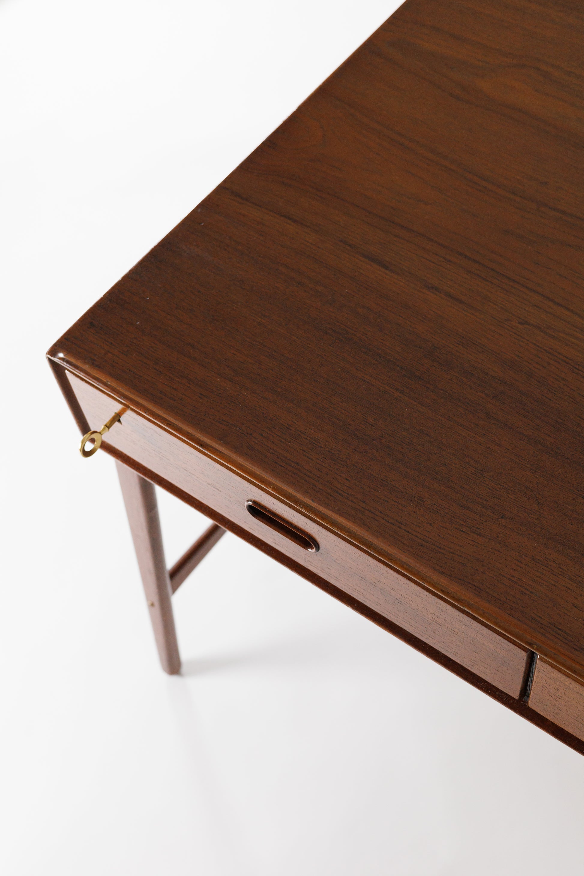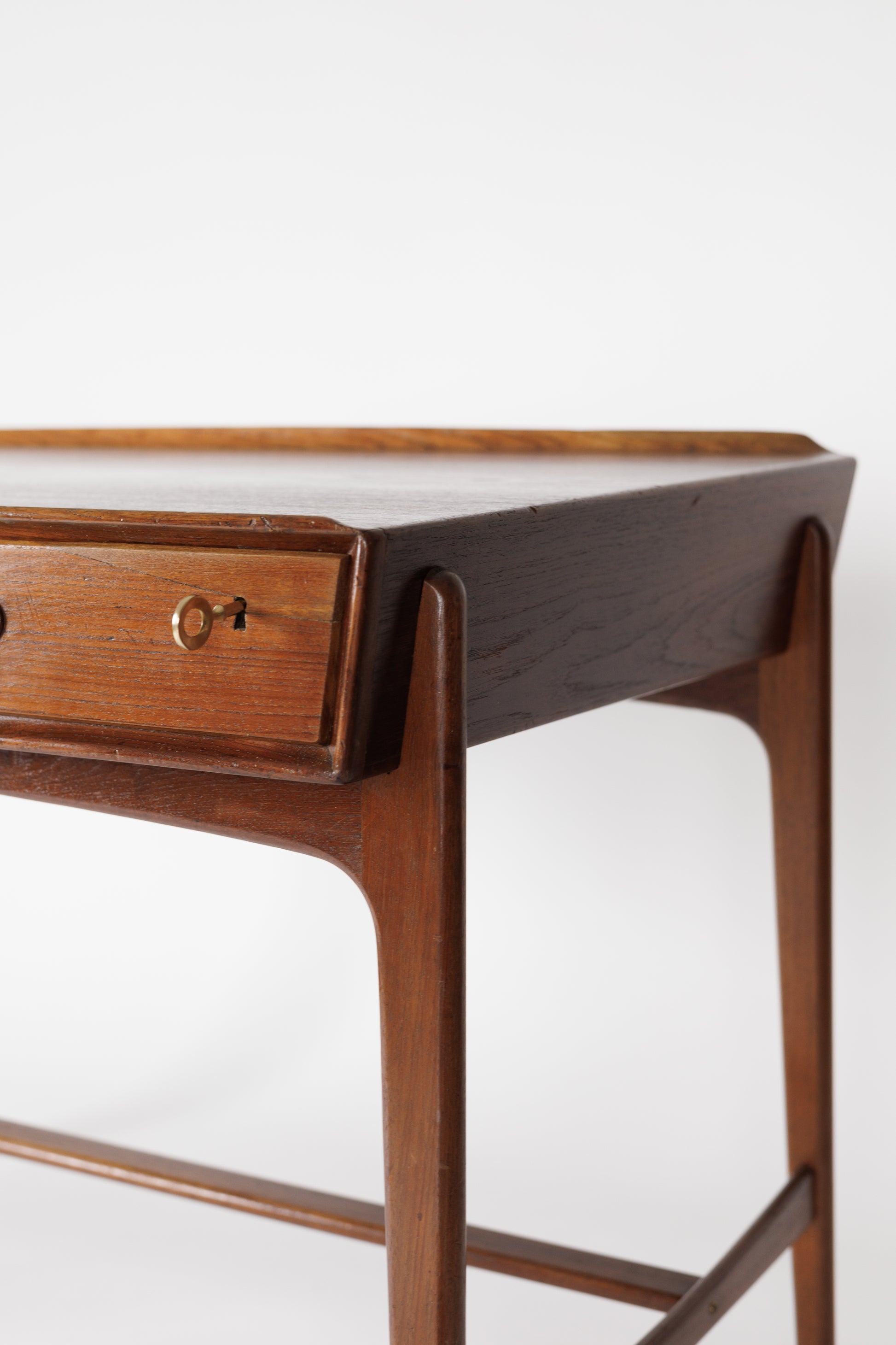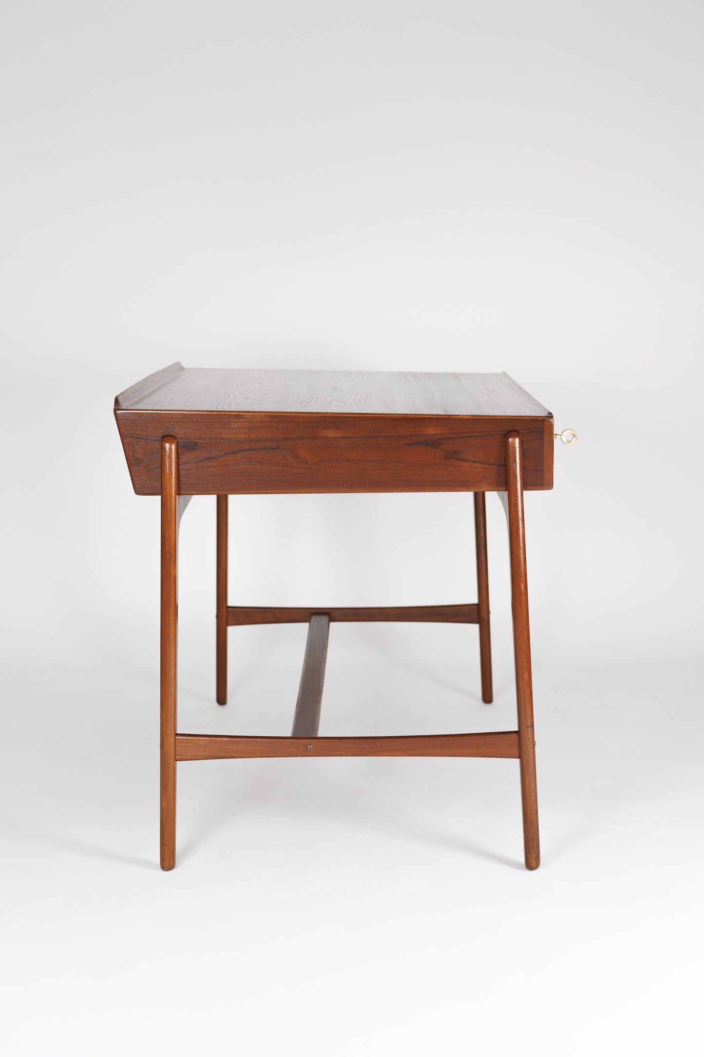 Svend Aage Madsen este renumit pentru birourile sale sculpturale, iar acest birou reflectă perfect stilul său distinctiv. Multe dintre designurile sale, inclusiv acesta, se remarcă printr-o suprafață curbată atrăgătoare, care oferă biroului un aspect concav unic. Picioarele conice — o trăsătură clasică a stilului modern de mijloc de secol — și sertarele spațioase pentru rechizite și alte obiecte, adaugă atât funcționalitate, cât și eleganță. Finisajele bogate din lemn și fibra vizibilă a acestuia contribuie la farmecul atemporal al acestor piese robuste.