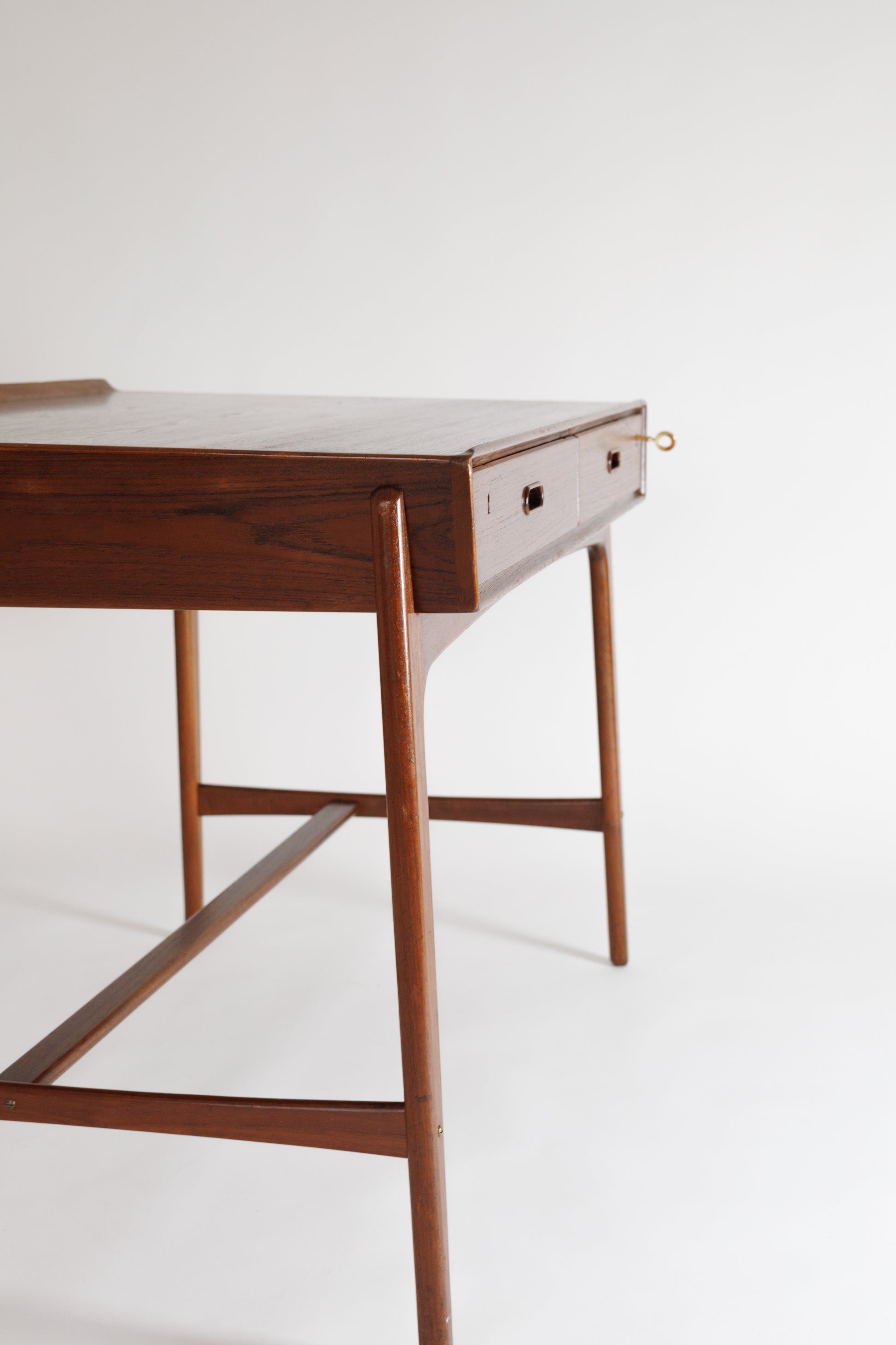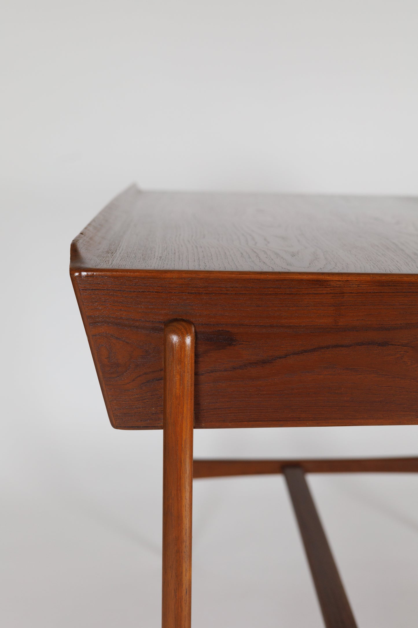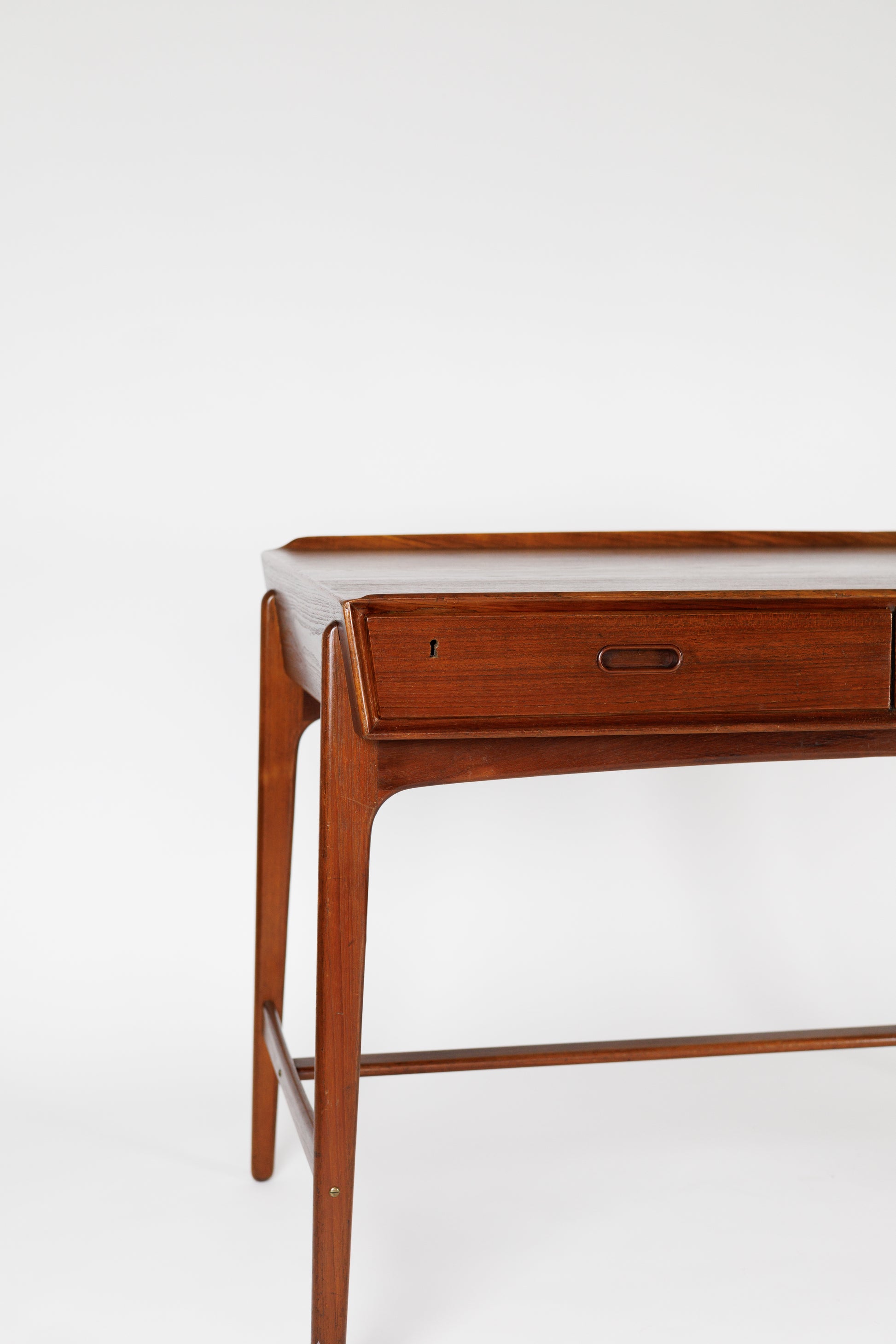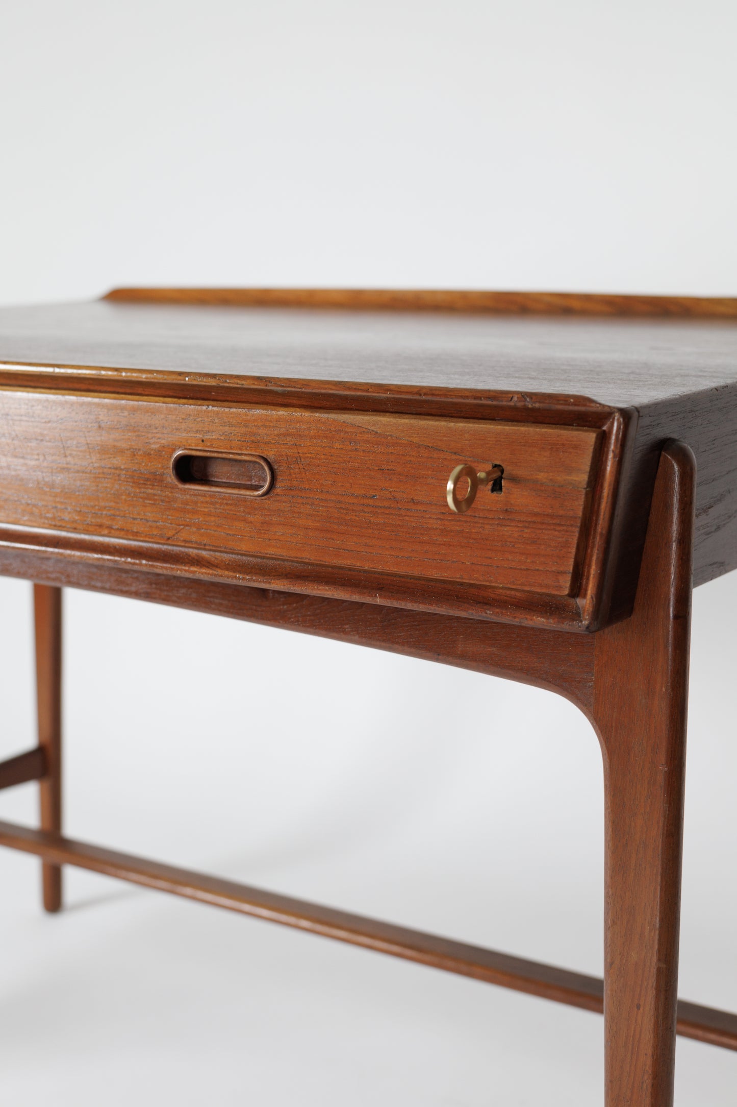 Svend Aage Madsen este renumit pentru birourile sale sculpturale, iar acest birou reflectă perfect stilul său distinctiv. Multe dintre designurile sale, inclusiv acesta, se remarcă printr-o suprafață curbată atrăgătoare, care oferă biroului un aspect concav unic. Picioarele conice — o trăsătură clasică a stilului modern de mijloc de secol — și sertarele spațioase pentru rechizite și alte obiecte, adaugă atât funcționalitate, cât și eleganță. Finisajele bogate din lemn și fibra vizibilă a acestuia contribuie la farmecul atemporal al acestor piese robuste.