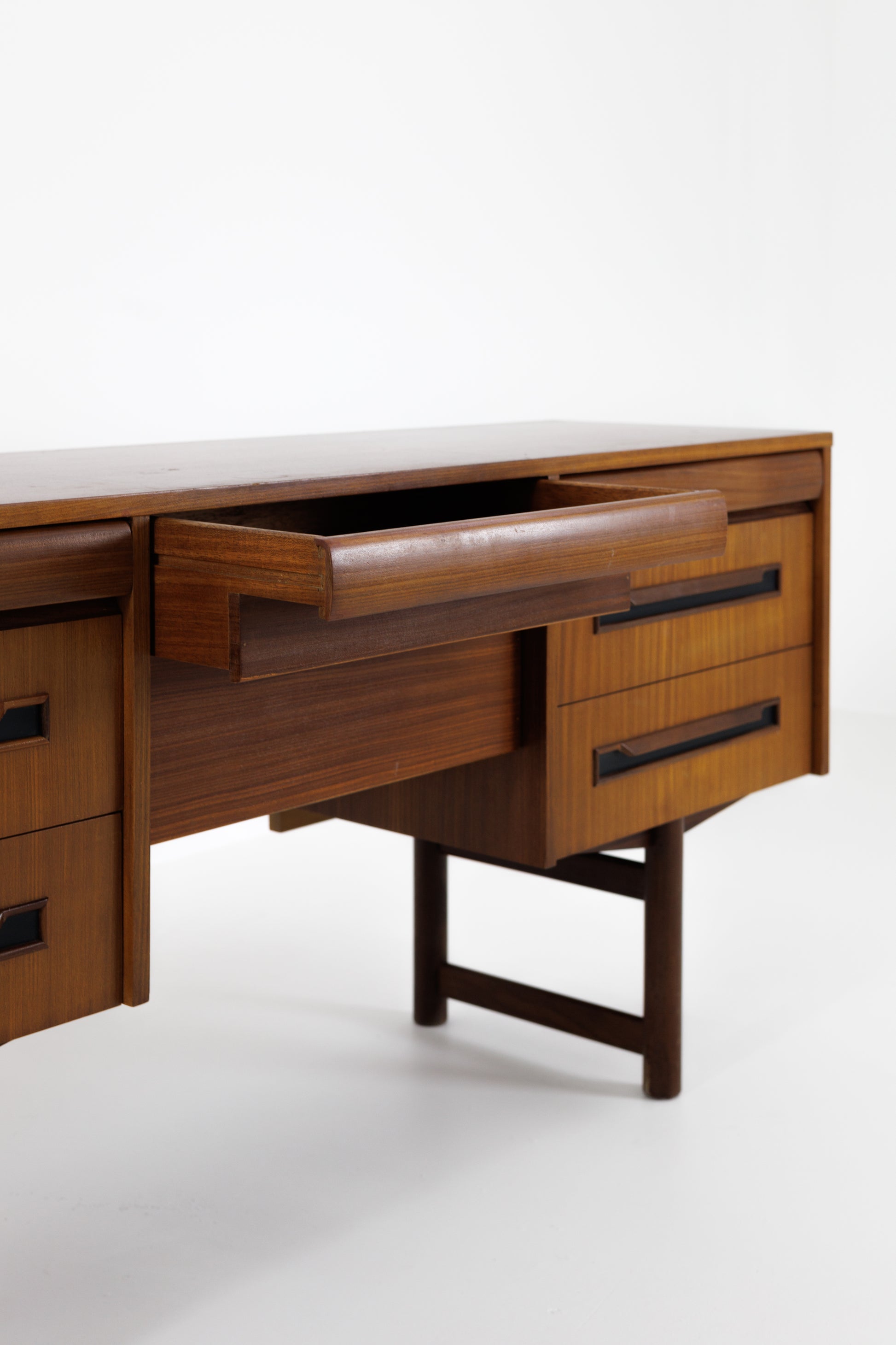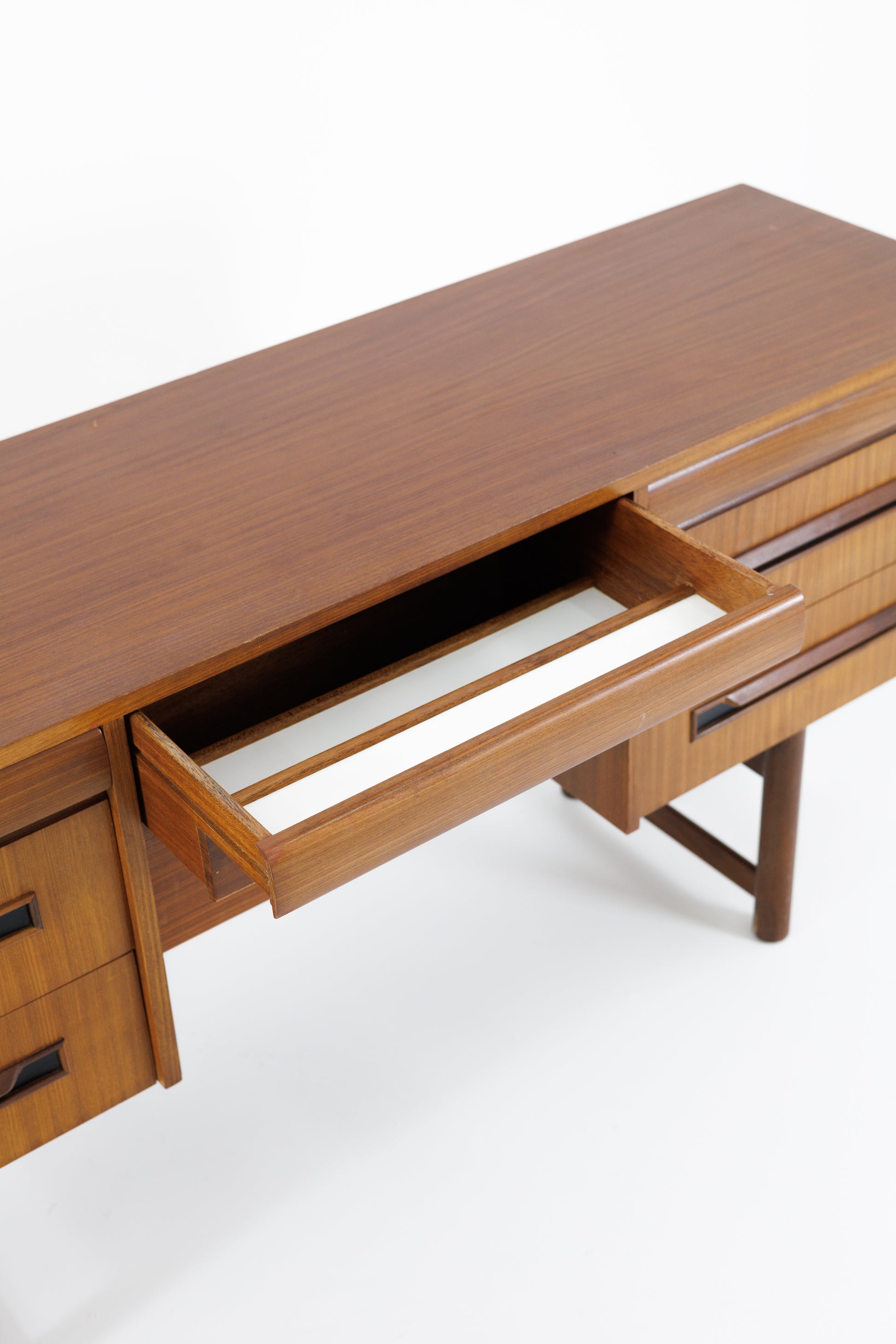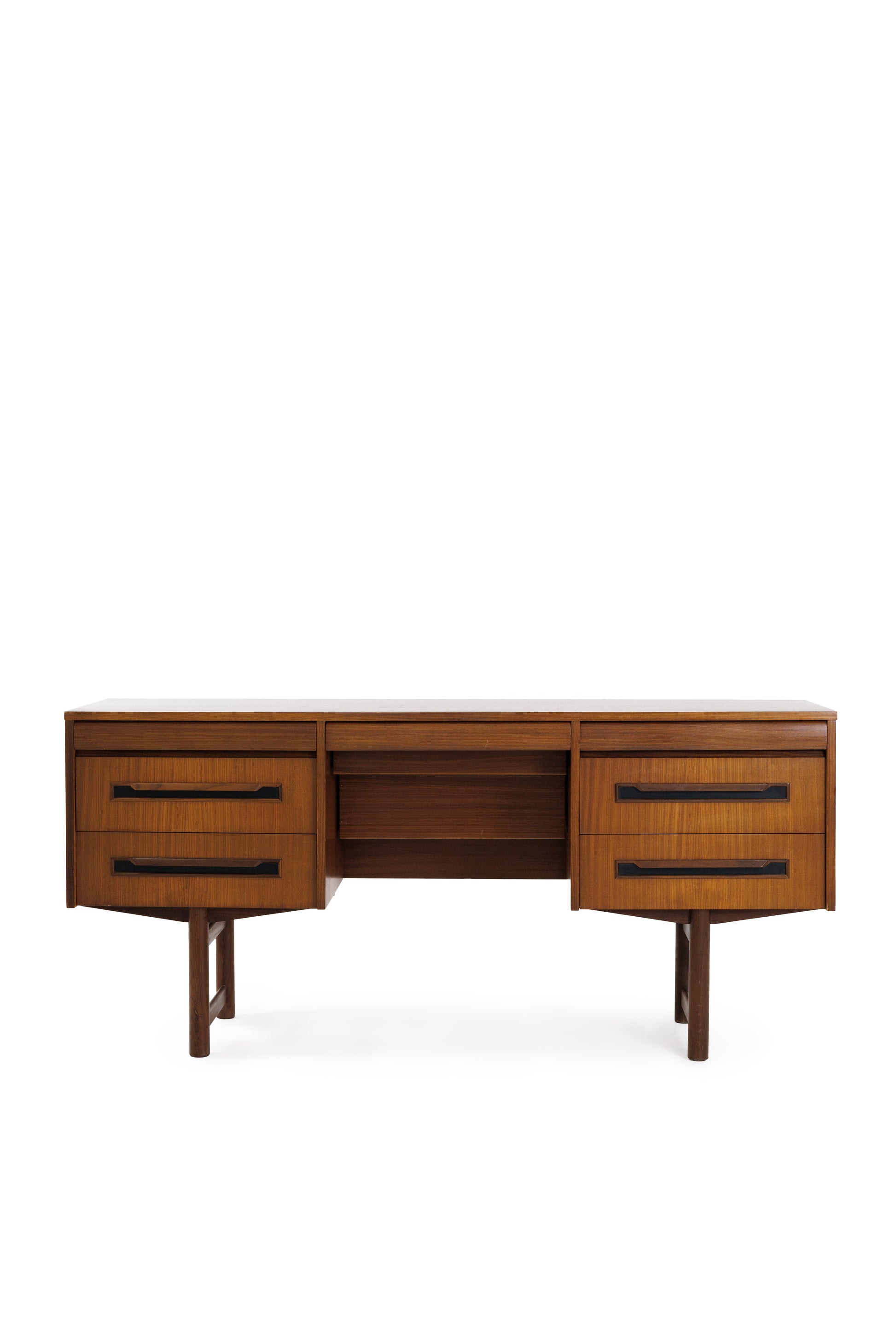 Acesta este un birou vintage din Anglia, din anii 1960, care exemplifică perfect designul modern de mijloc de secol, cu linii simple și o eleganță funcțională. Realizat din lemn cu tonuri calde și bogate, biroul are o dispunere simetrică bine echilibrată.