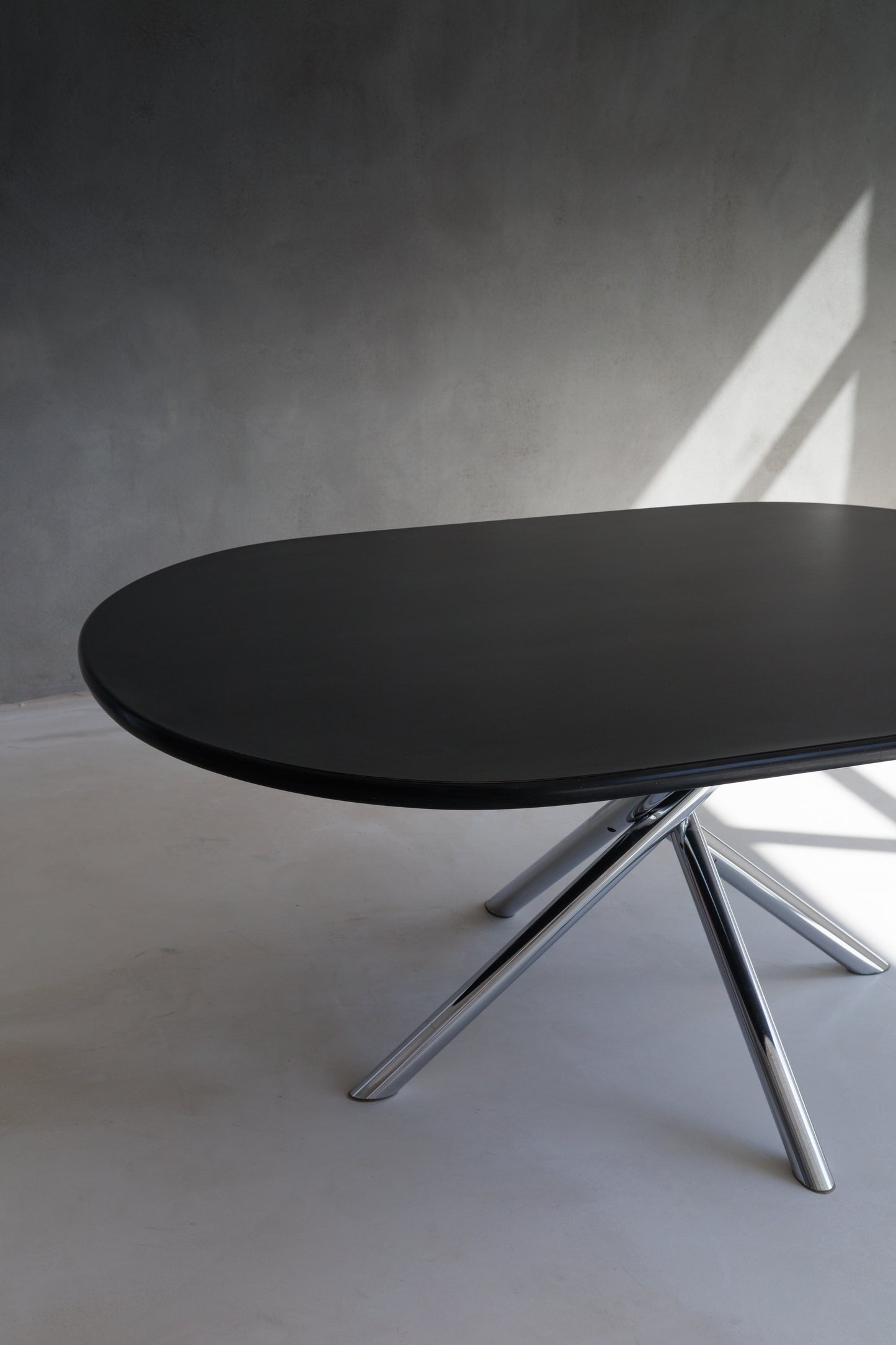 The most distinctive element is the table’s tubular metal base, where rounded steel legs intersect at the center and taper outward — a visual “knot” that gives the piece its name. The oval tabletop is crafted from black painted wood, framed by a soft rubber edge profile that adds both tactility and edge protection. The chairs complement the table’s bold lines with their tall, linear backrests and continuous metal framing — sculptural and elegant in equal measure.
