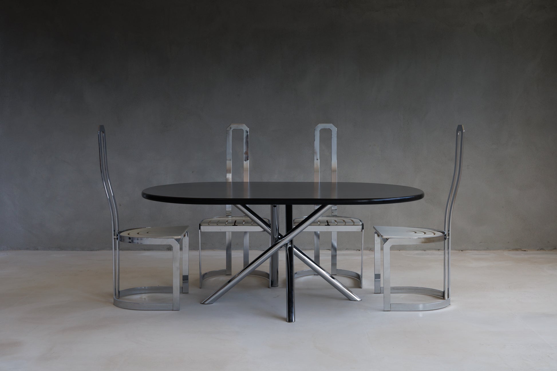 The set features the Nodo dining table, designed by Carlo Bartoli and produced by Tisettanta in the 1970s, paired with four high-back postmodern dining chairs in polished metal. Together, they form a striking composition where balance, material contrast, and sculptural intent are at the forefront.
