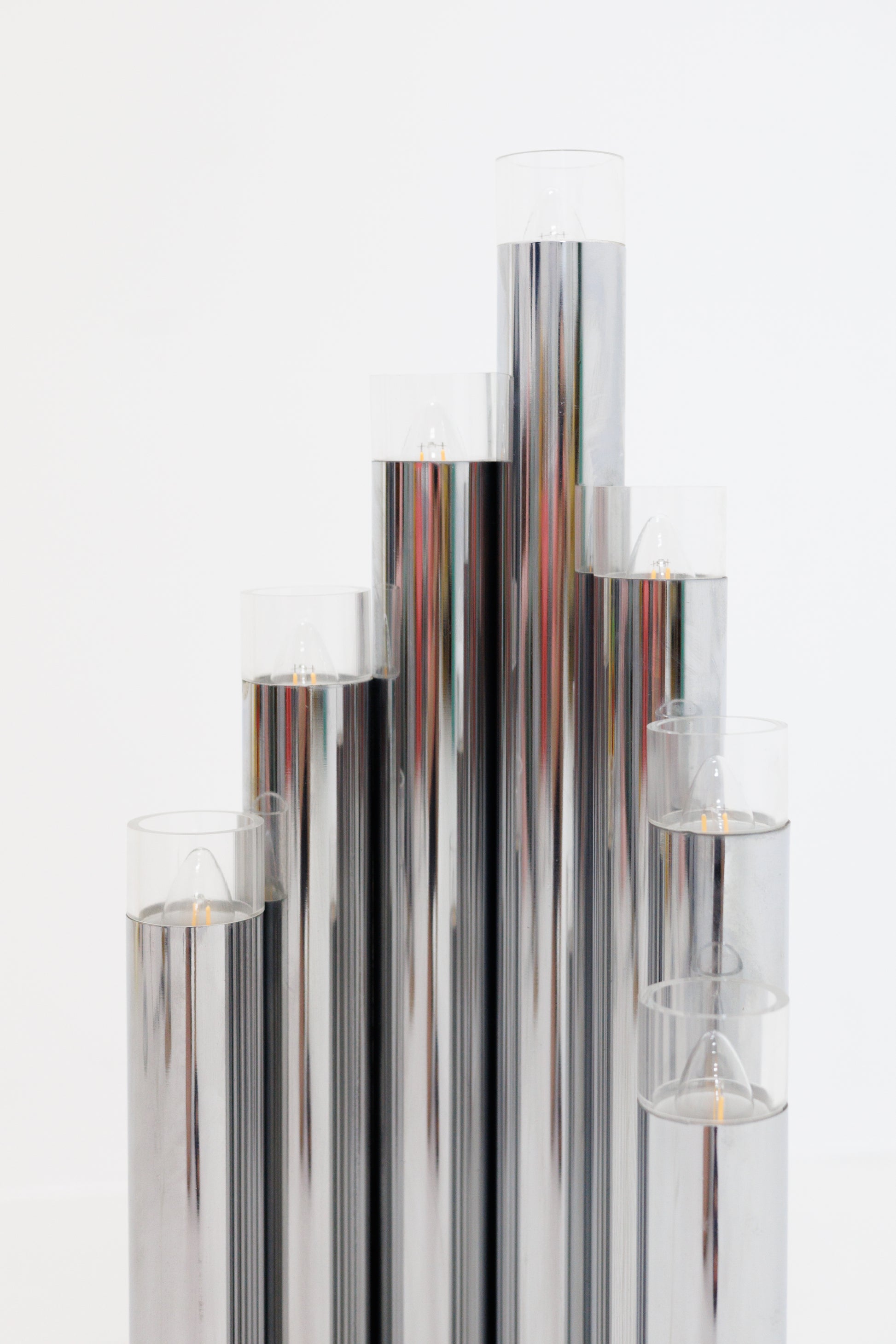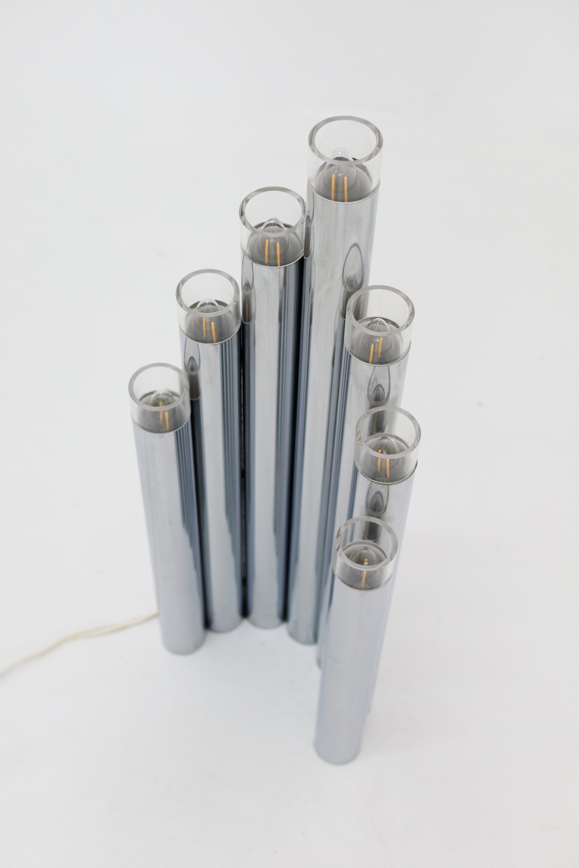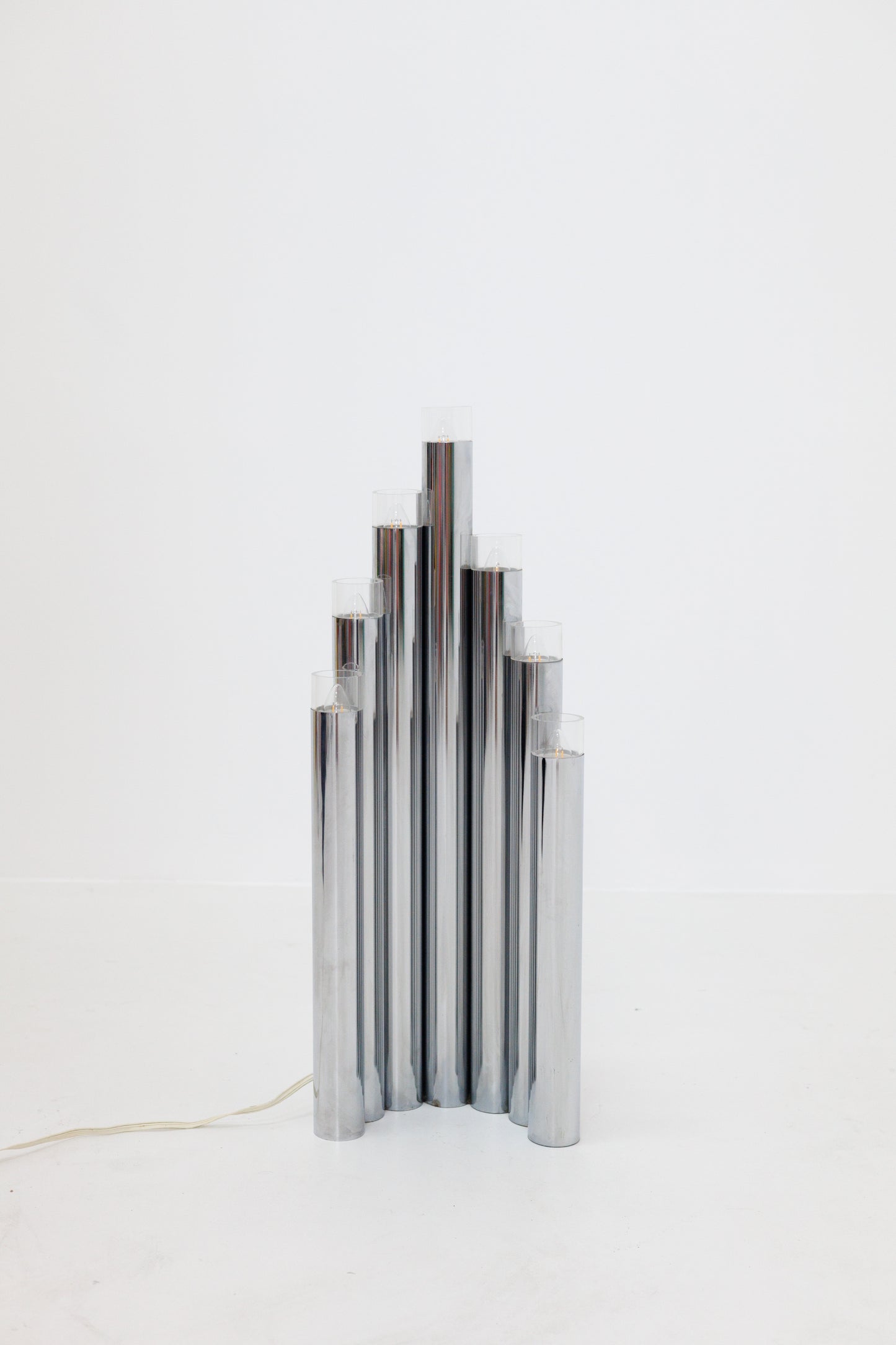 Vă prezentăm o piesă rară și colecționabilă din anii 1970: lampa de podea Space Age, creată de renumitul designer italian Goffredo Reggiani. Cu un design futurist, inspirat de un orgă, această lampă are tuburi elegante din crom, fiecare terminându-se cu o lumină strălucitoare.