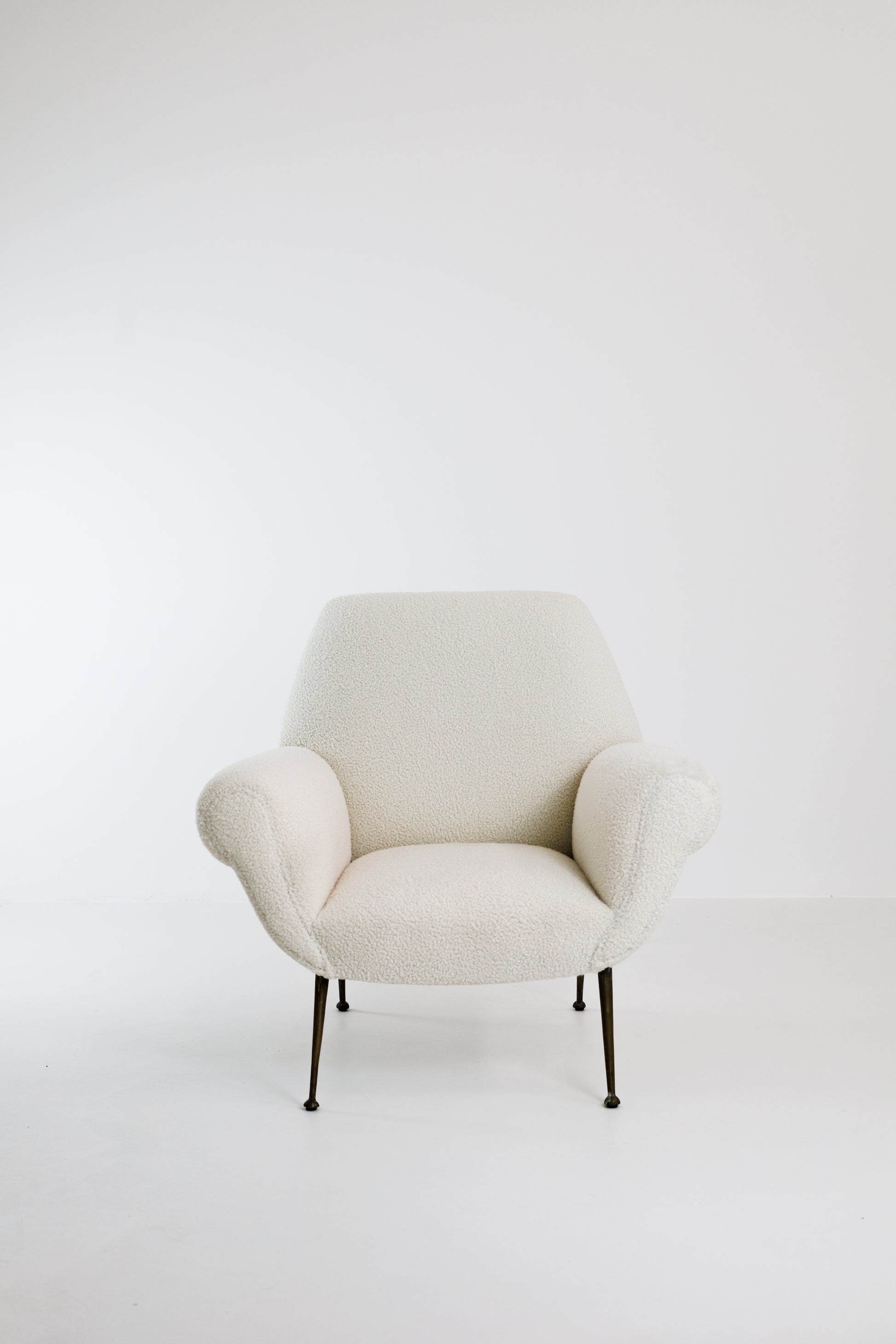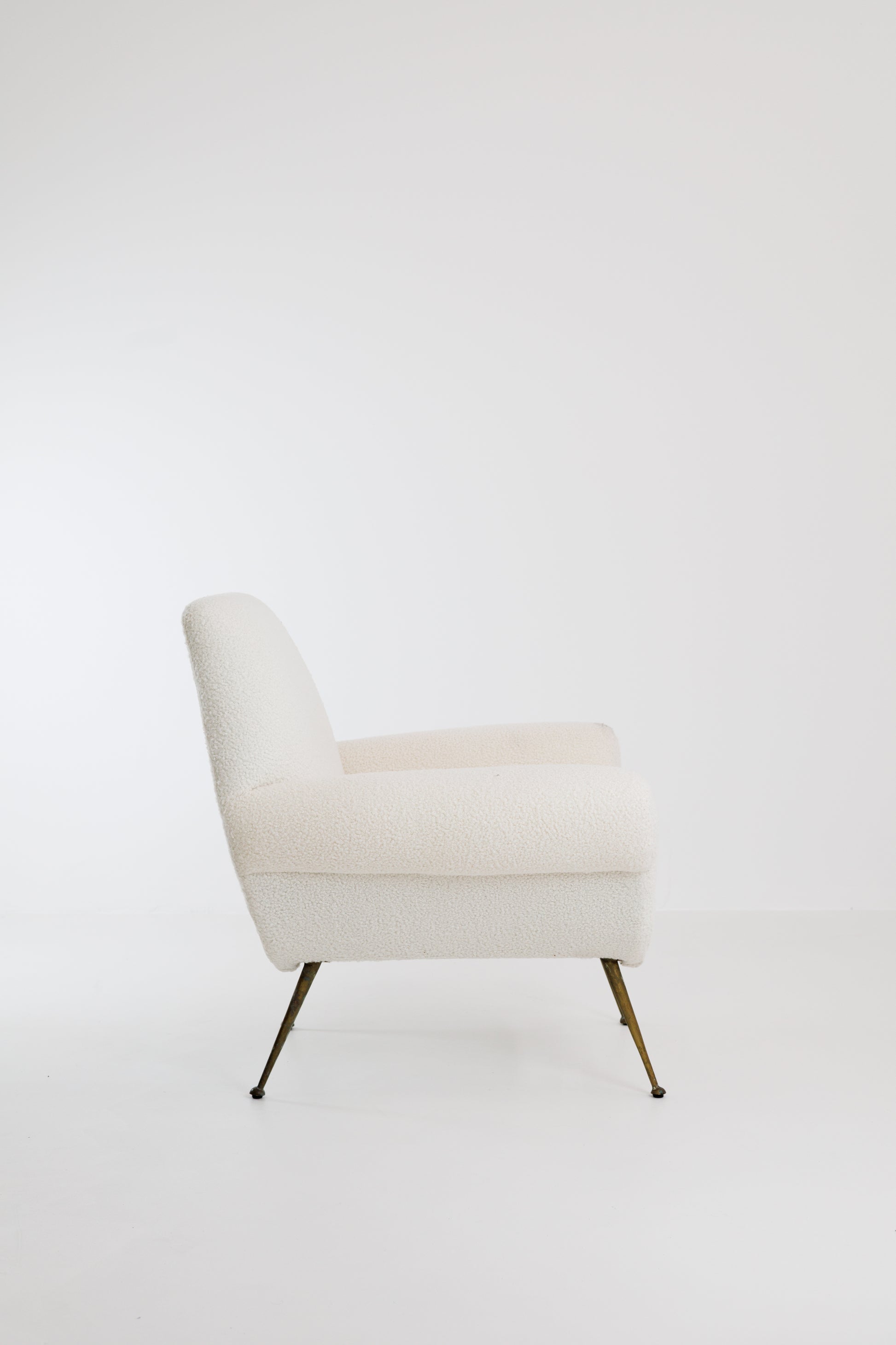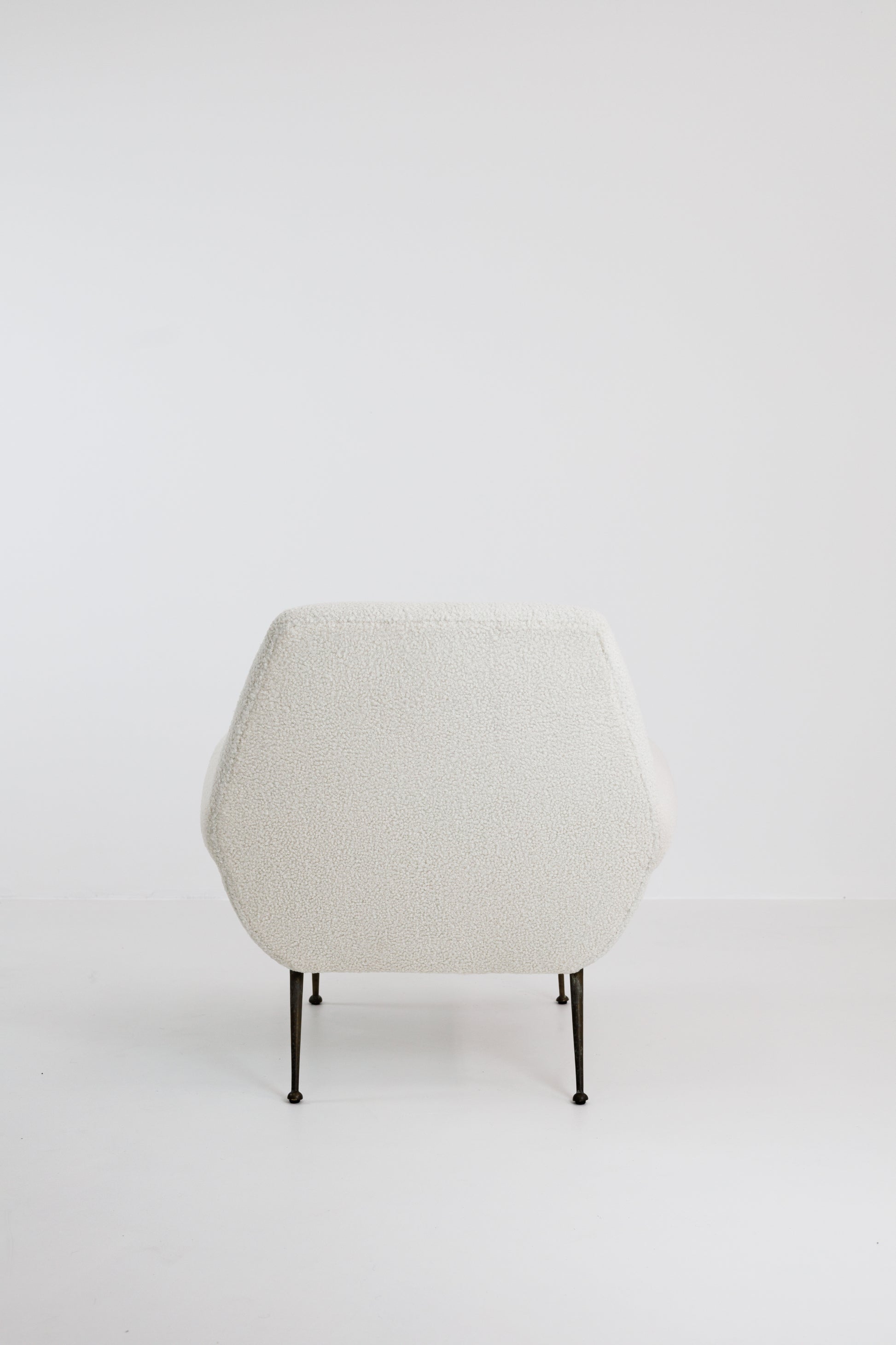 Retapițat cu stofă bouclé din lână de culoare crem, având picioare originale din fier și capete din alamă.
