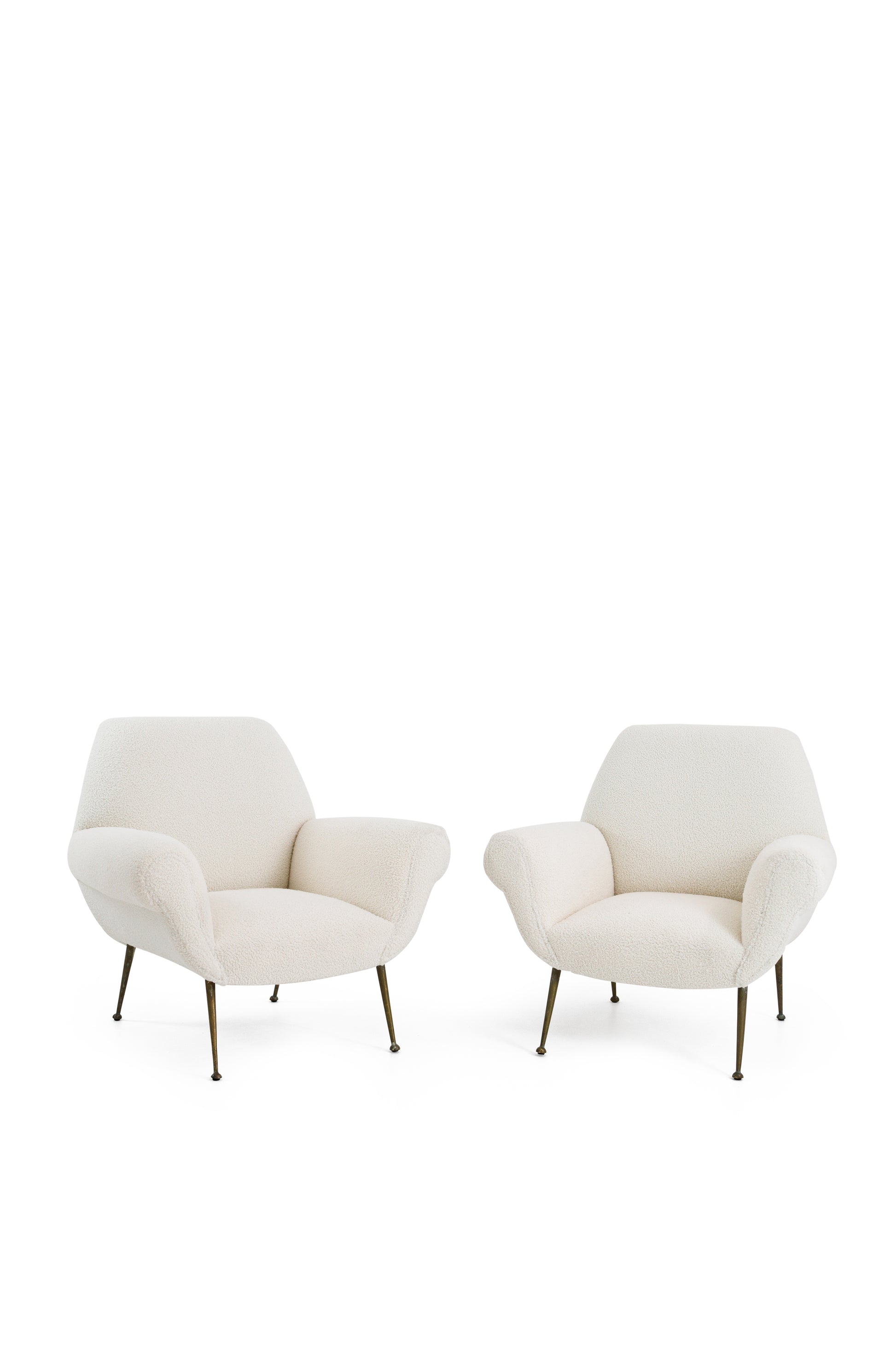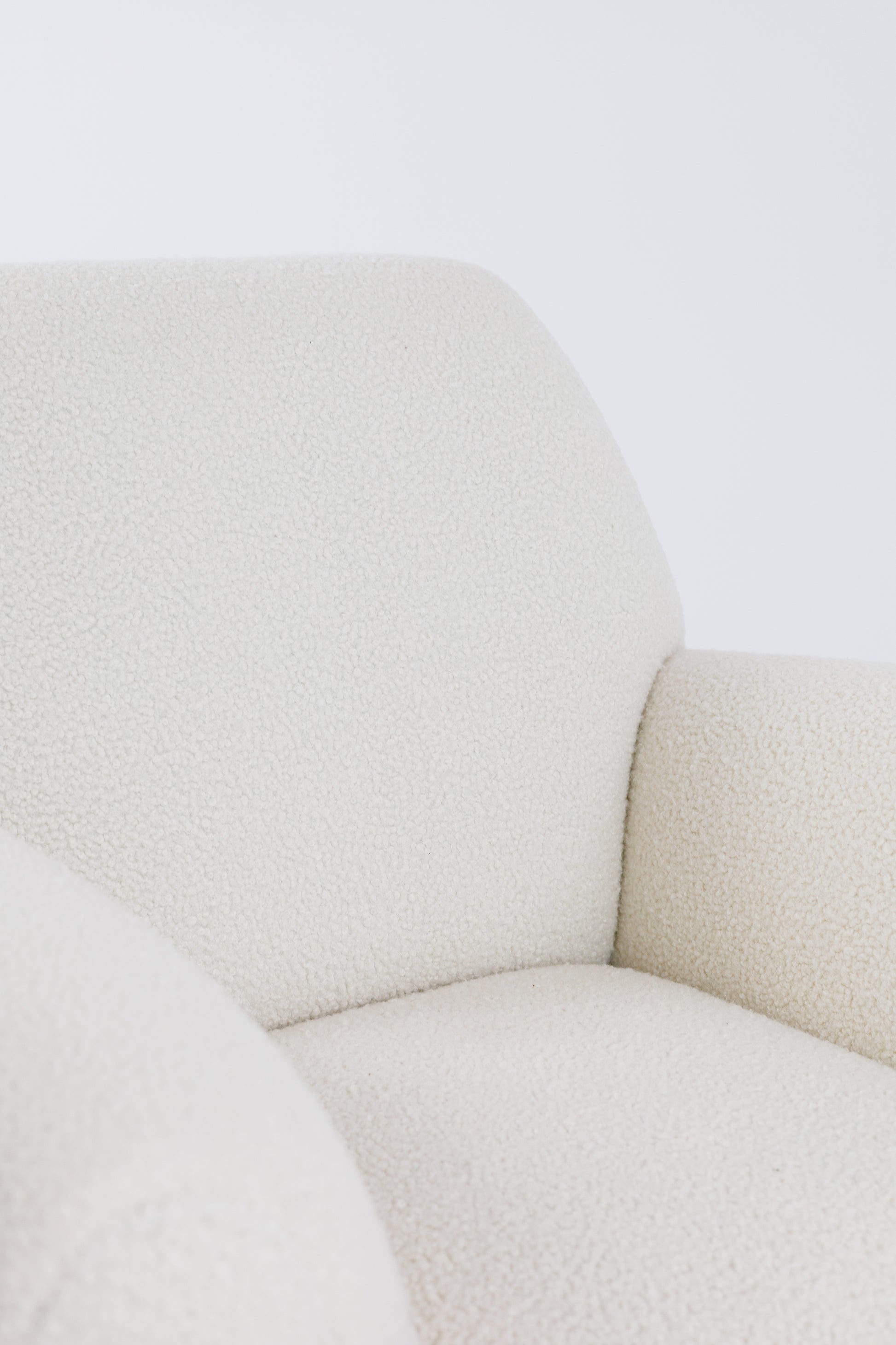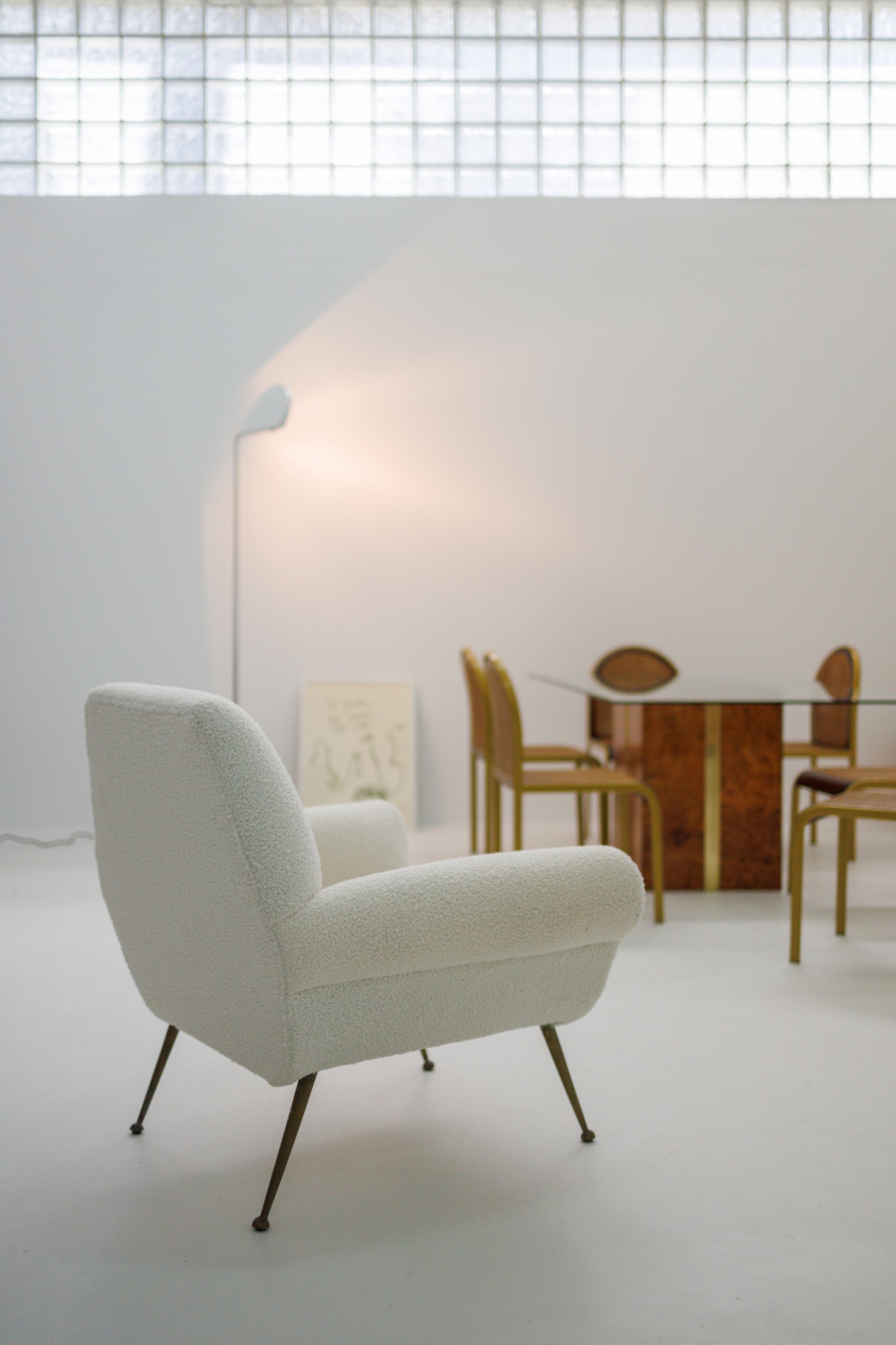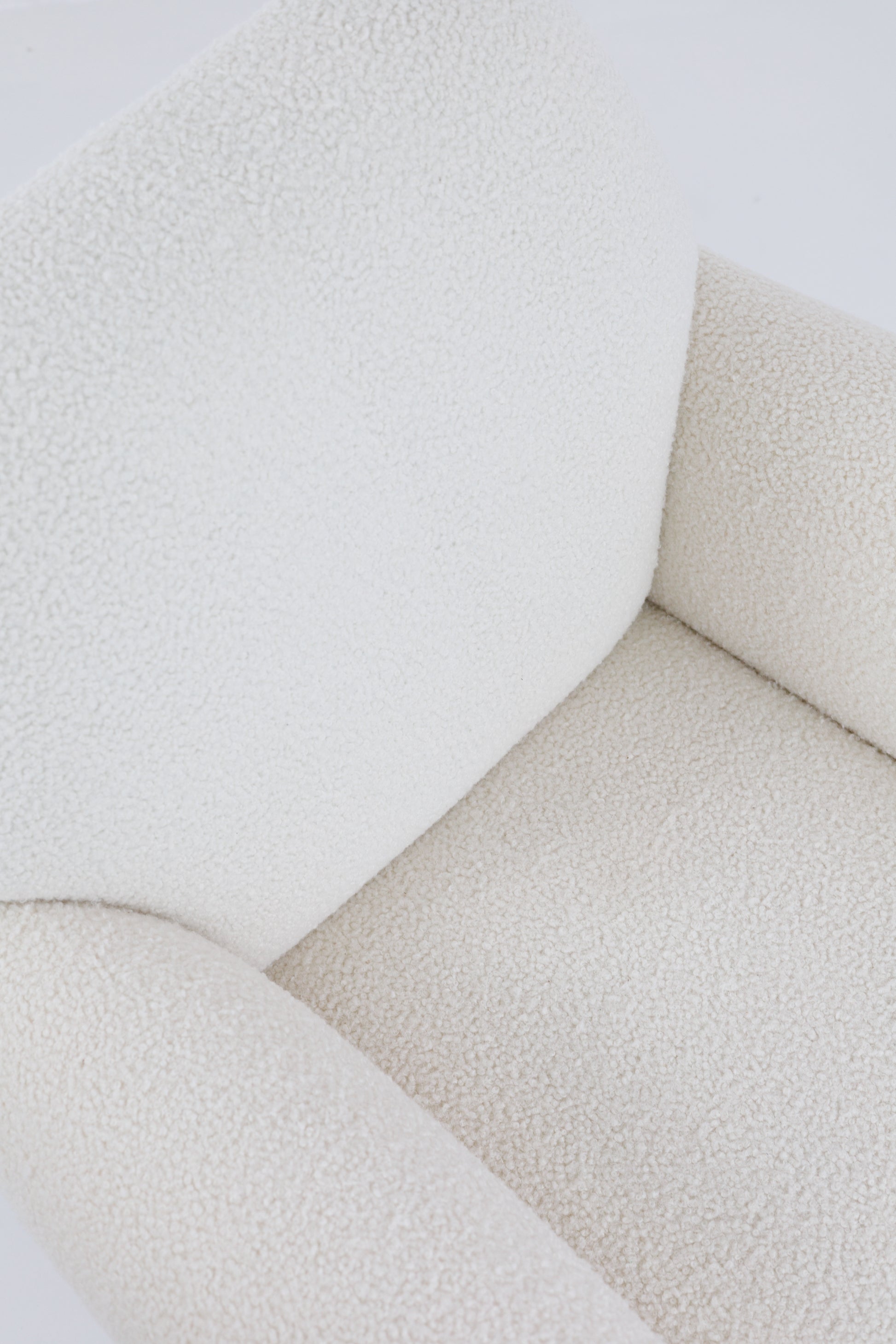 Retapițat cu stofă bouclé din lână de culoare crem, având picioare originale din fier și capete din alamă.