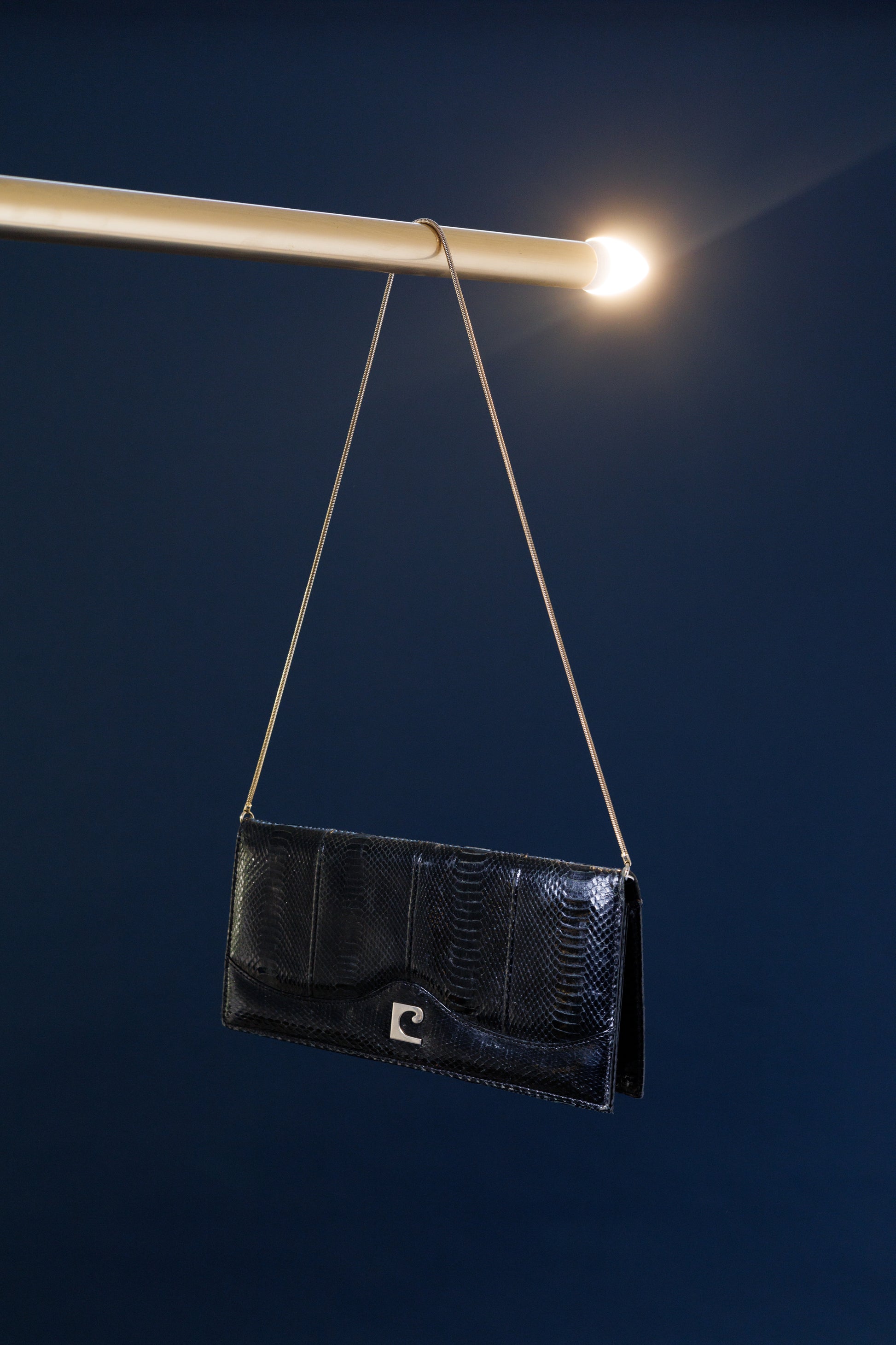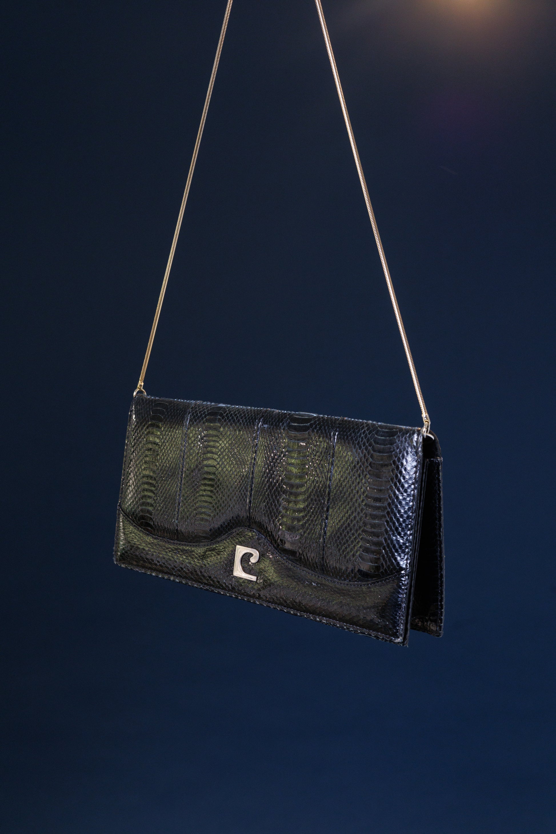This elegant vintage clutch bag from the 1980s is a stunning piece from renowned designer Pierre Cardin. Crafted from black snakeskin-embossed leather, it features a sleek structured silhouette, a silver-tone logo clasp, and a delicate shoulder chain for versatile styling. A timeless statement accessory that embodies Cardin's futuristic yet sophisticated design aesthetic.