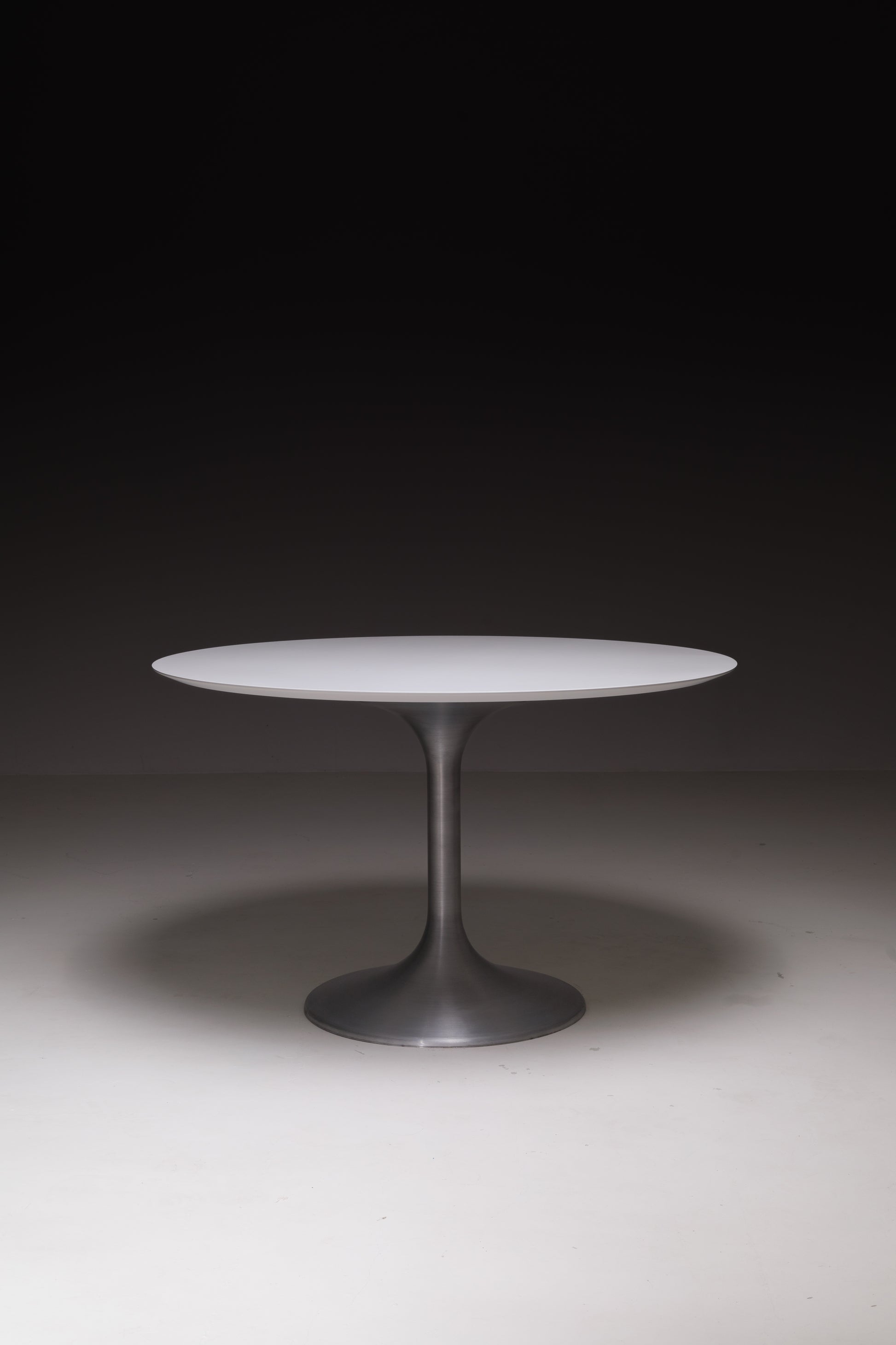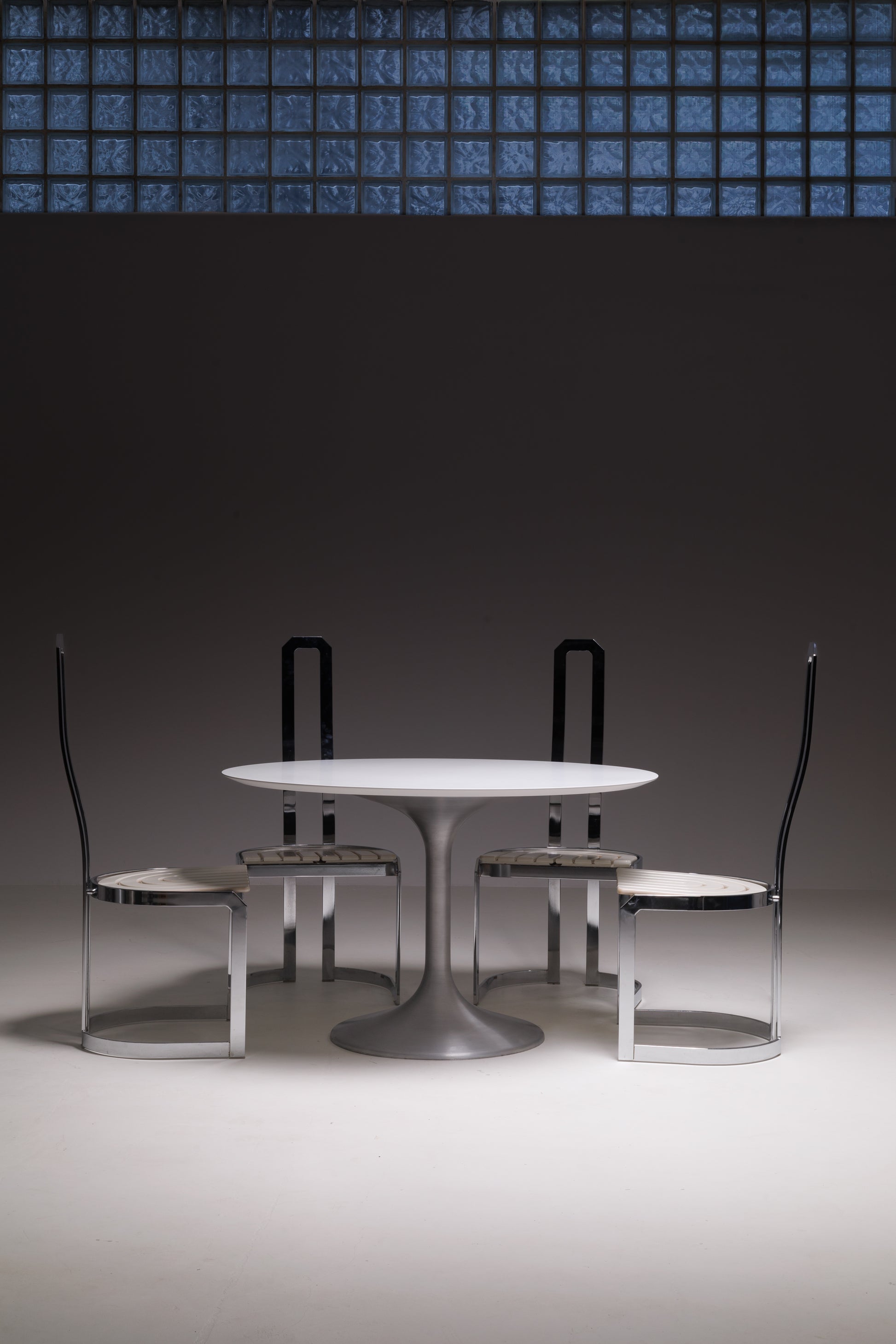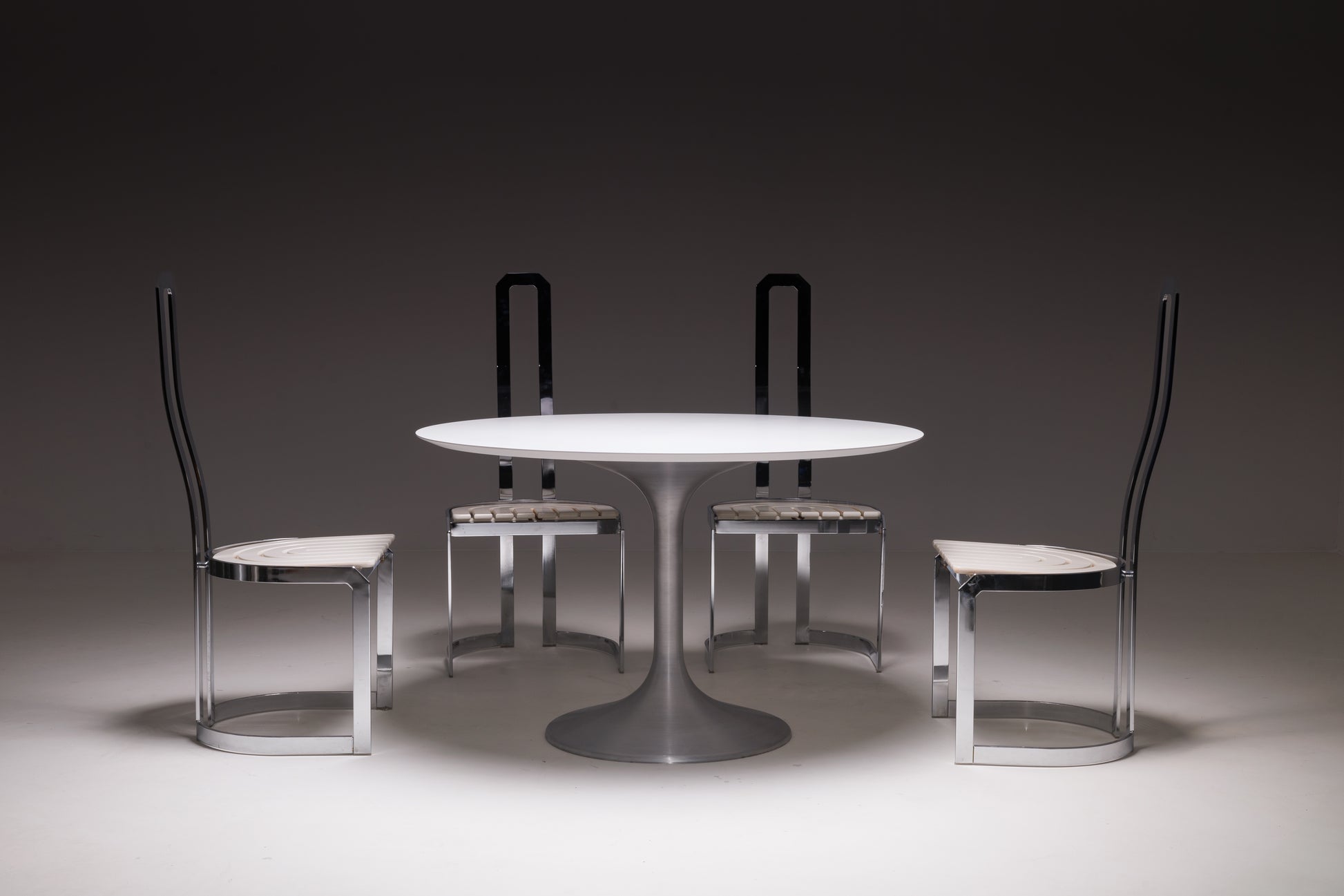 This striking postmodern dining set masterfully blends industrial elements with refined elegance. The cool, polished metal of the chairs creates a bold contrast with the warm, white wood seating, making this set a statement piece for any modern interior.