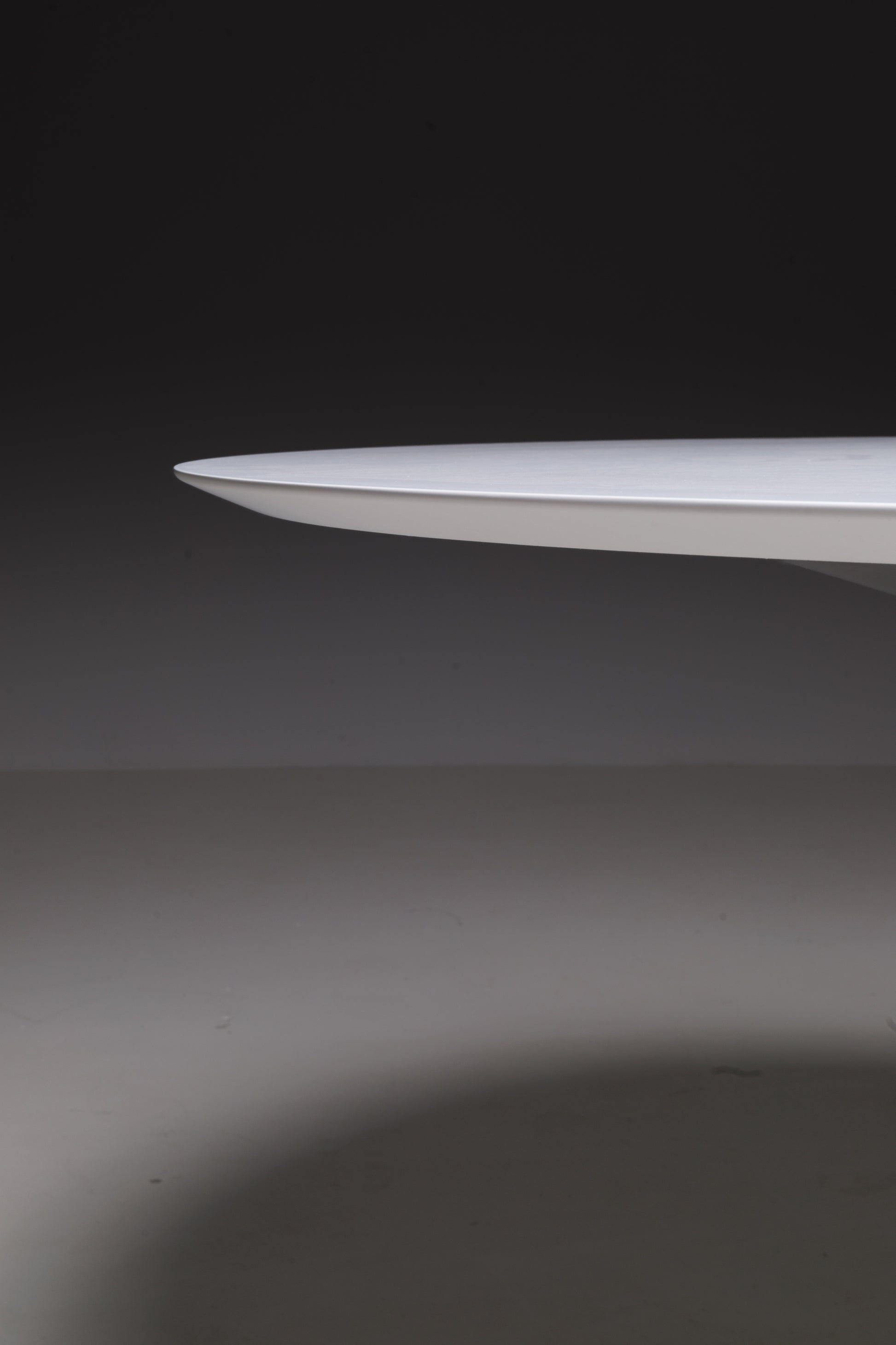 At its center, the Agarico Table, designed by Vida Beppe for NY Form, stands out with its sculptural presence. Its smooth, curved pedestal base and sleek white tabletop create a seamless, fluid aesthetic that enhances the set’s modern appeal.