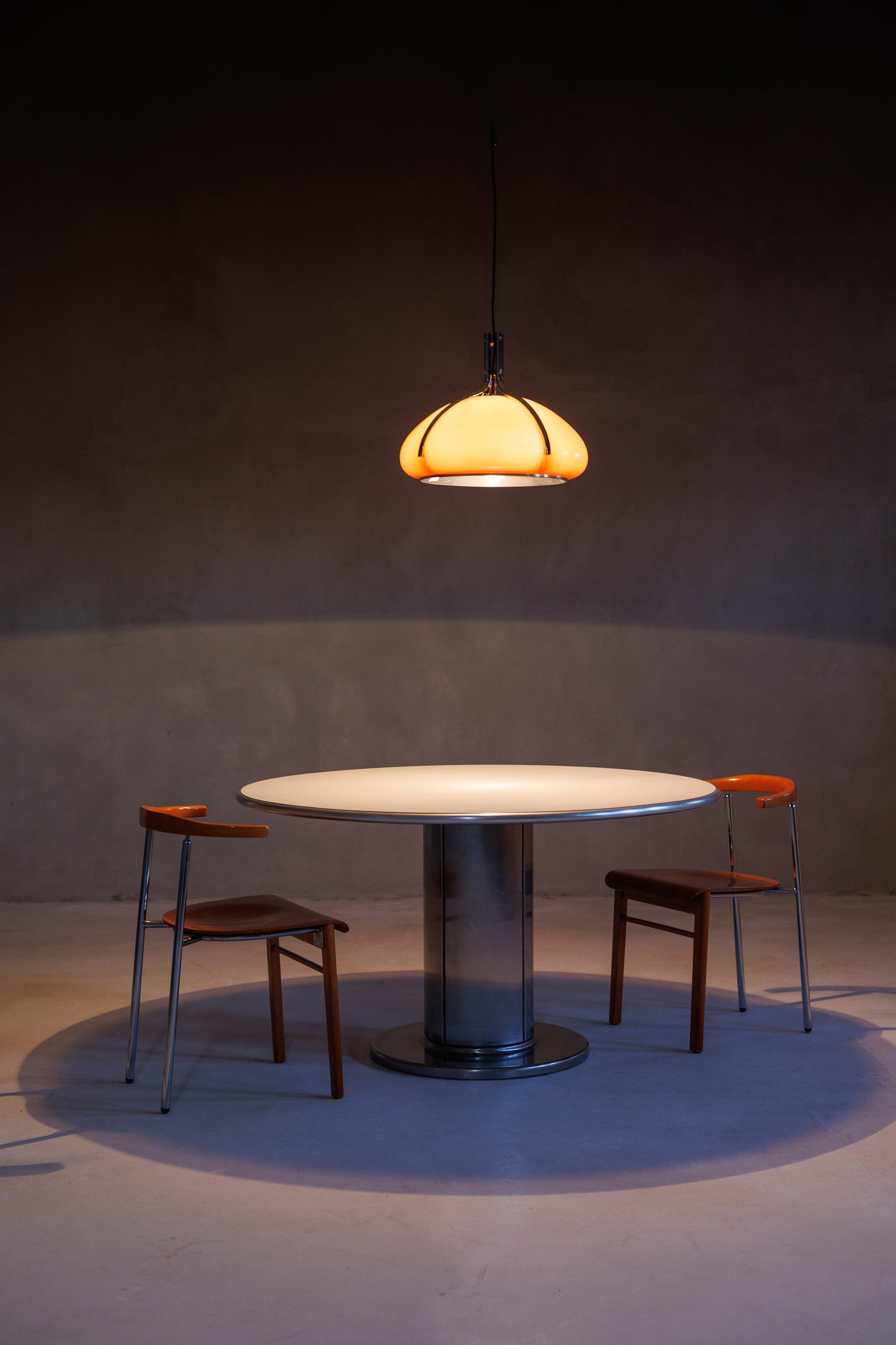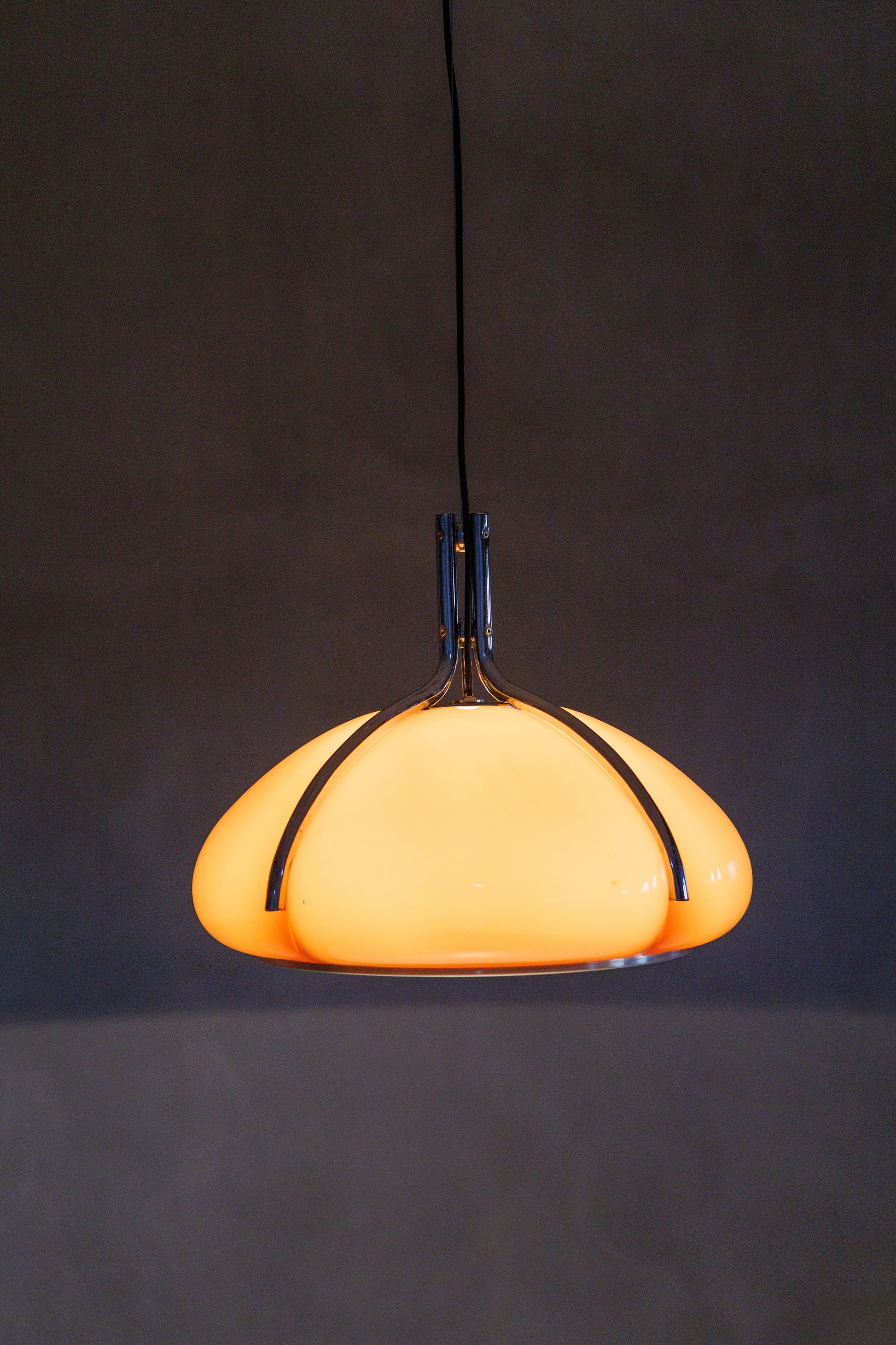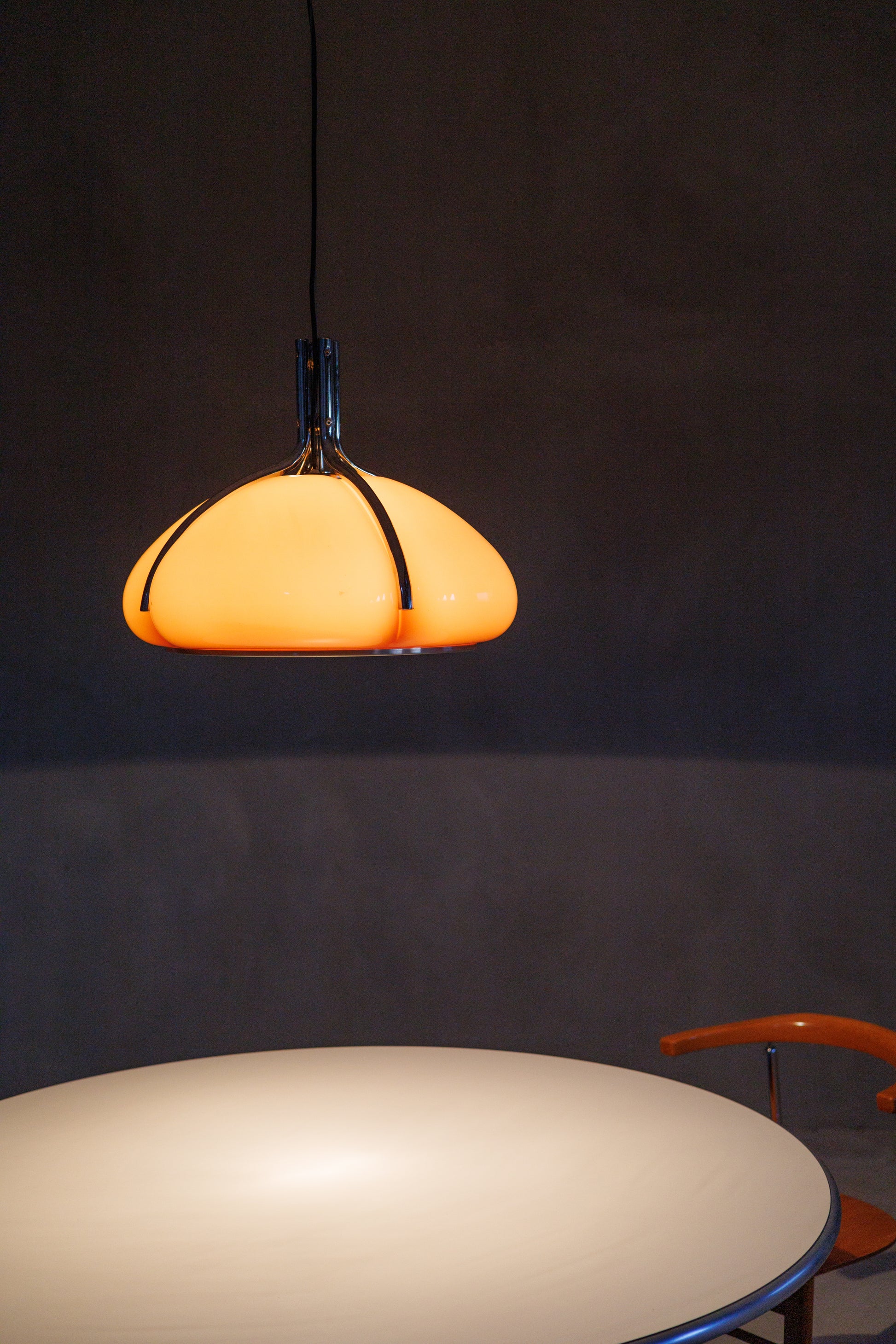 The four-leaf-clover–shaped diffuser casts a warm, atmospheric glow, making it ideal for living areas, studios, or refined mid-century interiors. The combination of the opaline acrylic shade and the sleek metal structure reflects the craftsmanship that made Guzzini a benchmark of Italian lighting design.