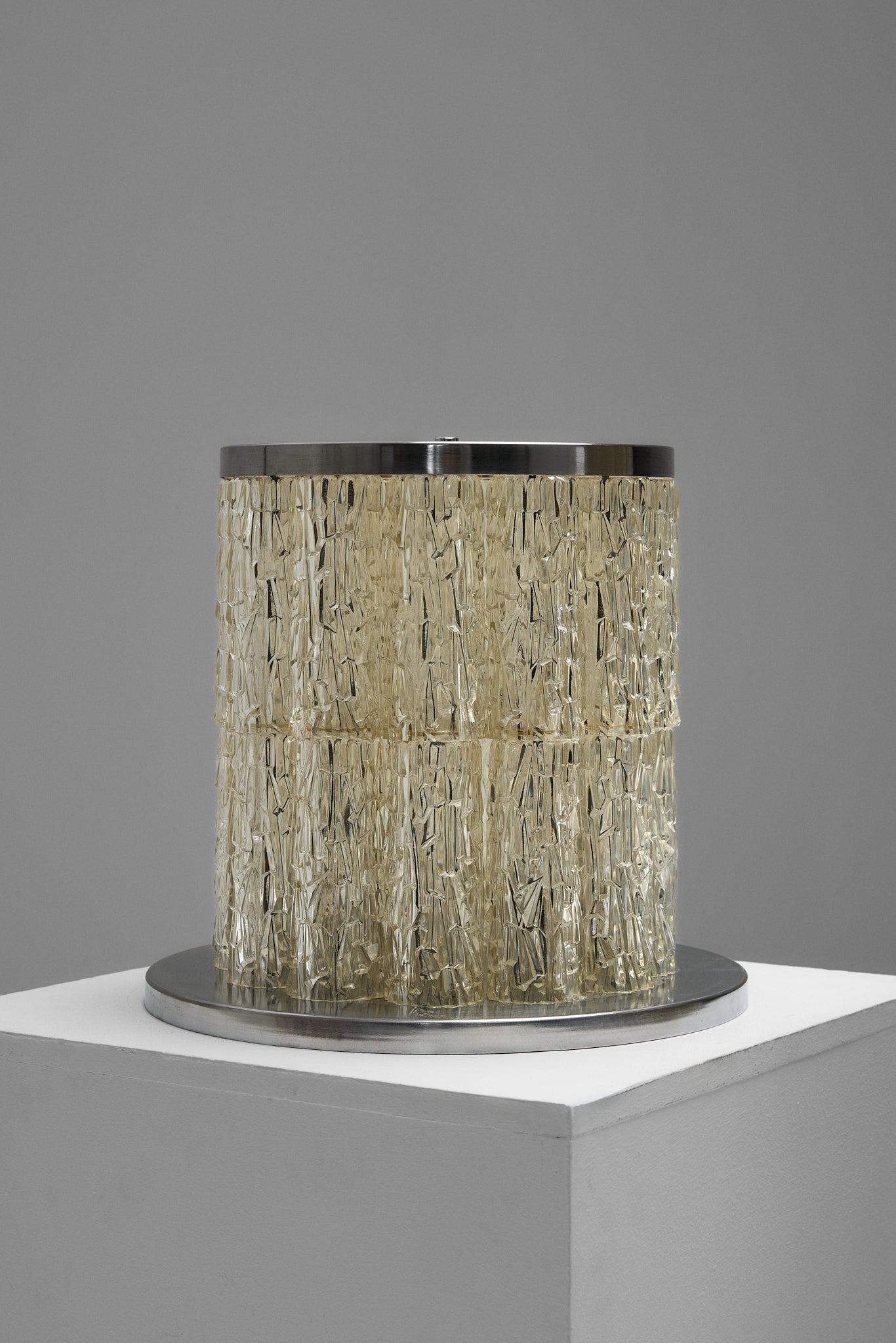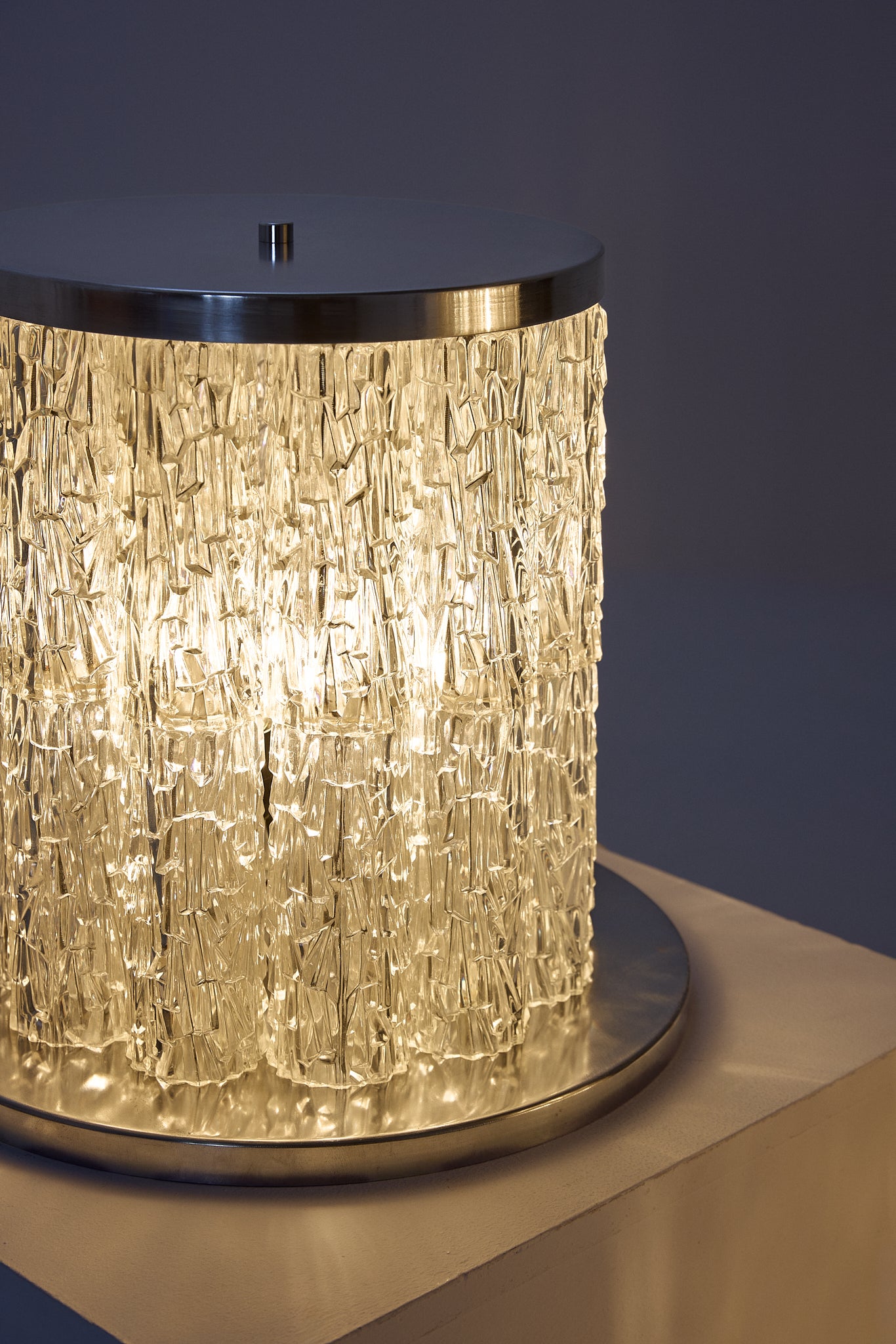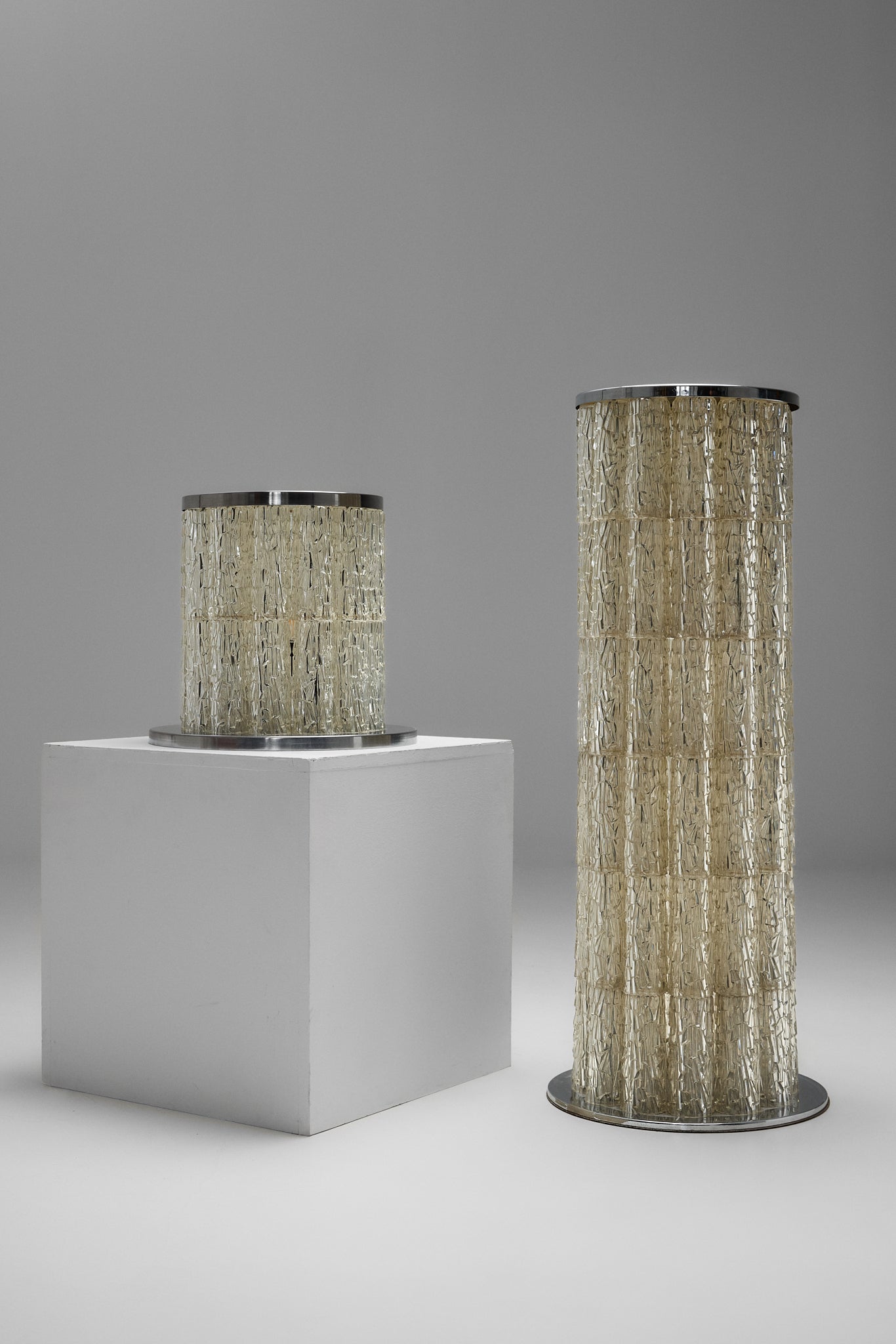 The lamp features Murano glass “tronchi” elements with a rich amber tone, each shade showcasing delicate ice-like textures that soften and diffuse the light in a warm, atmospheric glow. The glass elements pair elegantly with the lamp’s chrome top and base, creating a refined balance between mid-century luxury and modern clarity.