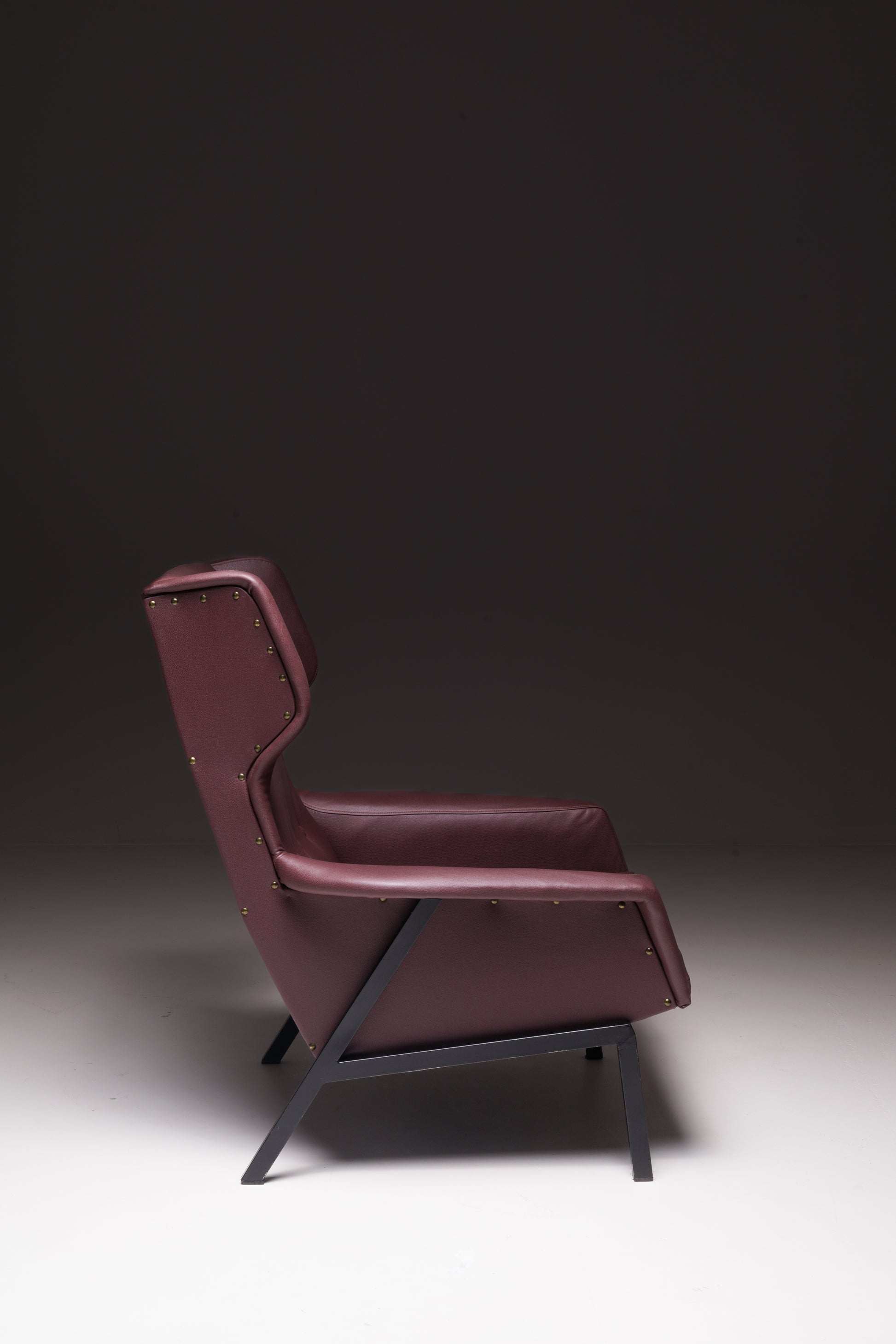 This set of 2 armchairs brings a refined blend of classic charm and modern structure. Upholstered in rich plum leather, they feature a button-tufted backrest, angular armrests, and sleek black metal legs for a bold yet sophisticated look.