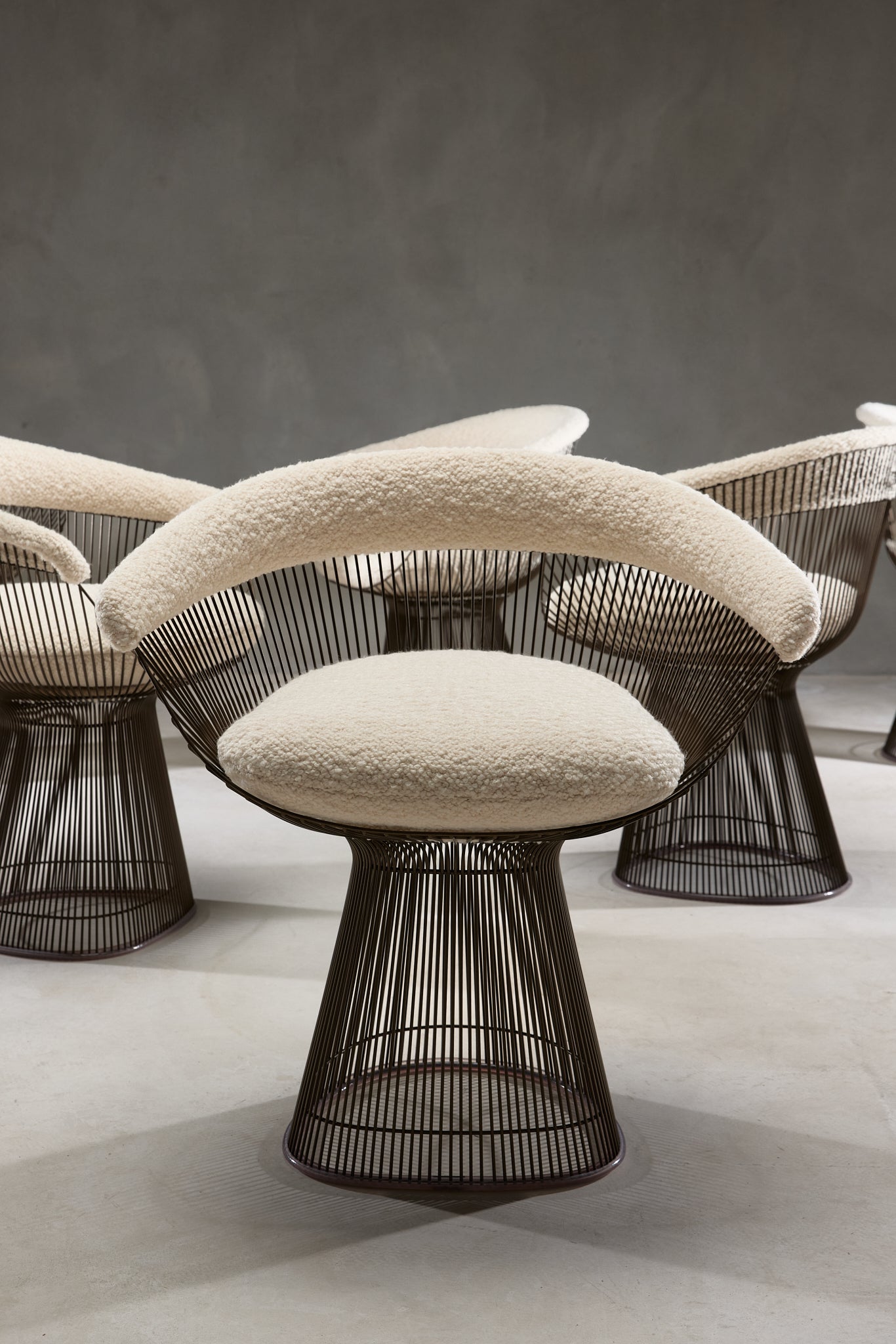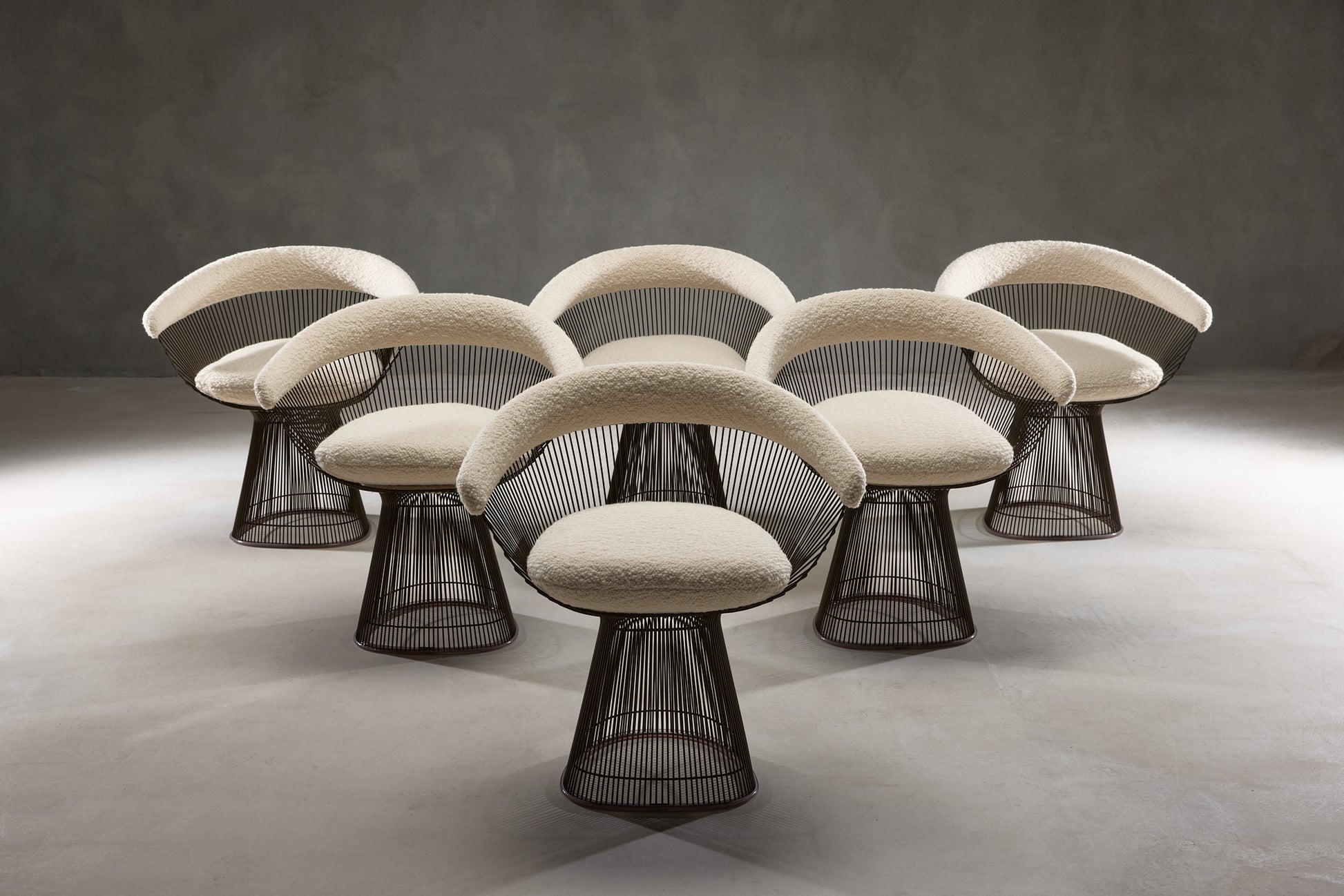 Set of Warren Platner chairs, designed in 1966 for Knoll, the crème de la crème of elegant and prestigious seating. Since their debut, Platner chairs have been instantly recognizable and celebrated worldwide, featured in major collections such as the MoMA in New York and the V&A in London. Their sculptural nickel-plated steel base and refined upholstery embody the perfect blend of modernism and grace.