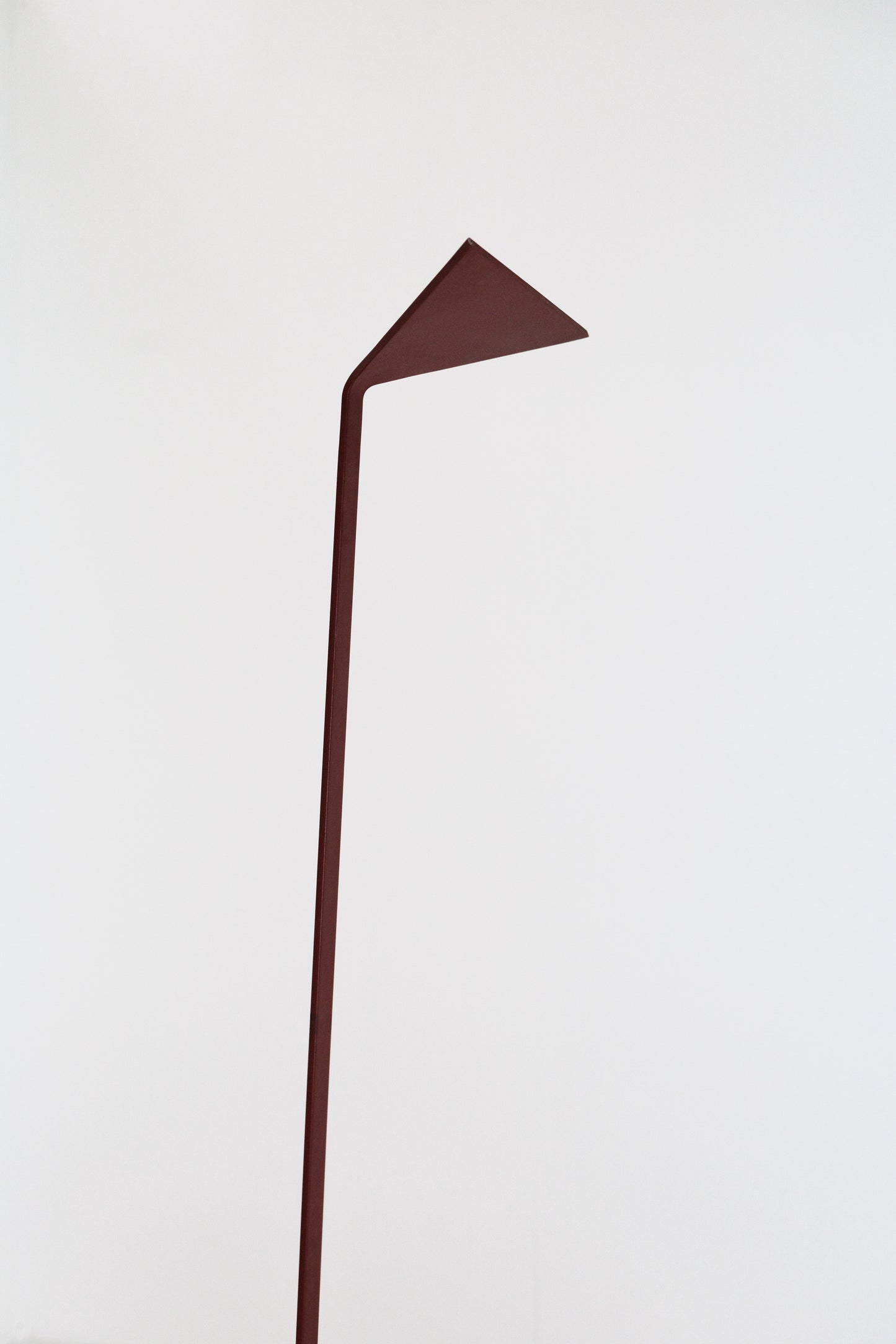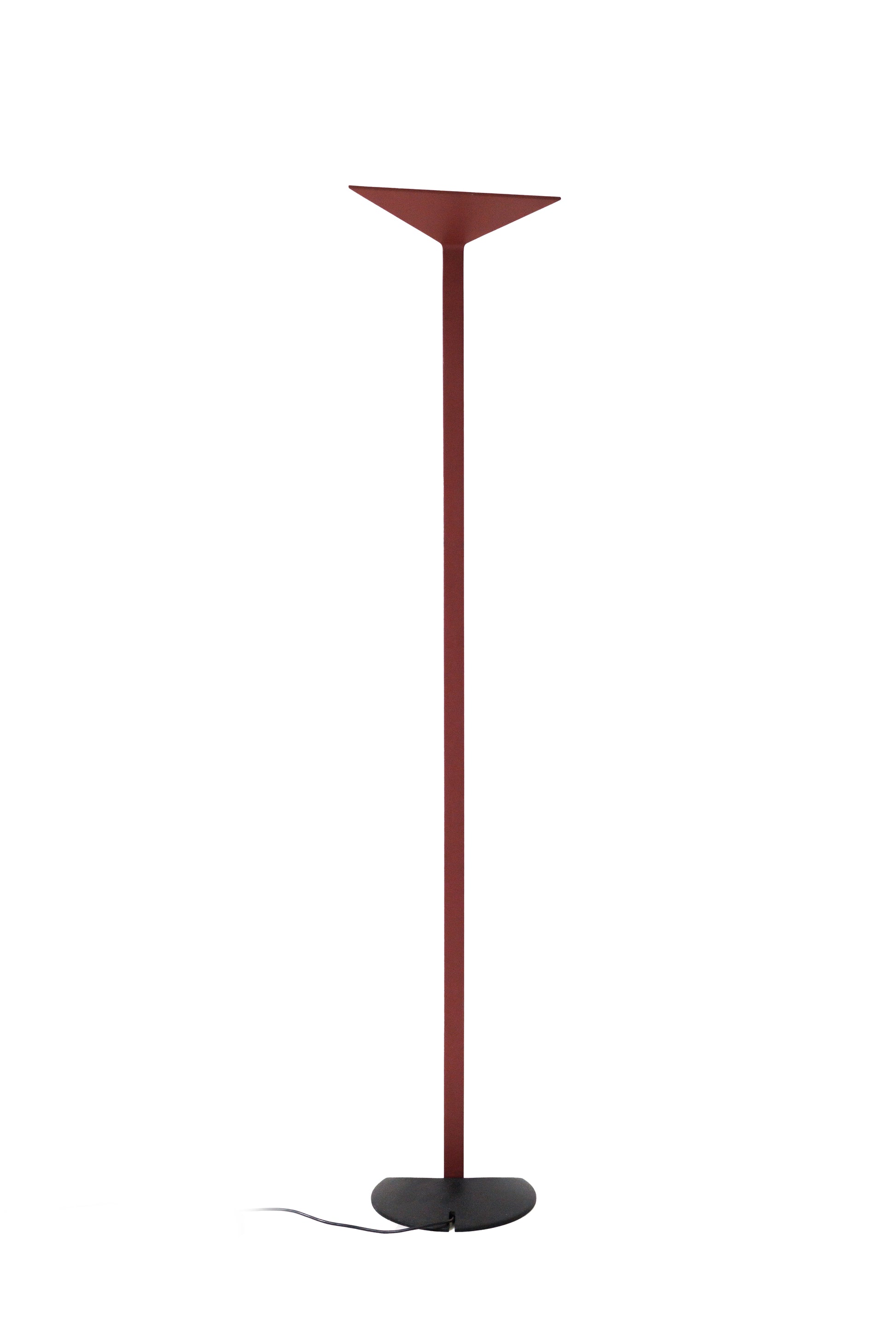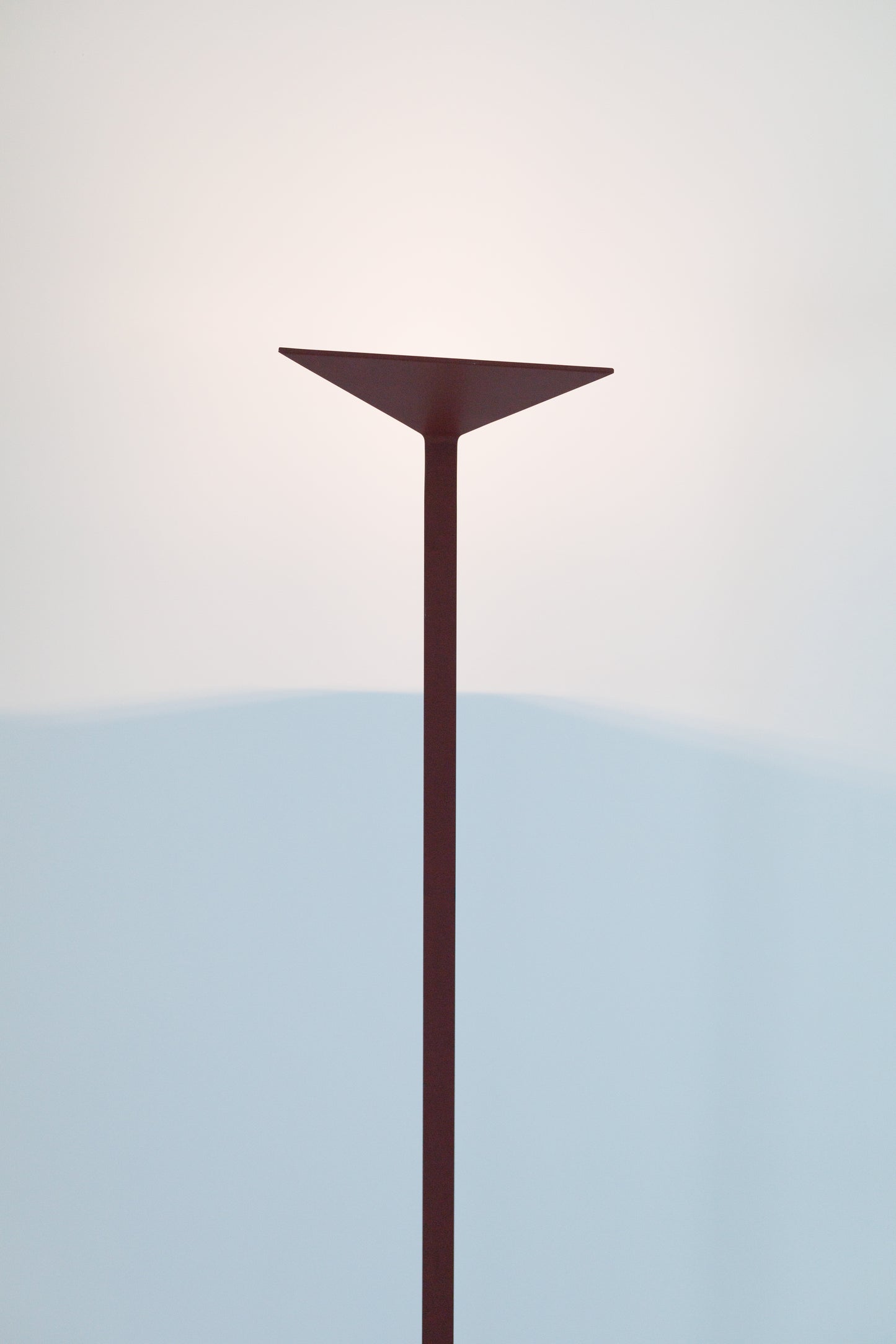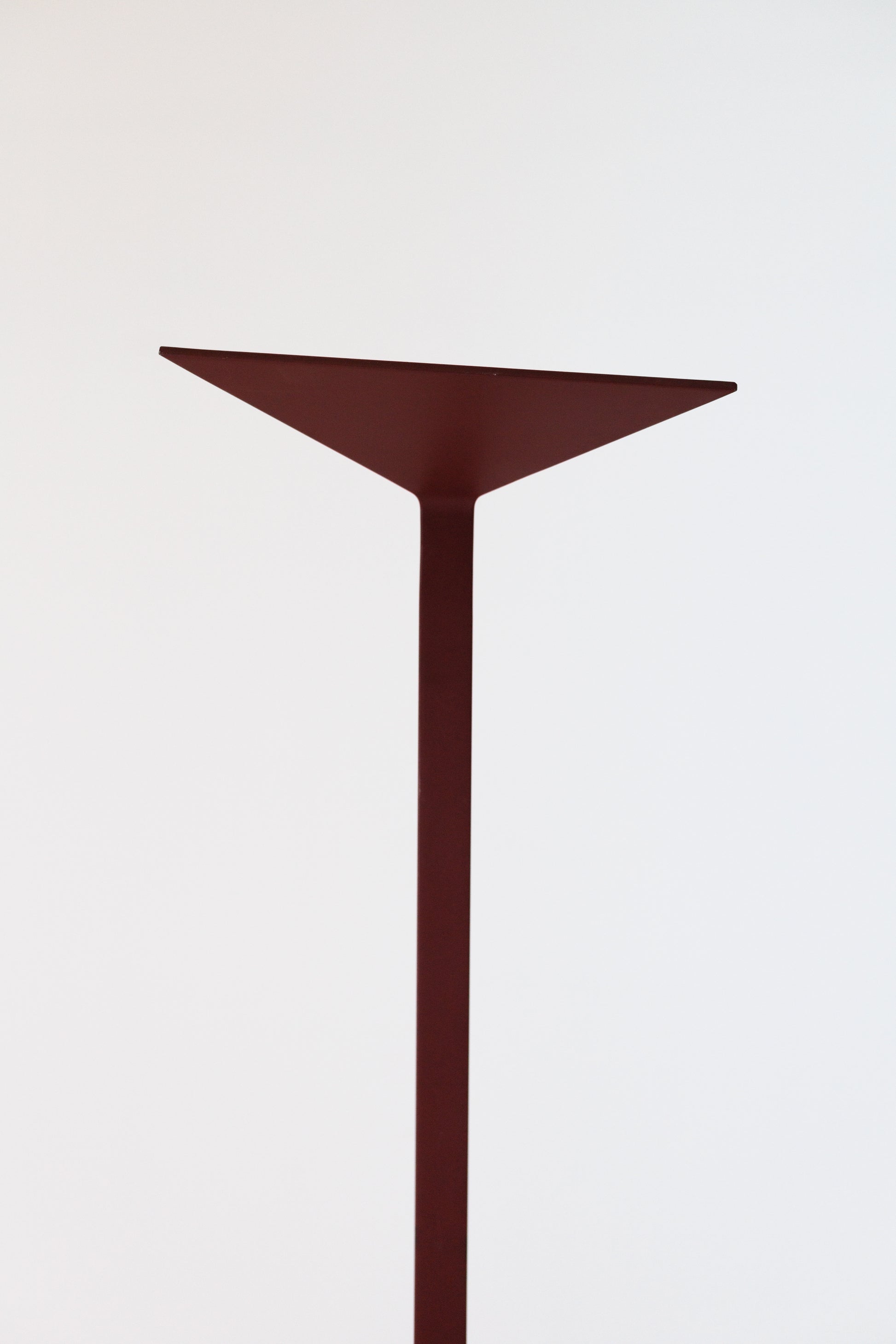 Având o siluetă elegantă, geometrică, cu o formă triunghiulară deasupra unei tije subțiri și verticale, această lampă întruchipează o estetică rafinată. Finisajul său roșu intens adaugă un ton cald oricărui interior.