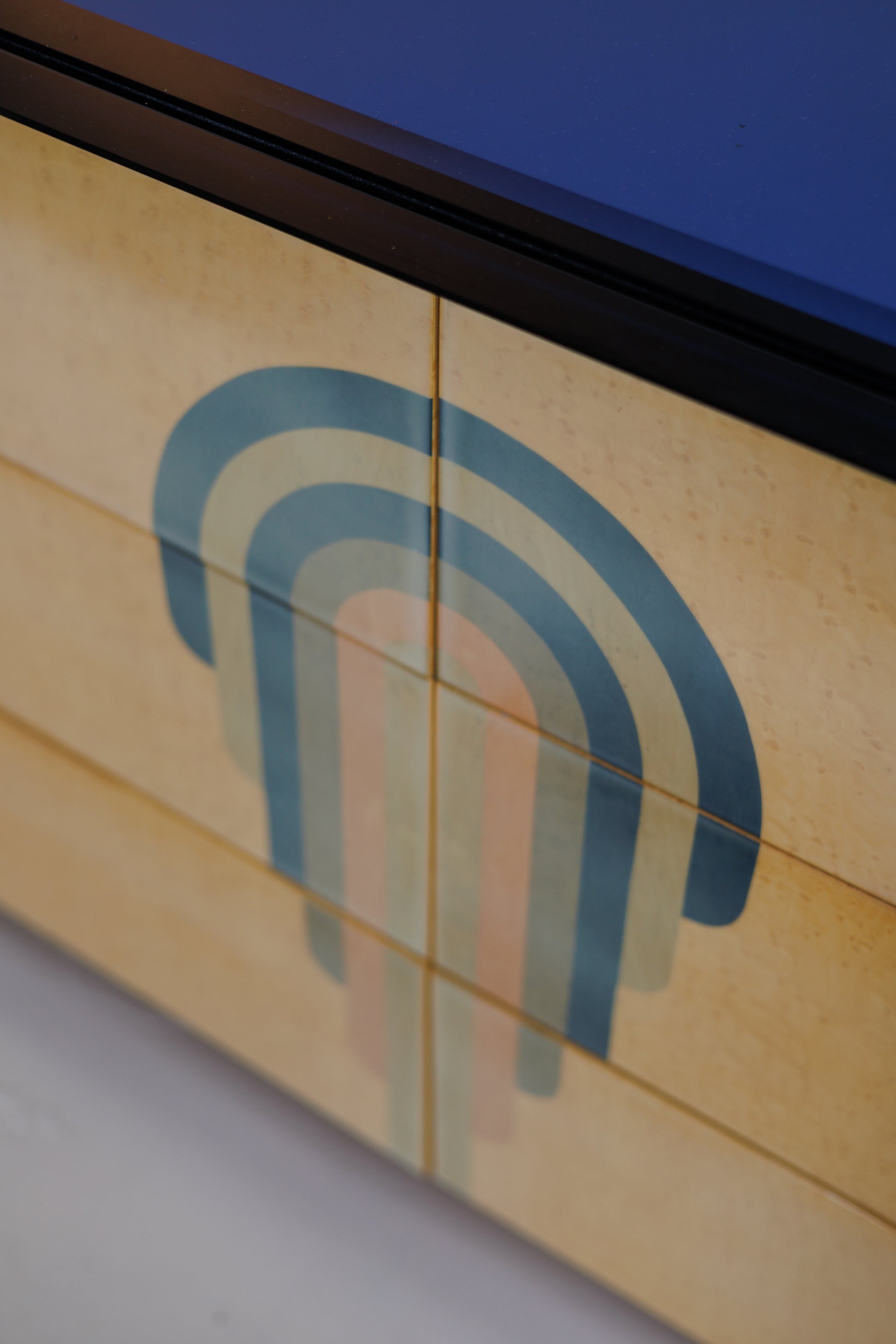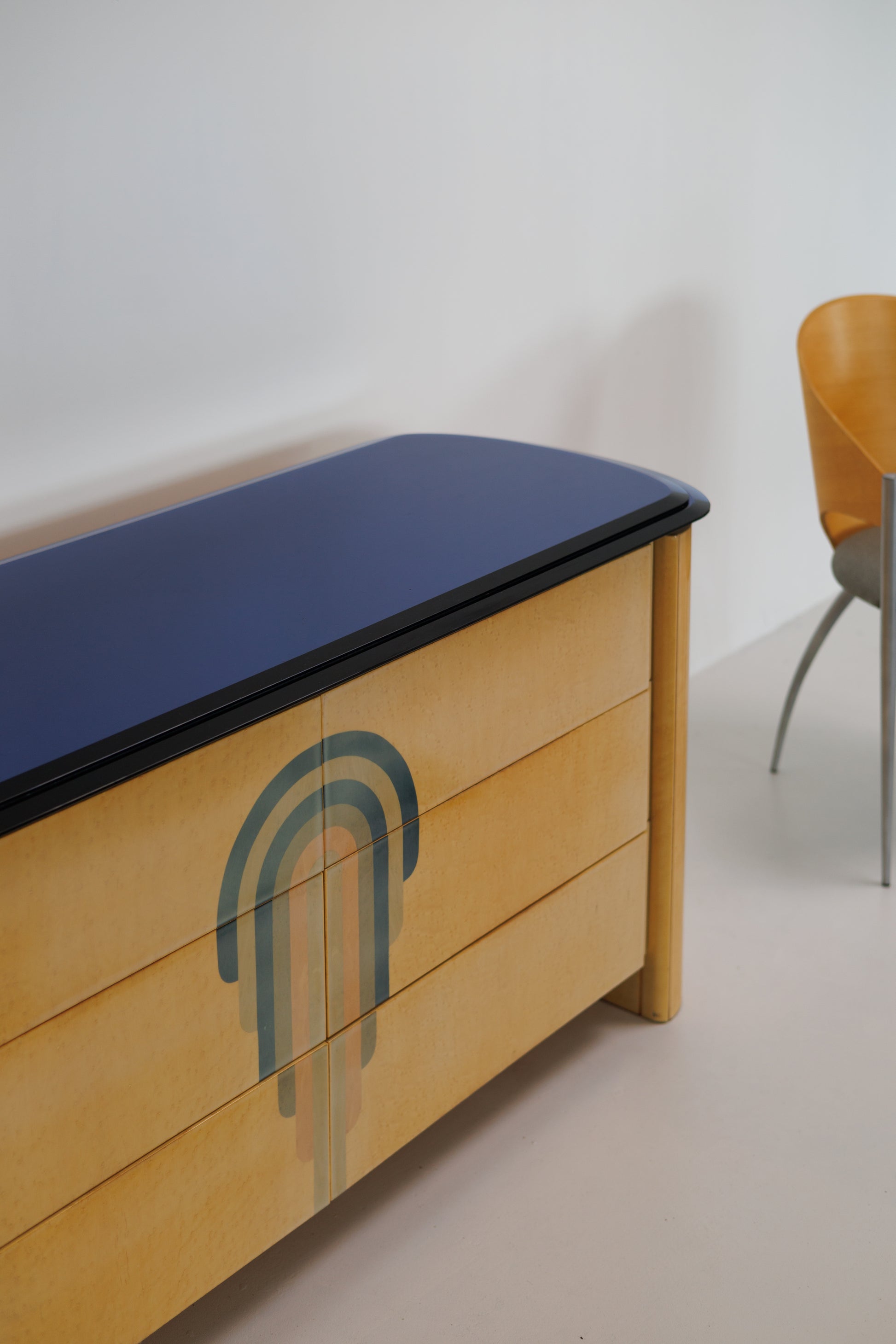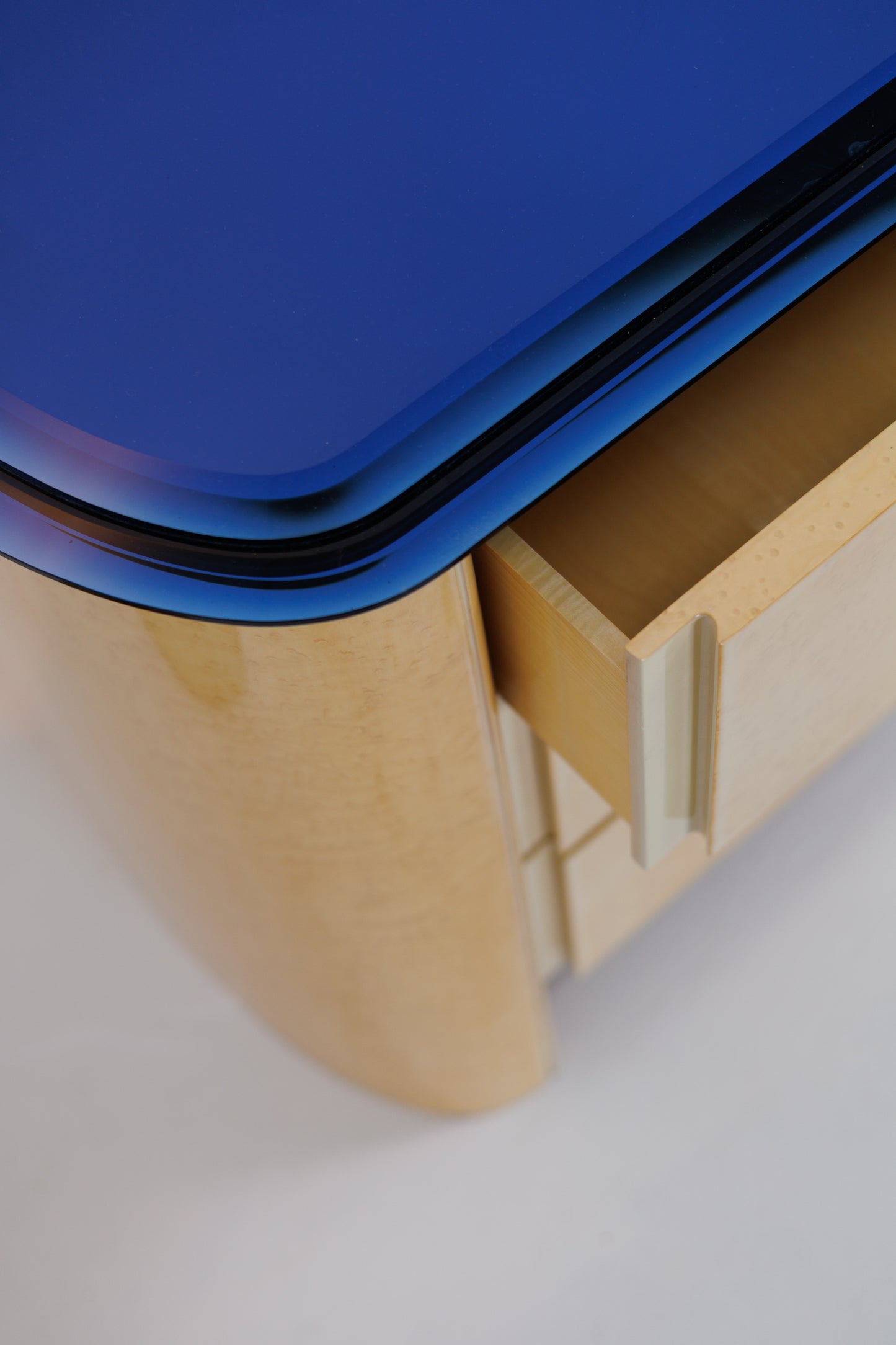 Sideboard designed by Gio Frigerio, Italian designer and founder of the Frigerio di Desio atelier—an artisanal workshop established in the 1930s that evolved into one of Italy’s most respected producers of high-end furniture. Known for combining traditional woodworking with bold, contemporary materials, Gio Frigerio’s work often explored the contrast between softness and structure. This particular piece, crafted from light-colored burlwood, features an intense blue glass top that adds striking contrast to its warm, organic finish. The clean lines, softly rounded corners, and geometric drawer motif reflect a distinct postmodern aesthetic with sculptural nuance. A rare vintage piece that captures the elegance and experimentation of Italian design at its best.