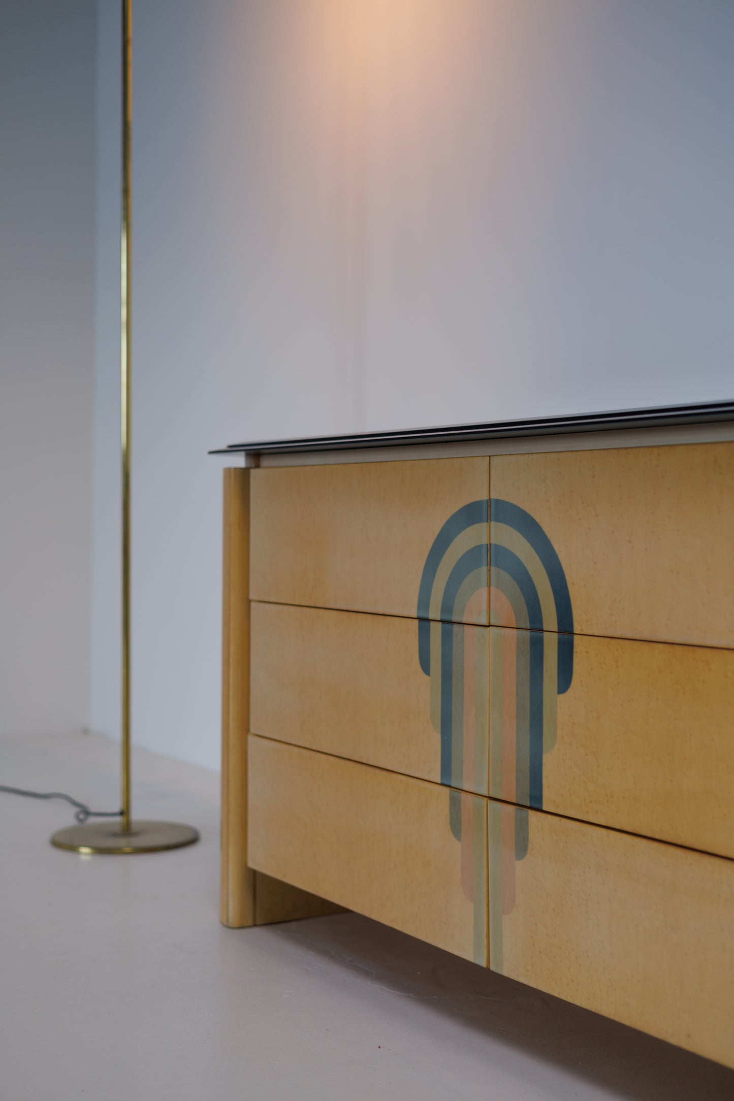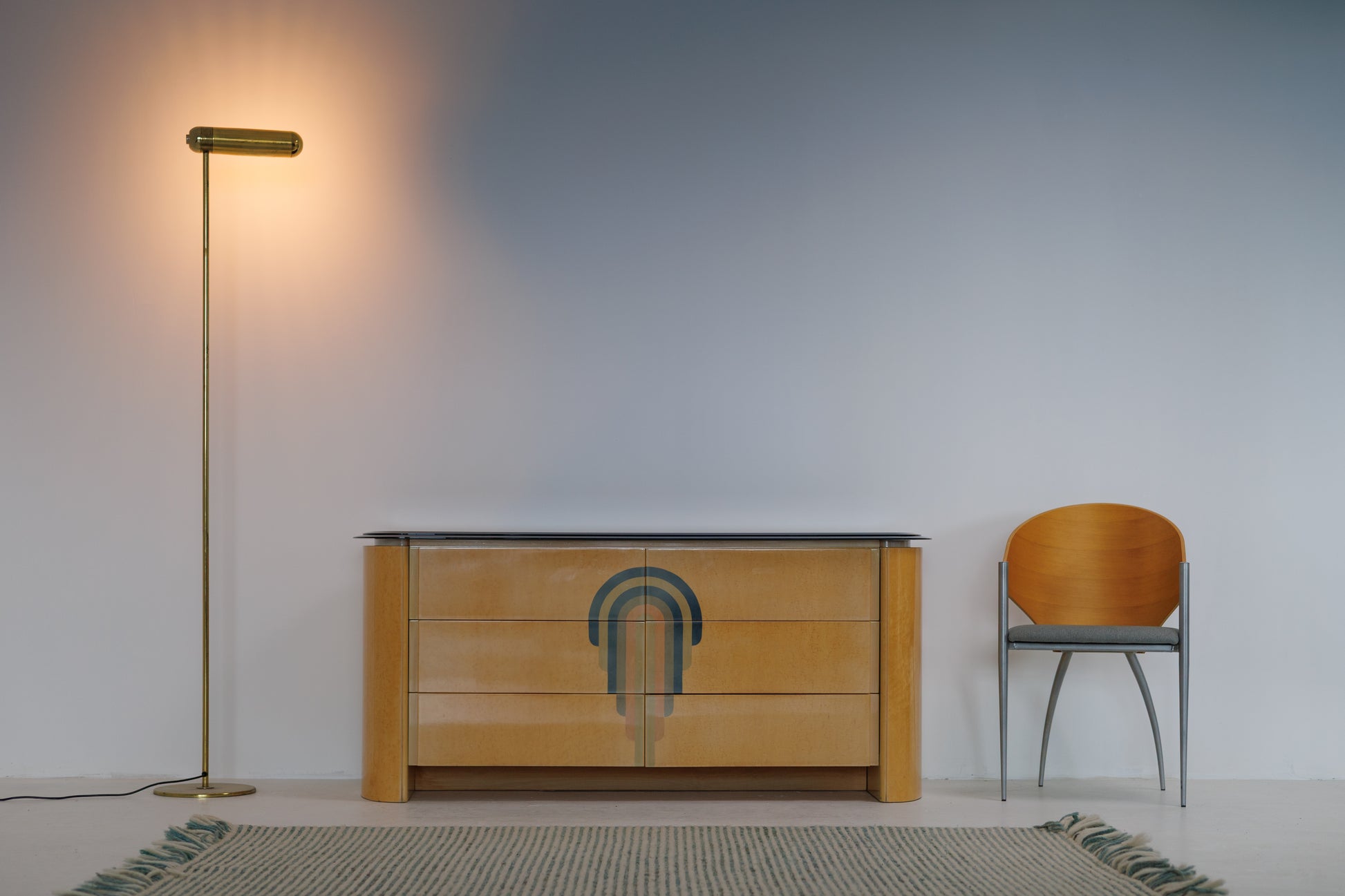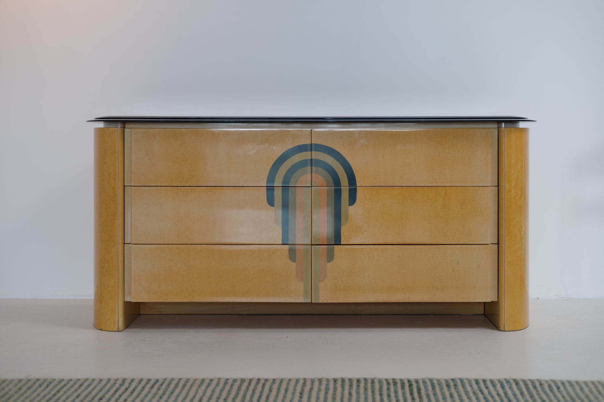 Sideboard designed by Gio Frigerio, Italian designer and founder of the Frigerio di Desio atelier—an artisanal workshop established in the 1930s that evolved into one of Italy’s most respected producers of high-end furniture. Known for combining traditional woodworking with bold, contemporary materials, Gio Frigerio’s work often explored the contrast between softness and structure. This particular piece, crafted from light-colored burlwood, features an intense blue glass top that adds striking contrast to its warm, organic finish. The clean lines, softly rounded corners, and geometric drawer motif reflect a distinct postmodern aesthetic with sculptural nuance. A rare vintage piece that captures the elegance and experimentation of Italian design at its best.
