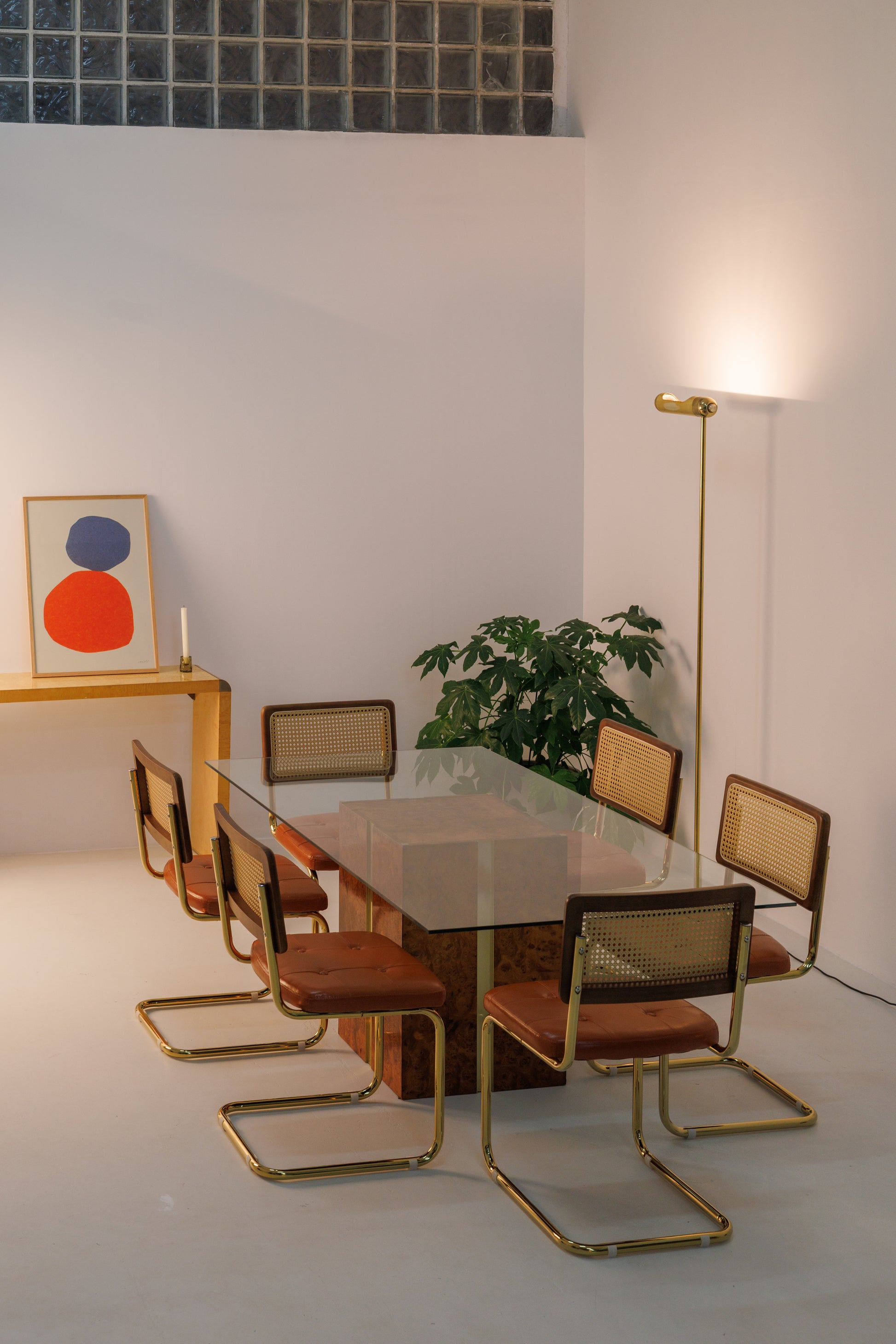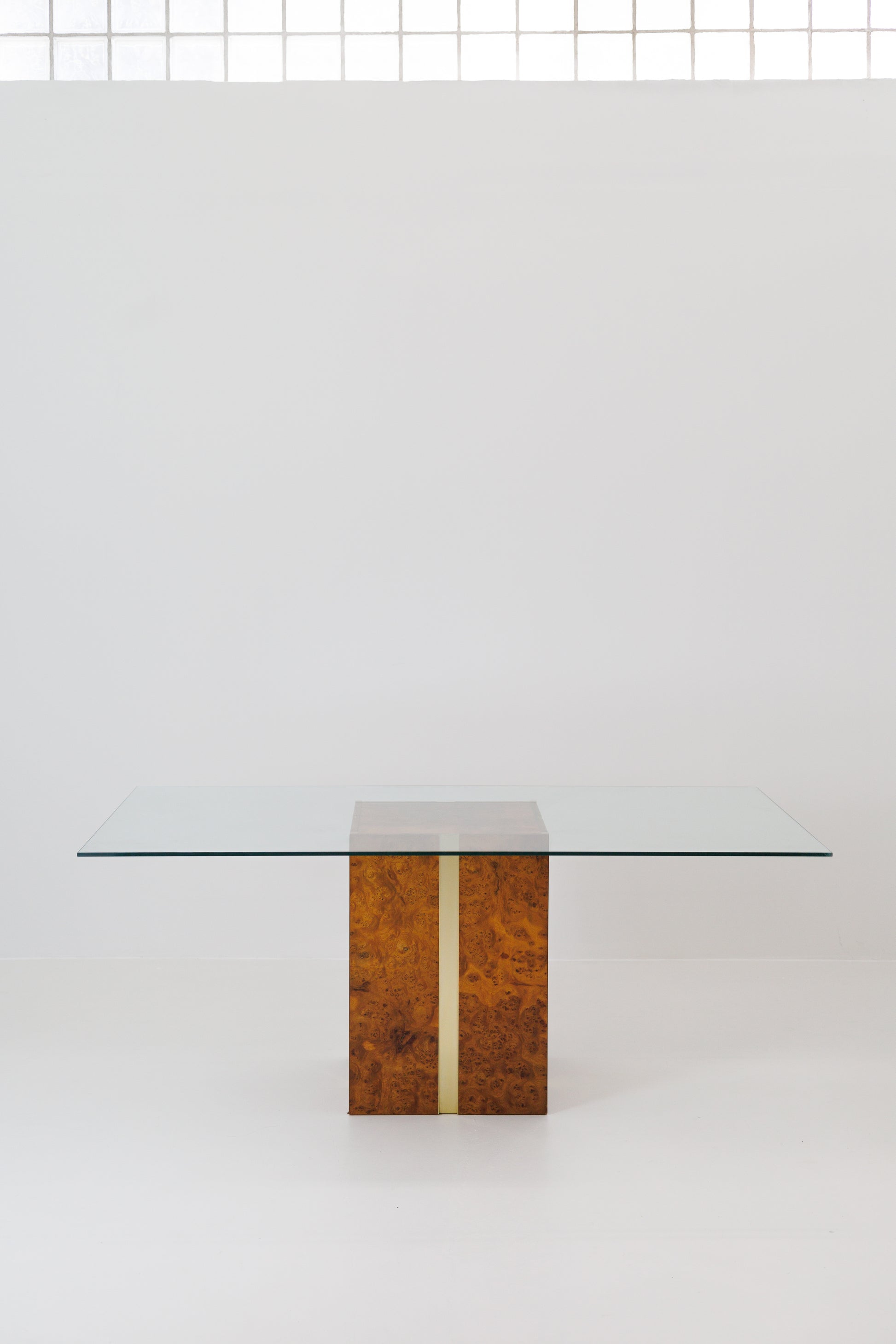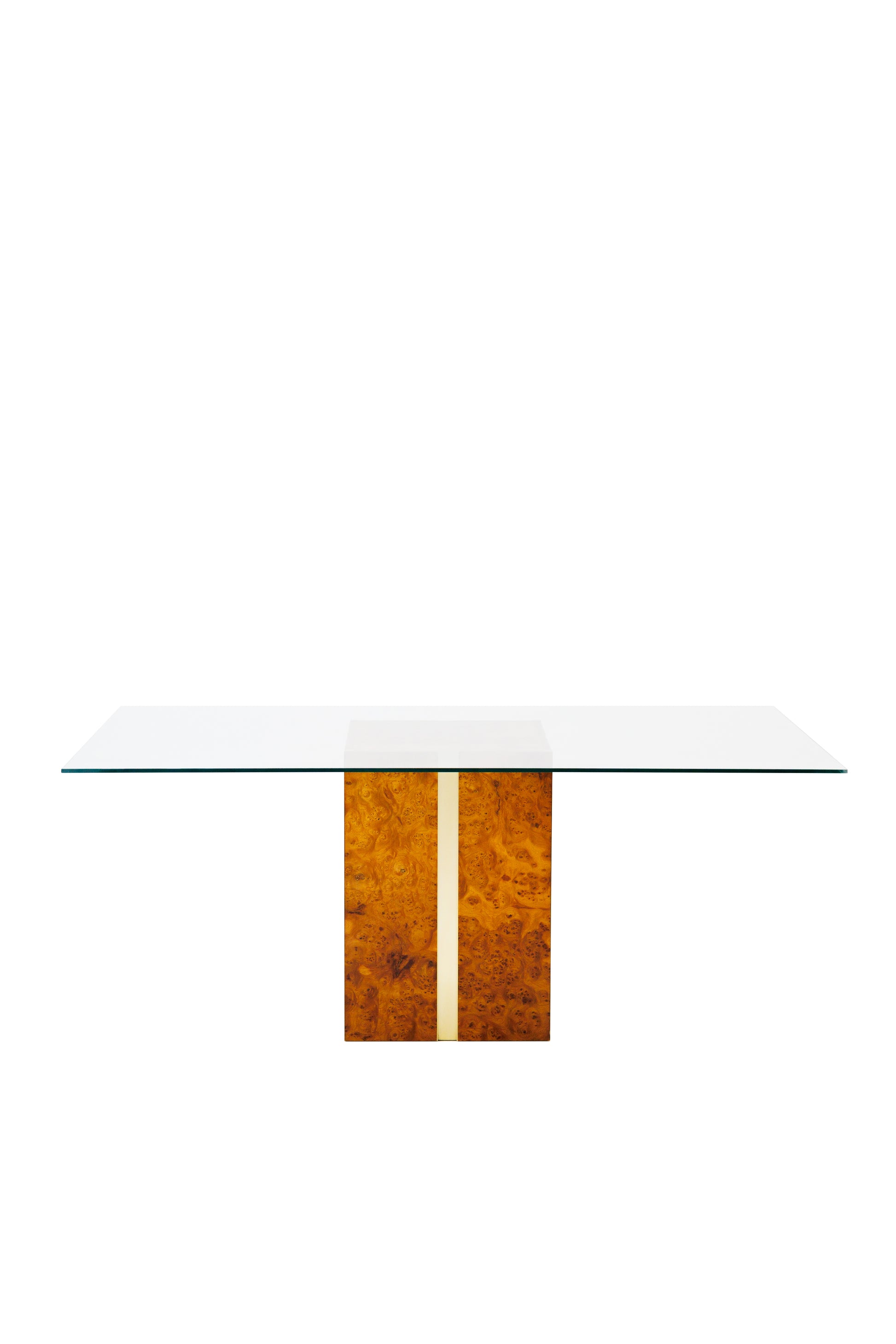 Masa elegantă Roche Bobois are o bază realizată din lemn de rădăcină decorat cu un detaliu rafinat din alamă.