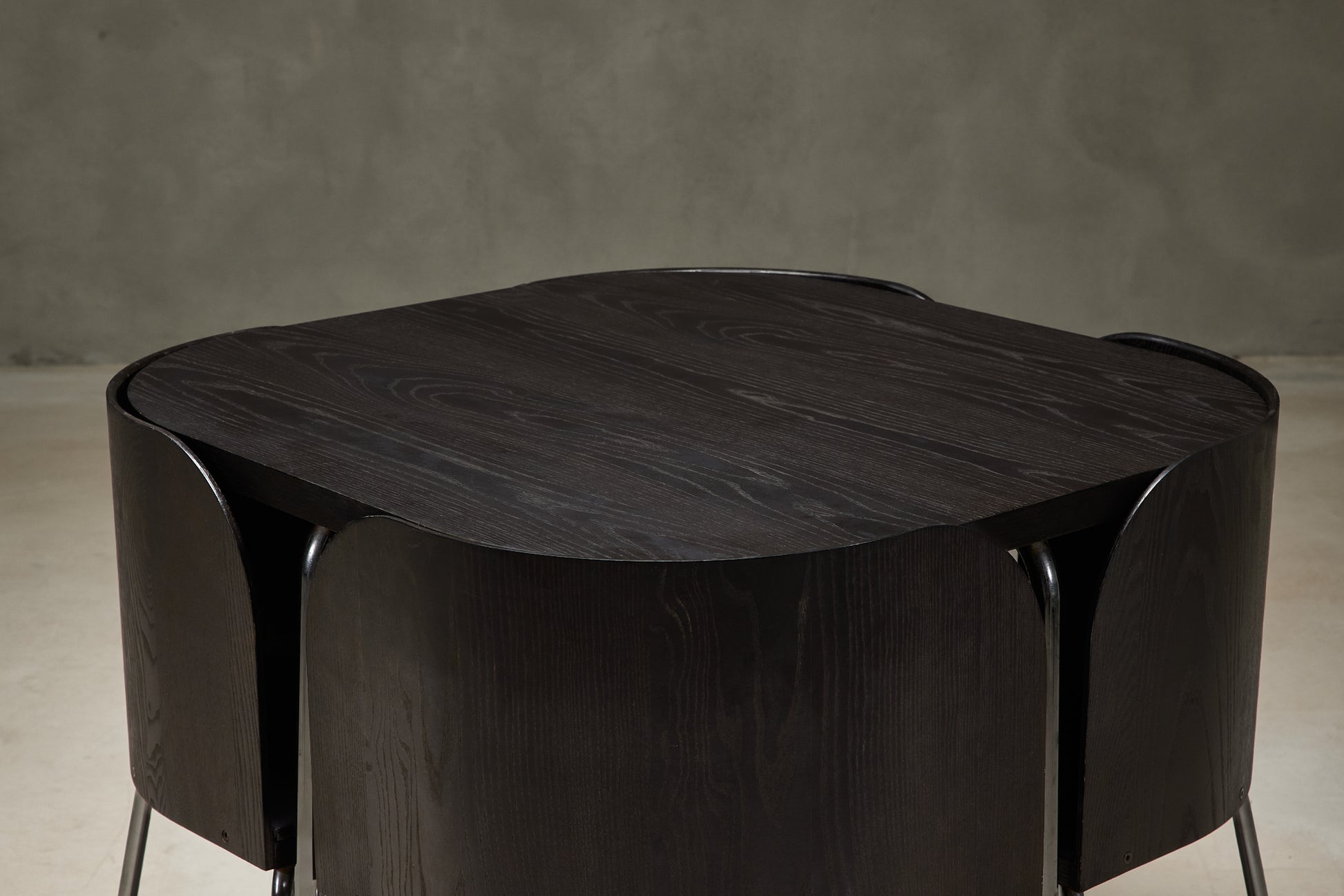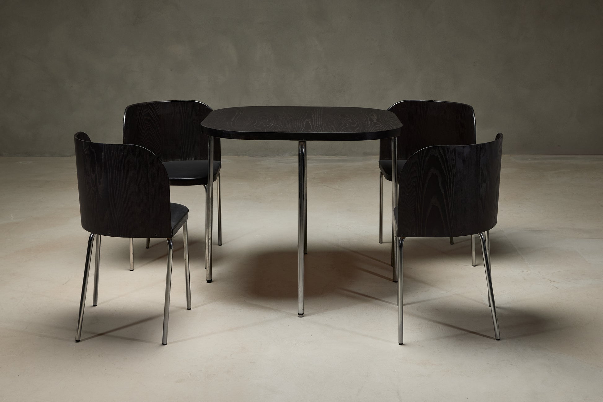 A rare vintage IKEA dining set featuring a sleek, sculptural table paired with matching chairs in black-stained wood and chrome legs. This design perfectly reflects IKEA’s late-80s to early-90s era — when the brand explored more architectural silhouettes, expressive curves, and durable materials.