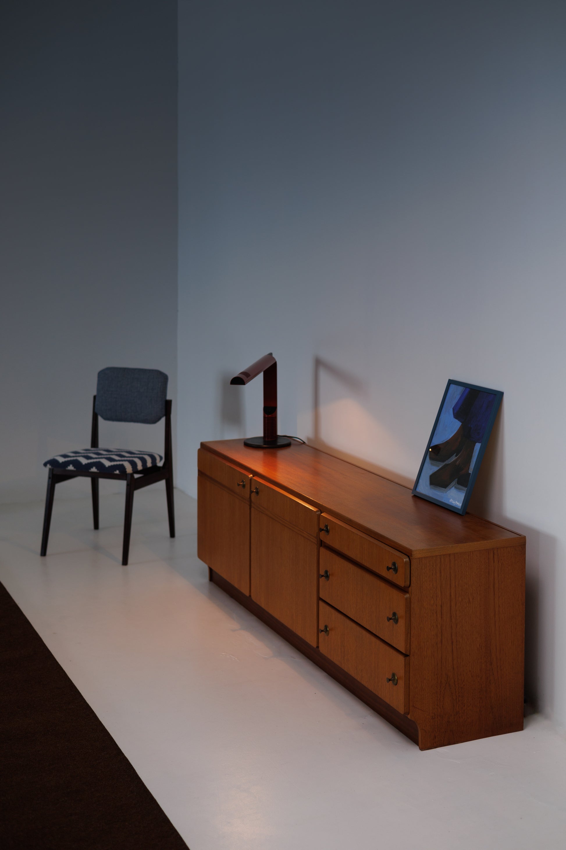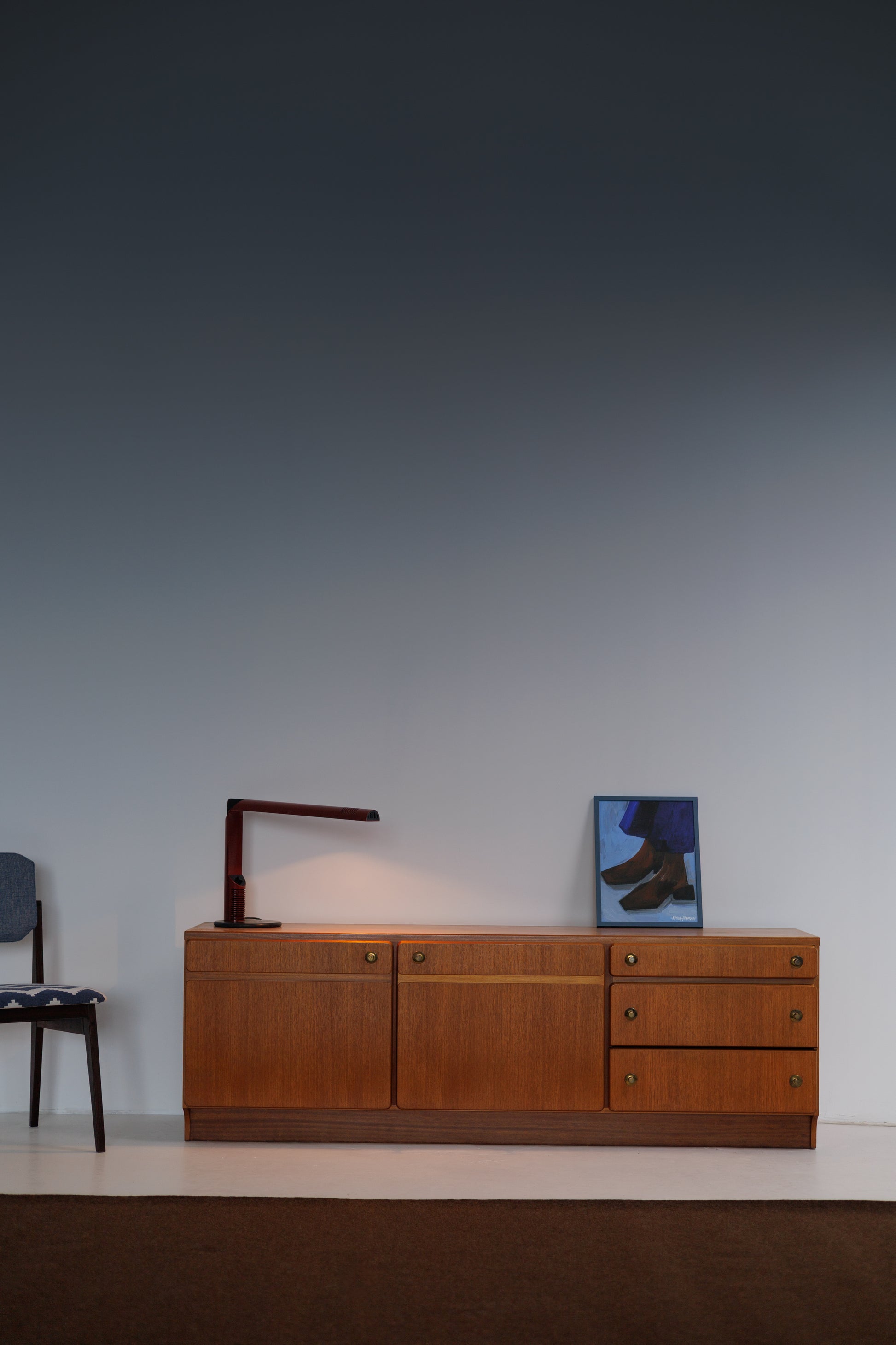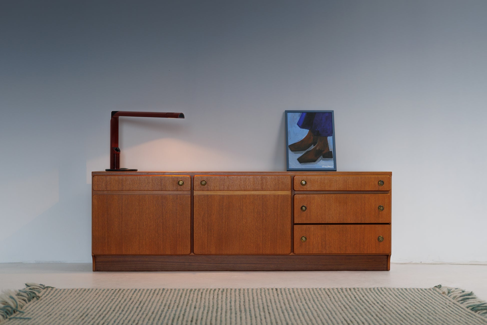 Sideboard manufactured by A.H. McIntosh & Co., a renowned Scottish company celebrated for its elegant and functional mid-century furniture. This piece showcases the brand’s signature craftsmanship, with clean, minimalist lines, warm teak wood, and distinctive rounded brass handles that add subtle character. The layout features two large cabinets and a column of drawers, offering both versatility and generous storage—ideal for dining or living spaces. The plinth base in a darker tone adds grounding contrast, highlighting the refined proportions. A timeless vintage classic from one of the most respected names in British modern design.