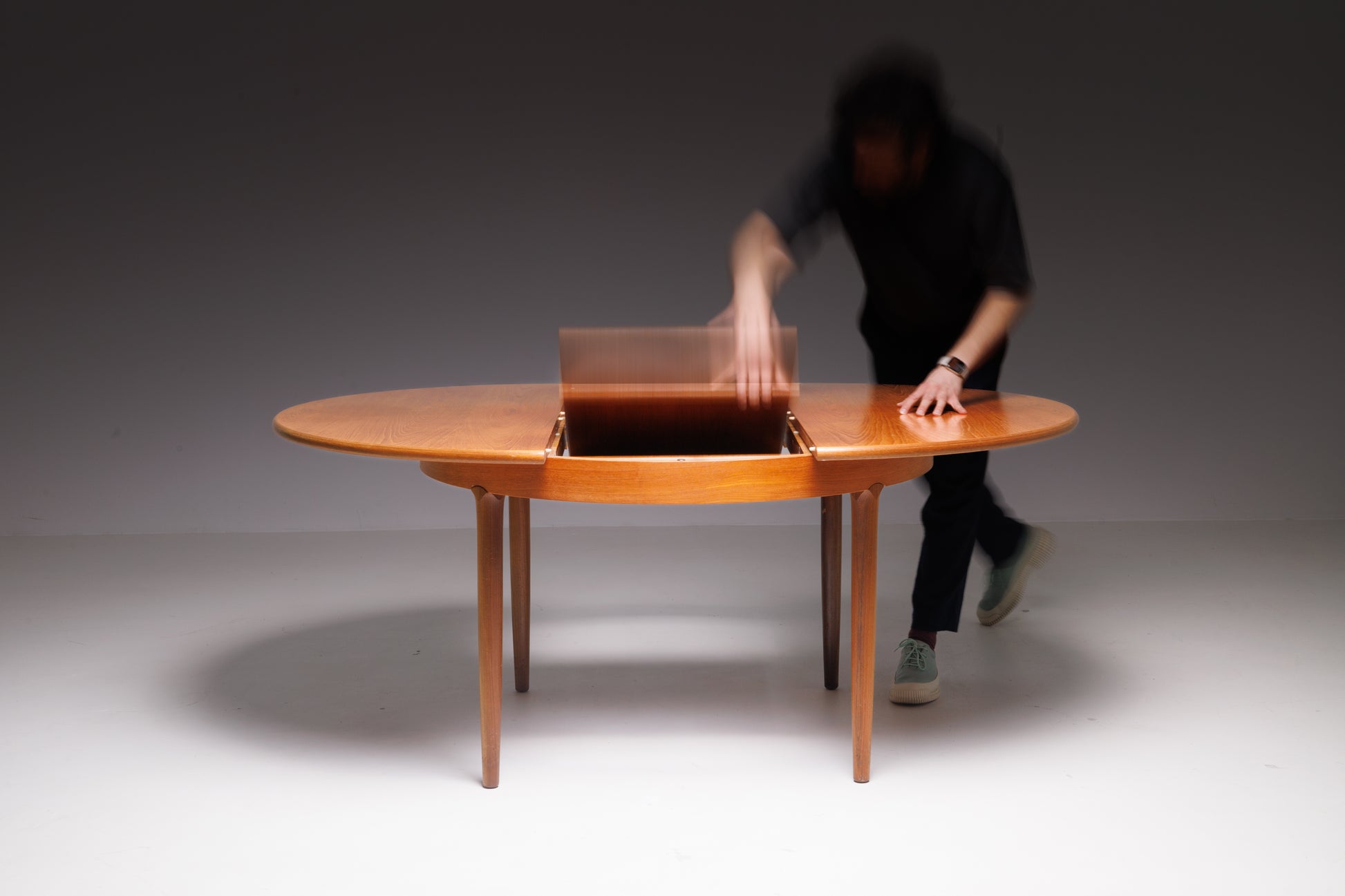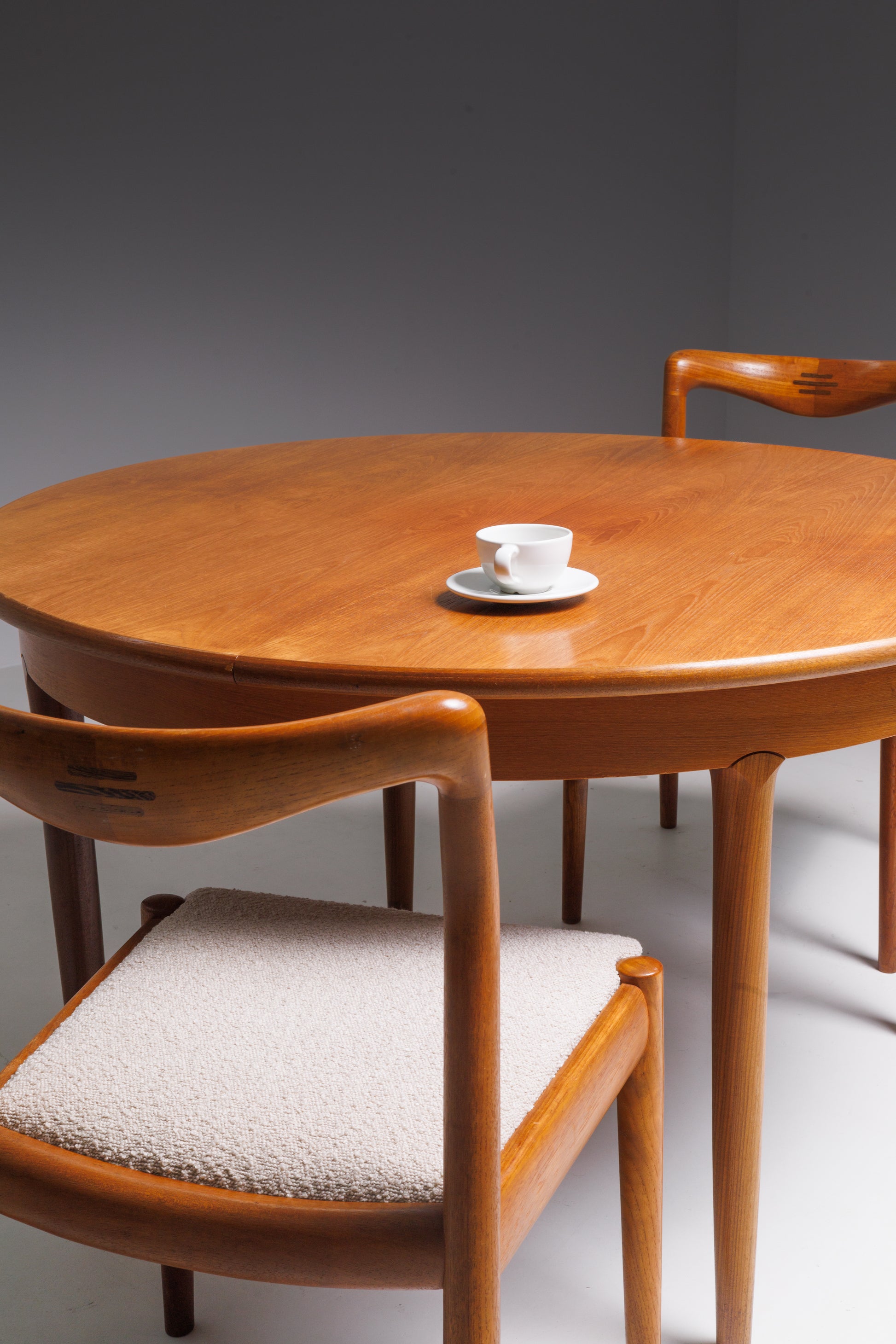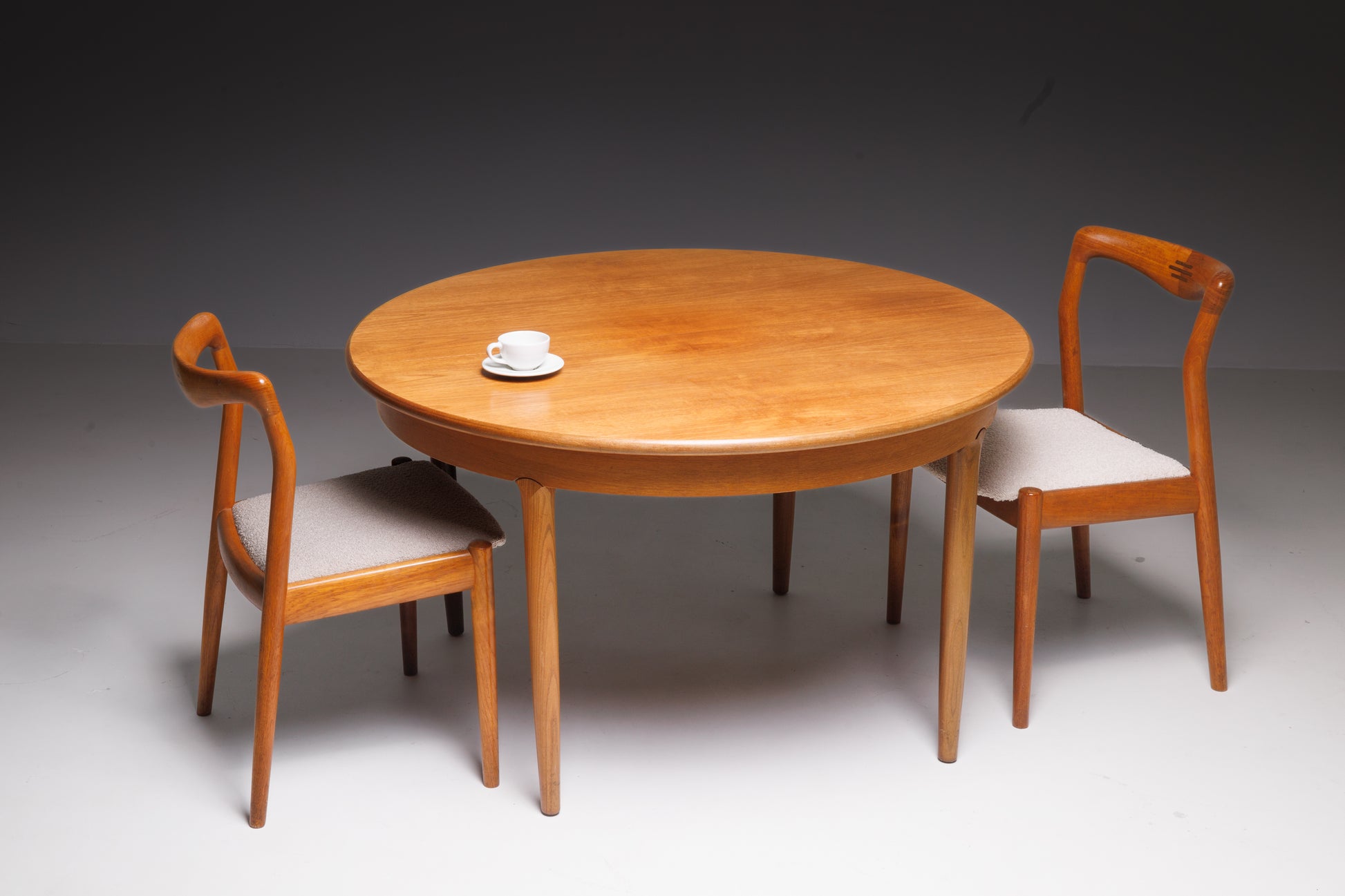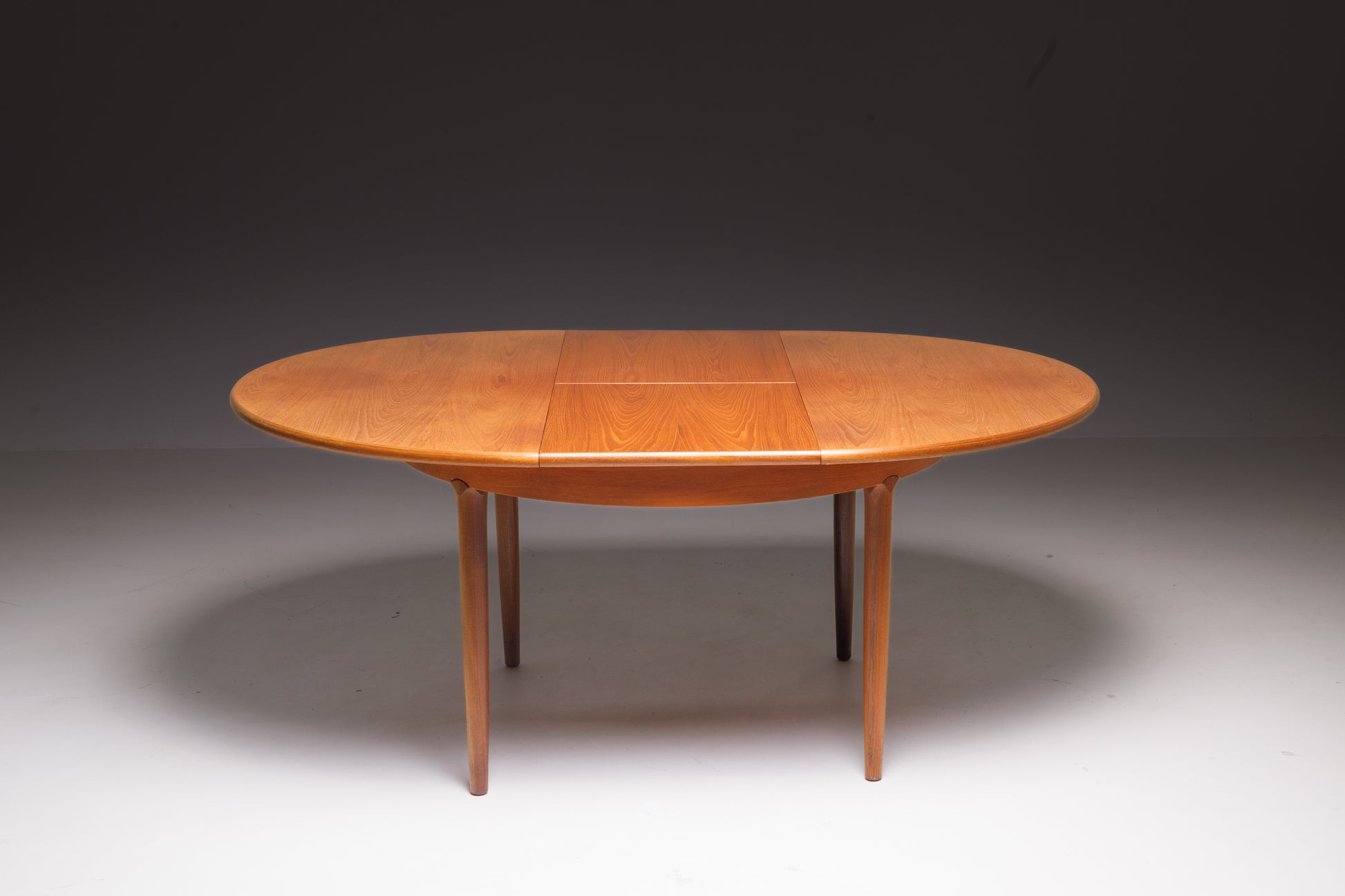 Vintage Mid-Century Teak Extendable Dining Table – Elegant round teak dining table with an extendable design, featuring a seamless central leaf that expands the surface for additional seating. The warm teak wood grain and gently tapered legs showcase classic Scandinavian craftsmanship.