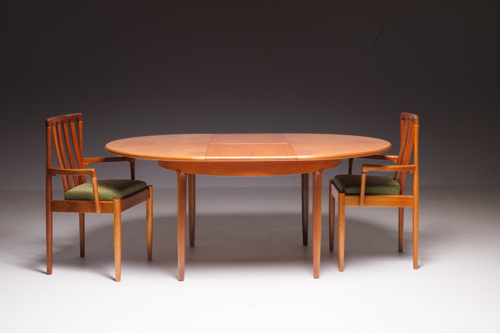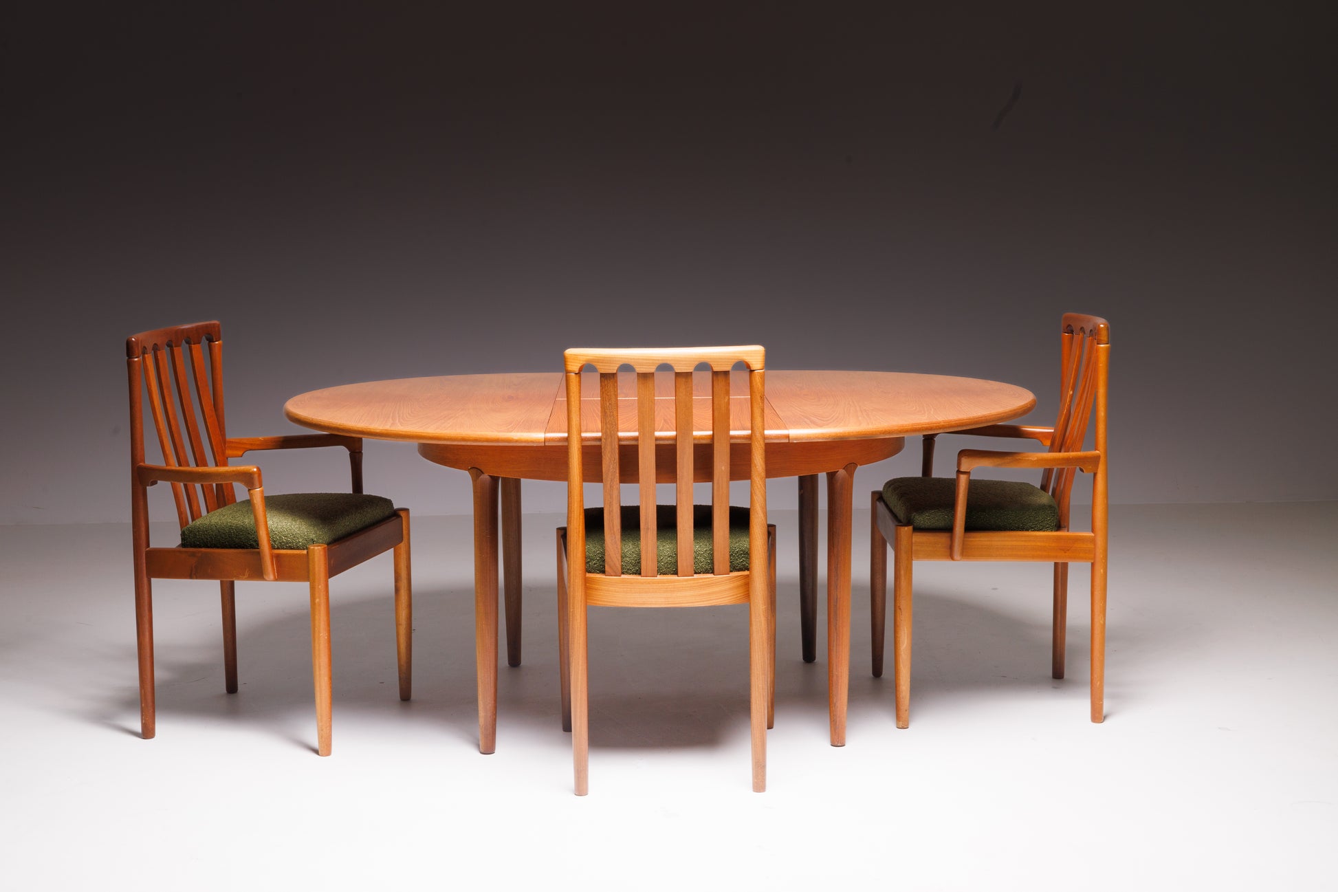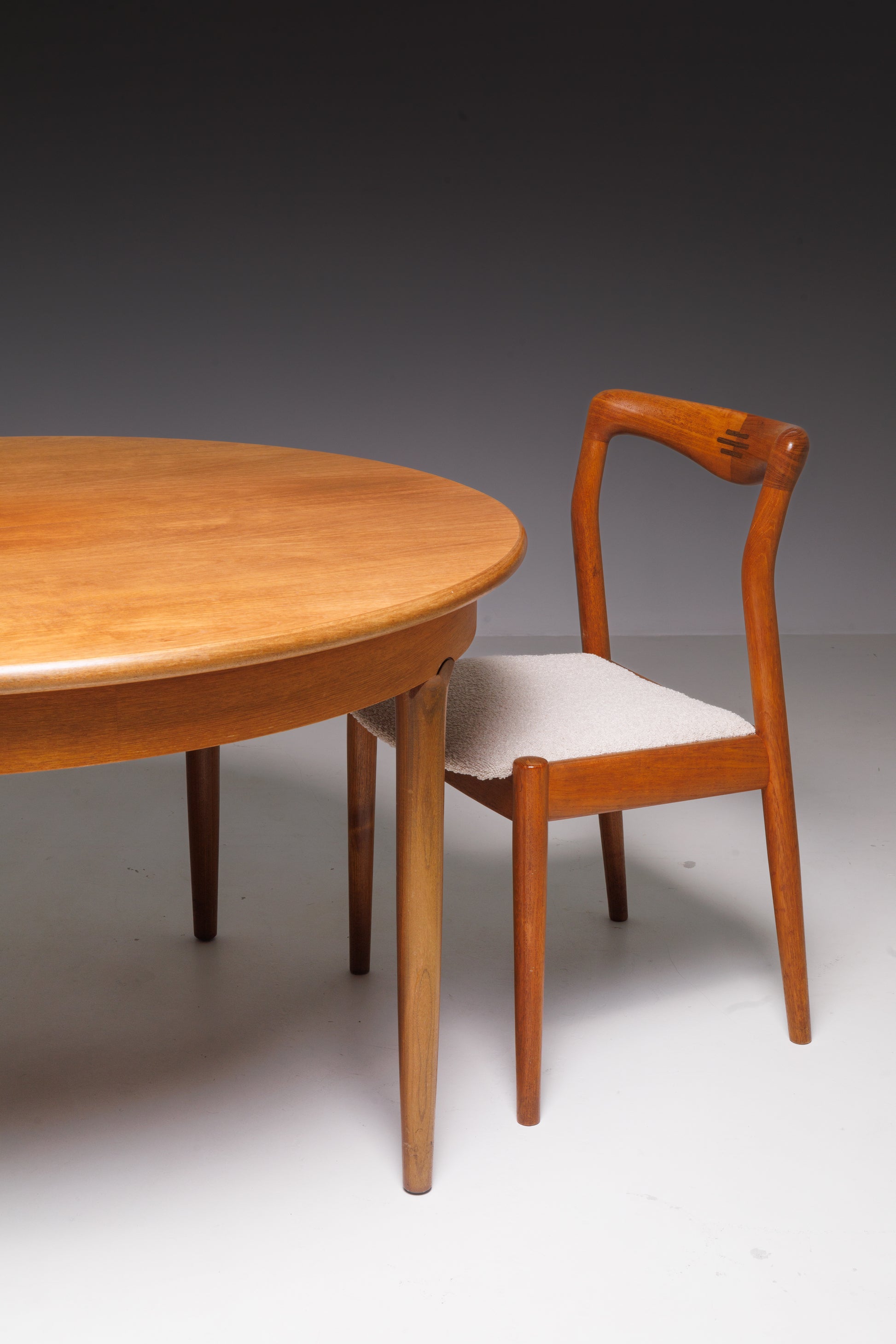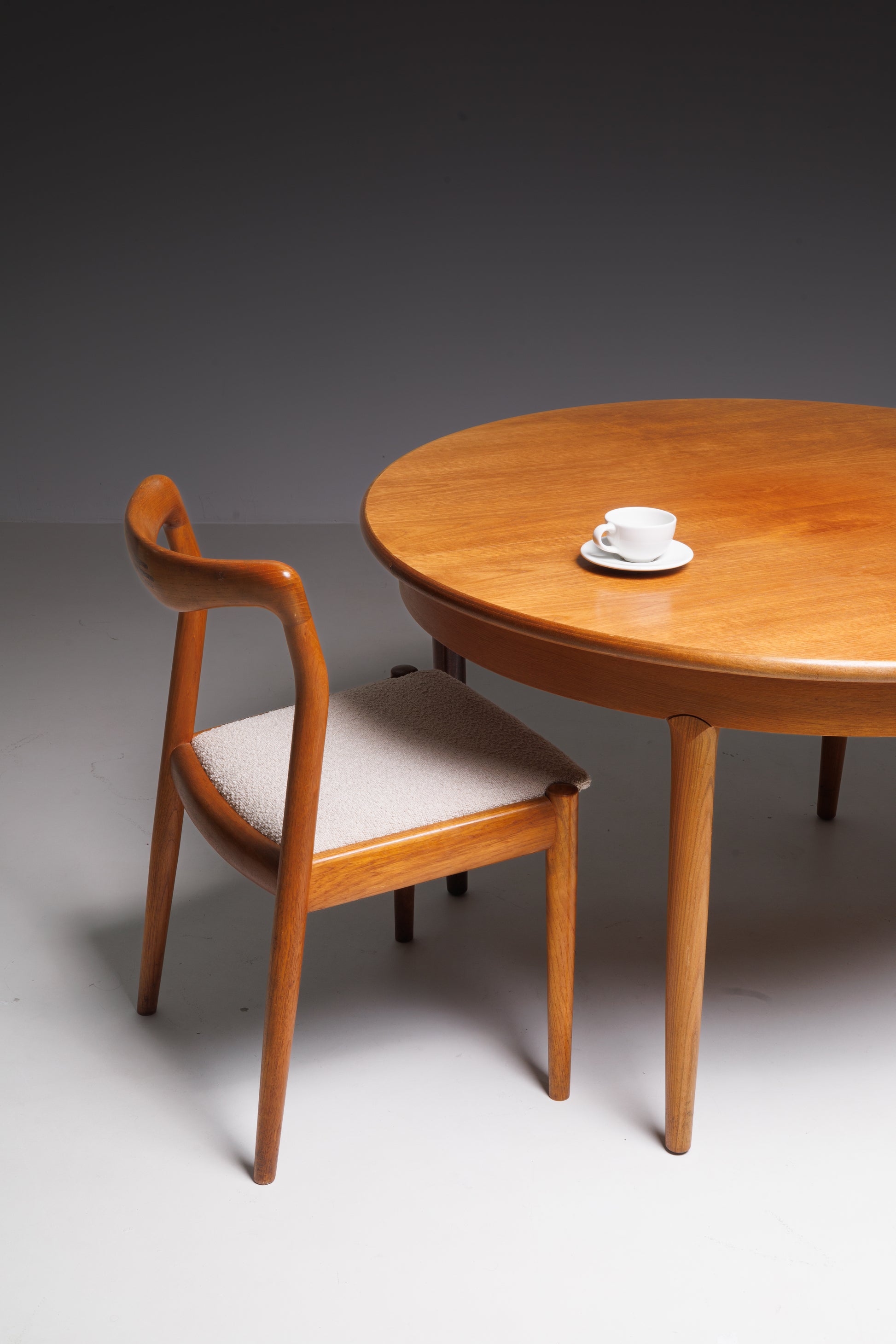Vintage Mid-Century Teak Extendable Dining Table – Elegant round teak dining table with an extendable design, featuring a seamless central leaf that expands the surface for additional seating. The warm teak wood grain and gently tapered legs showcase classic Scandinavian craftsmanship.