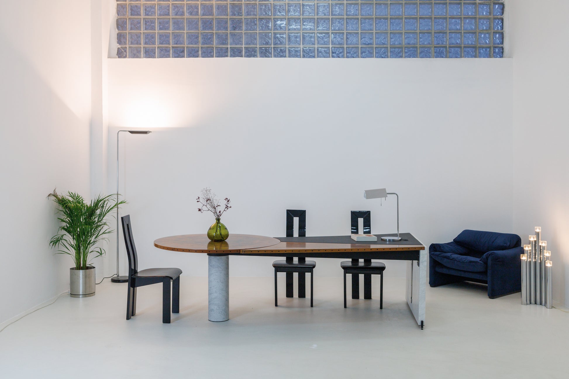 Aceasta este o capodoperă de design cu dublă funcționalitate: birou și masă de dining. A fost restaurată meticulos pentru a-i reda eleganța originală, fiecare detaliu fiind atent îngrijit, de la retapițarea pielii și refinisarea furnirului de lemn până la recondiționarea bazei de marmură.